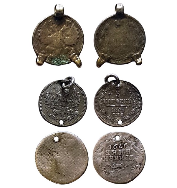 Следы ушка-колечка (или двух-трех) снижают показатель состояния на один-полтора балла, например, от EF+ до VF или VF—. Следы от ушка, охватывающего монетный кружок, как зажим, с двух сторон, еще губительнее. В зависимости от количества ушек, оценка состояния монеты в состоянии EF+ снижается до F и даже F—.