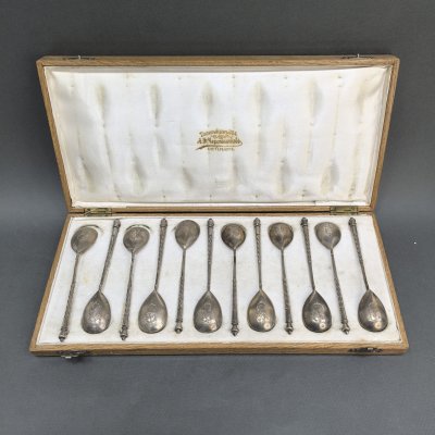 Набор старинных серебряных ложек для чая, в антикварном кофре, 84 пр. пробирный мастер Соколов М.Ф.