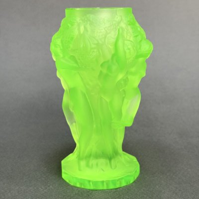 Ваза Вакханки в стиле Артдеко из зеленого уранового стекла дизайн 1930г. Г. Хоффманн Чехия 21 в