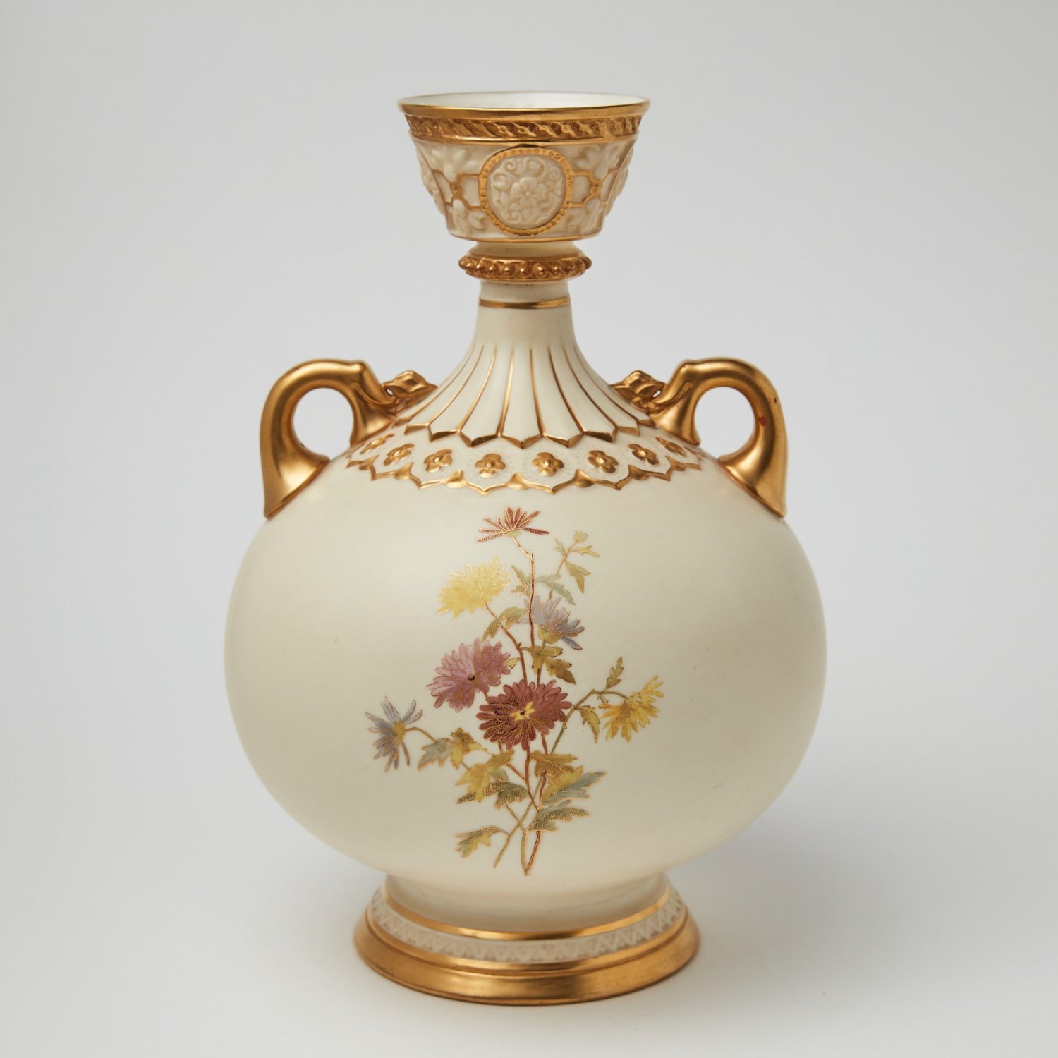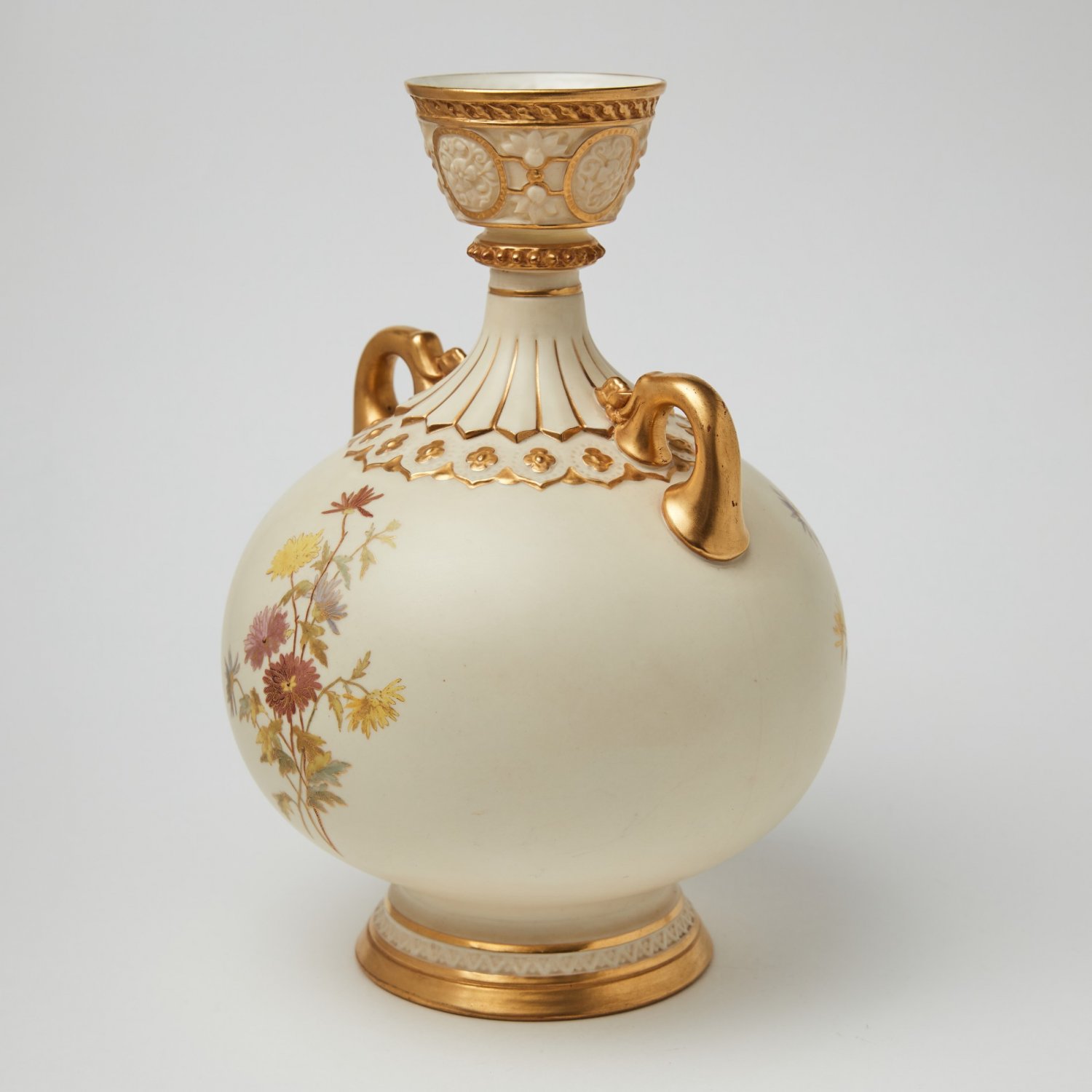 Прекрасная ваза в технике «blush ivory», дополненная позолотой. Изогнутое тулово завершает горловина с рельефным узором. По бокам вазы располагаются две позолоченные ручки. Фарфоровые изделия «blush ivory» с персиковым румянцем являются коллекционными предметами. В середине 60-х годов XIX столетия англичане на фарфоровой мануфактуре Royal Worcester изобрели новую технологию по производству фарфора.