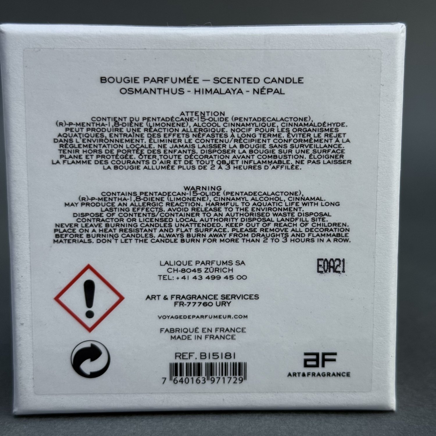 Ароматическая свеча Lalique Osmanthus, Himalaya - Nepal ( Османтус, Гималаи - Непал ) линейка ароматов для дома Voyage de Parfumeur ( Путешествие парфюмера ) 2024-2025 г. Черное лакированное стекло, белый воск. Время горения от 40 до 50 часов. Парфюмер: Клэр Шамбер ( Claire Chambert ). Изготовлено вручную во Франции. Размер: высота 9,5 см, диаметр 7,5 см, вес 190 гр.