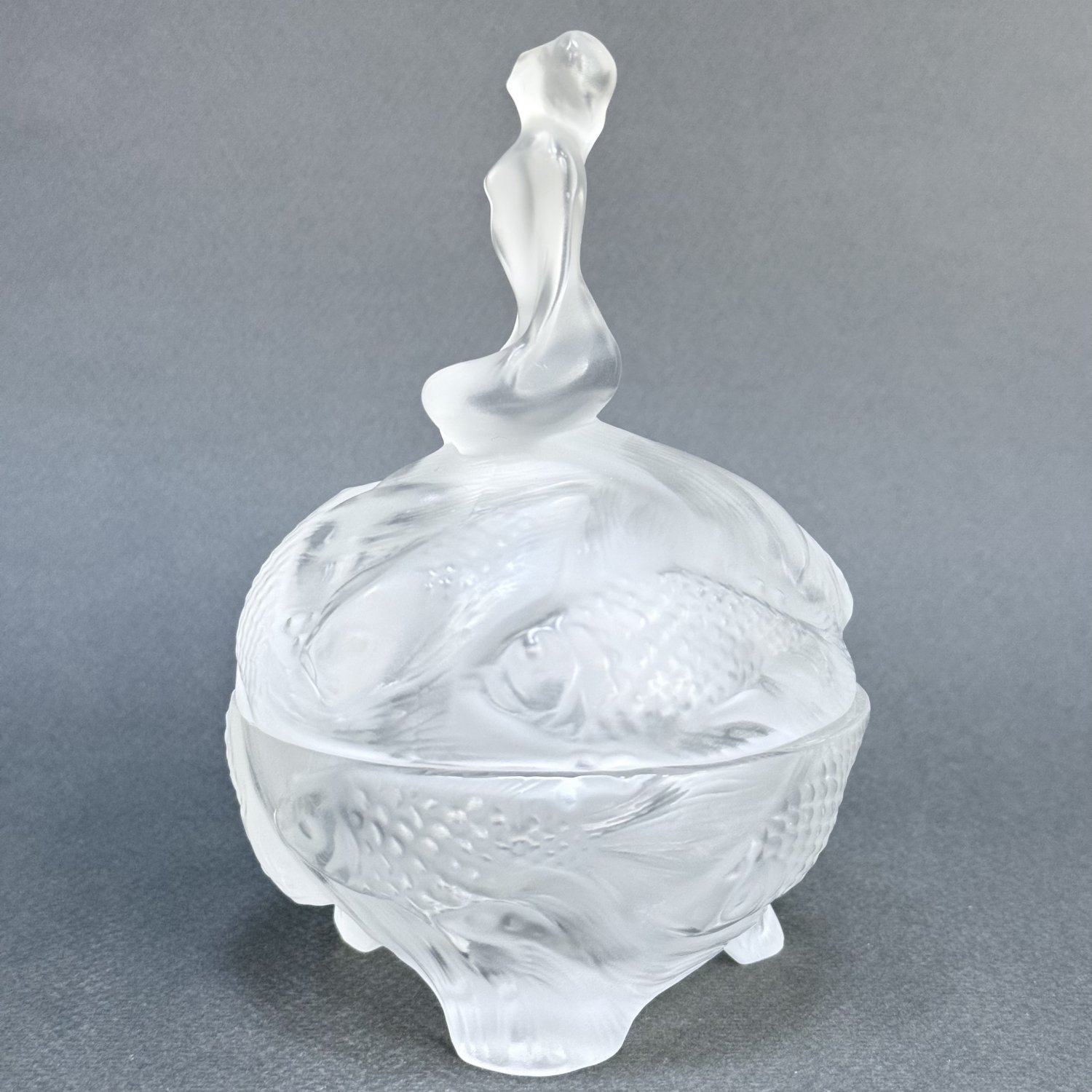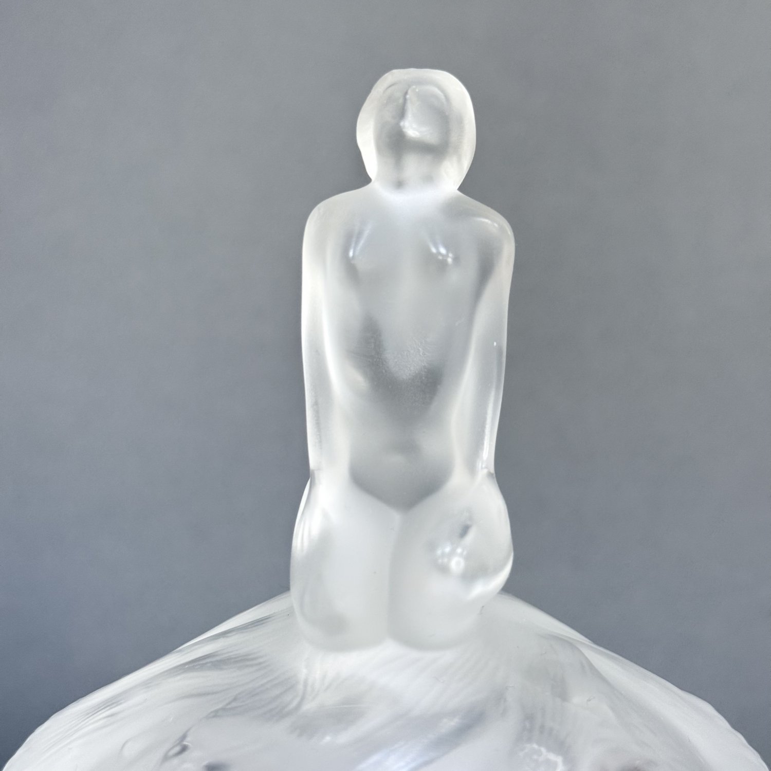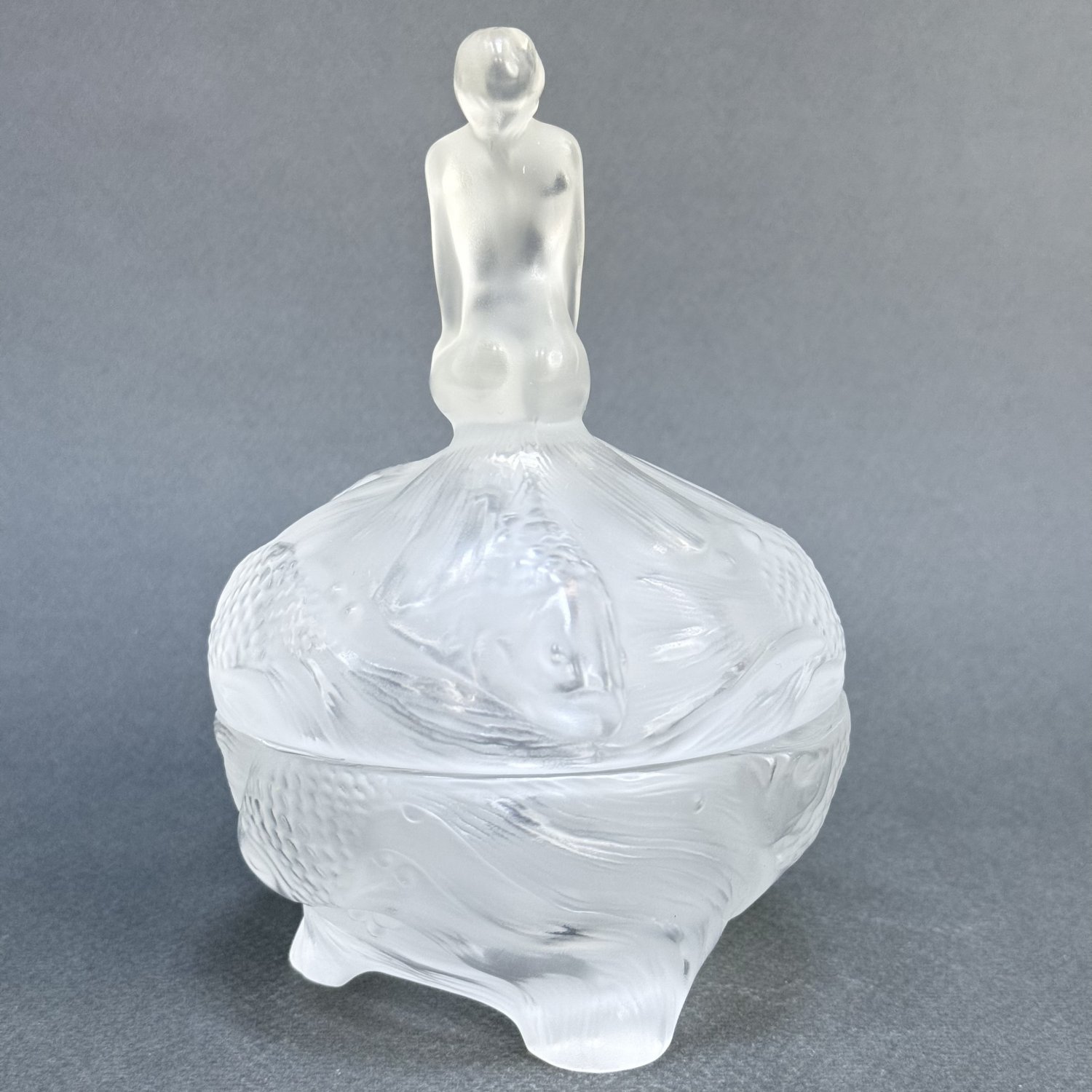 Чаша из прозрачного матового стекла в стиле ар-деко.Ручка на крышке шкатулки в виде обнаженной женской фигуры. Эта модель шкатулки изначально была изготовлена компанией LALIQUE. Это изделие было изготовлено в Богемии из ОРИГИНАЛЬНЫХ старинных форм, использовавшихся в 1930-1939 годах. Это потрясающее высококачественное стекло с сатинированной отделкой в стильном французском стиле ар-деко.