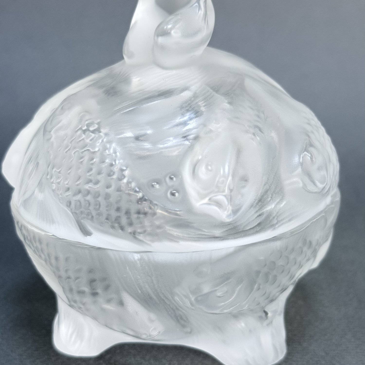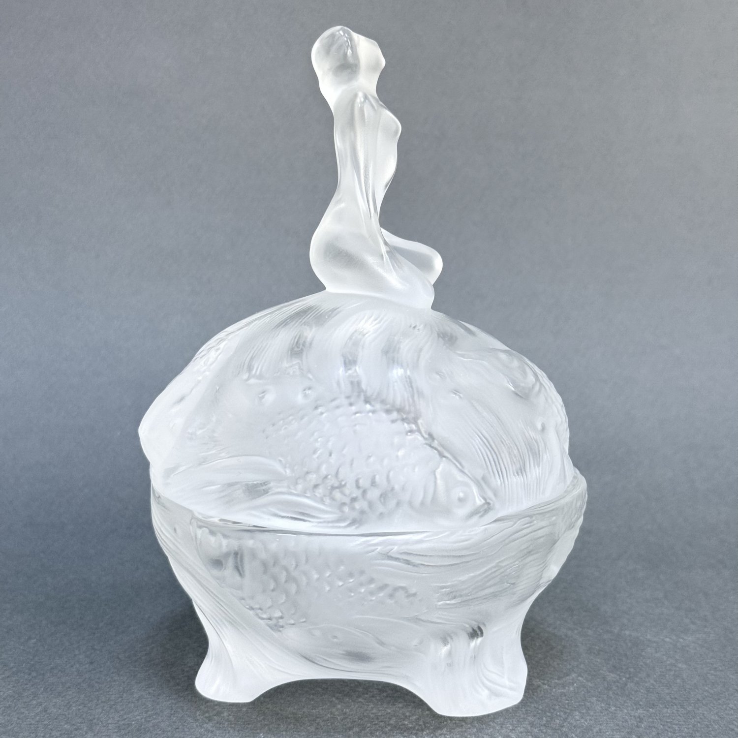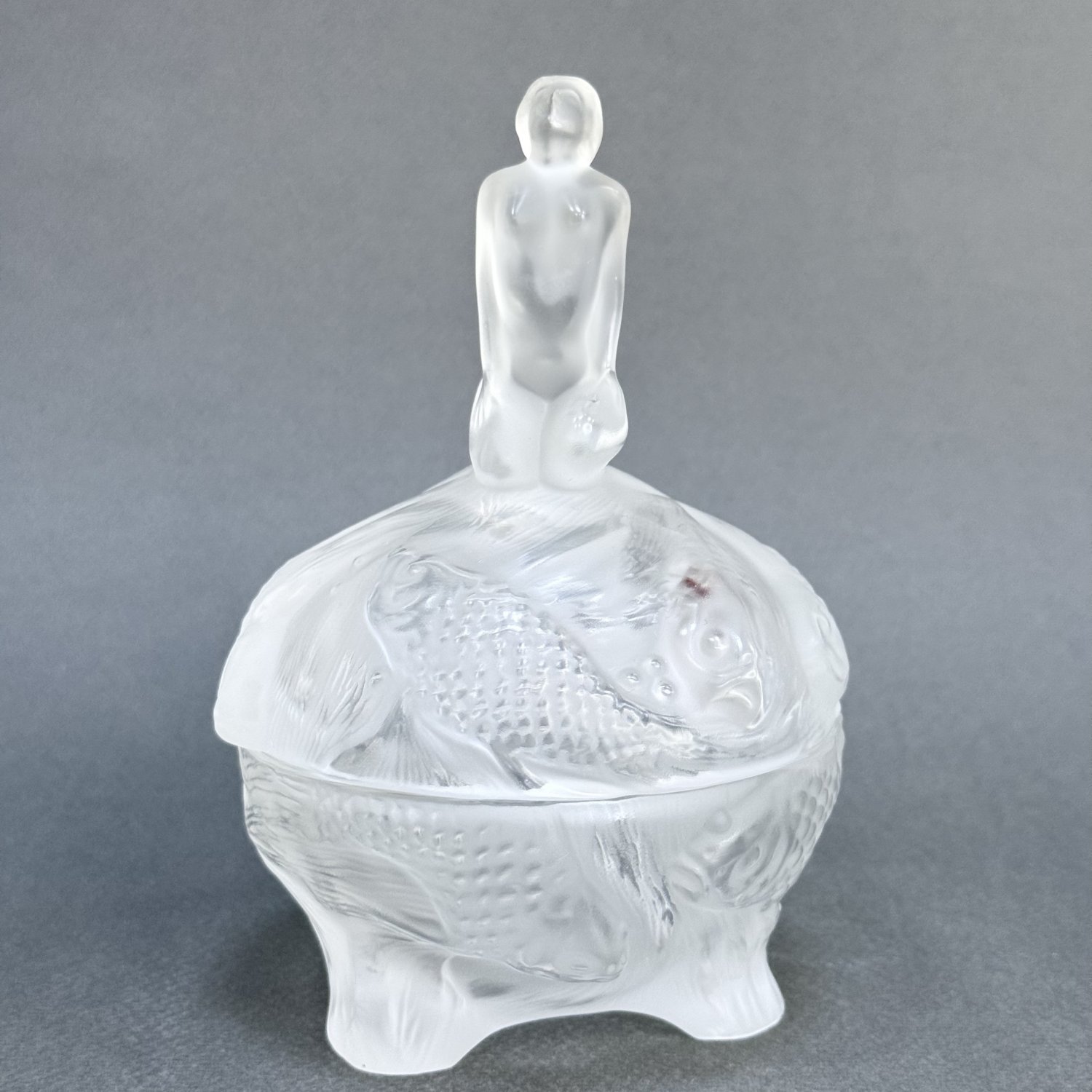 Чаша из прозрачного матового стекла в стиле ар-деко.Ручка на крышке шкатулки в виде обнаженной женской фигуры. Эта модель шкатулки изначально была изготовлена компанией LALIQUE. Это изделие было изготовлено в Богемии из ОРИГИНАЛЬНЫХ старинных форм, использовавшихся в 1930-1939 годах. Это потрясающее высококачественное стекло с сатинированной отделкой в стильном французском стиле ар-деко.