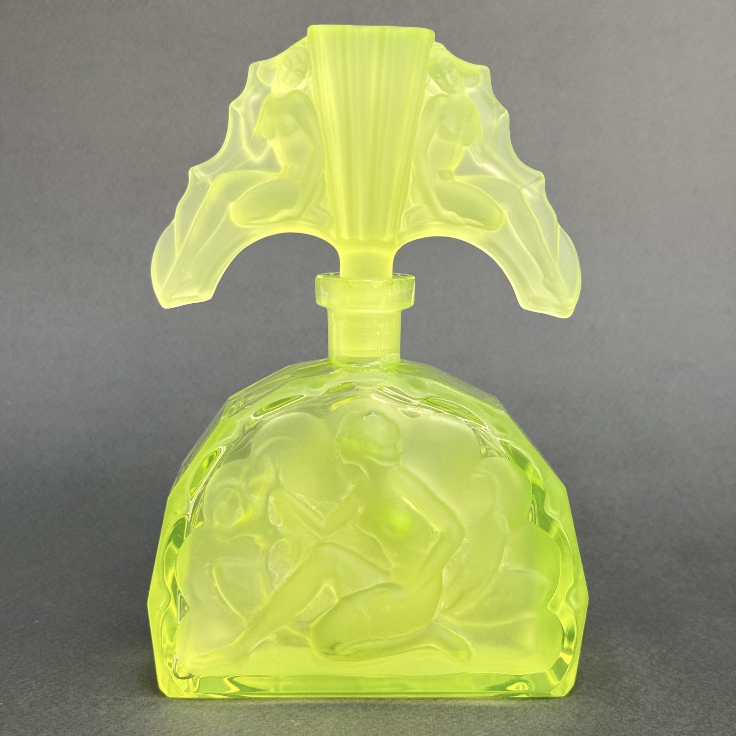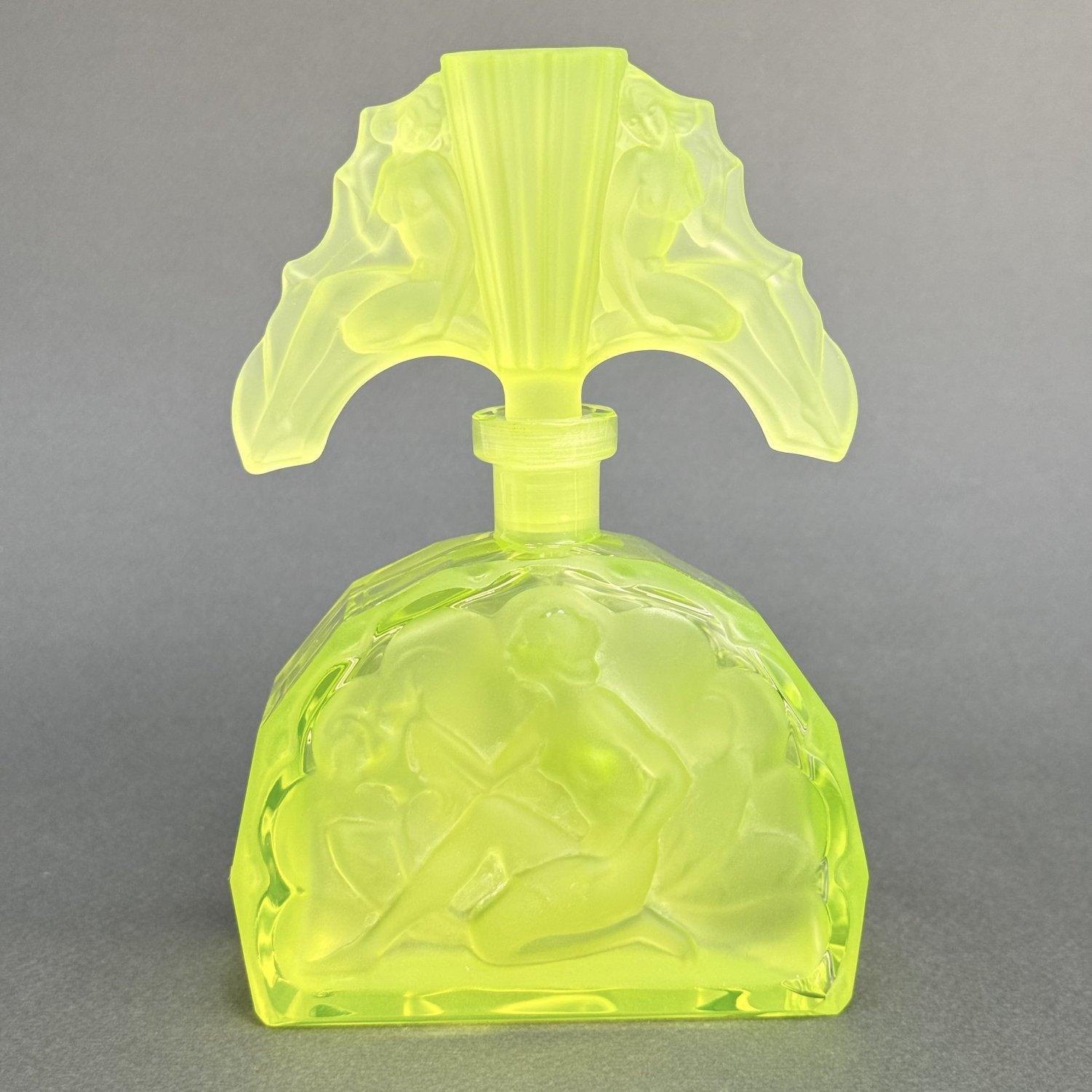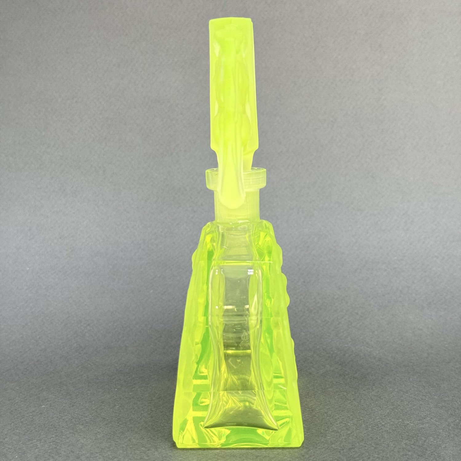 Коллекционный парфюмерный флакон в стиле Артдеко, дизайн Heinrich Hoffmann ( Генрих Хоффман ) 1930е г. Из вазелинового уранового стекла, 21 в Чехия. Размер: высота 16,4 см, длина 11 см, ширина 5 см. Урановое стекло