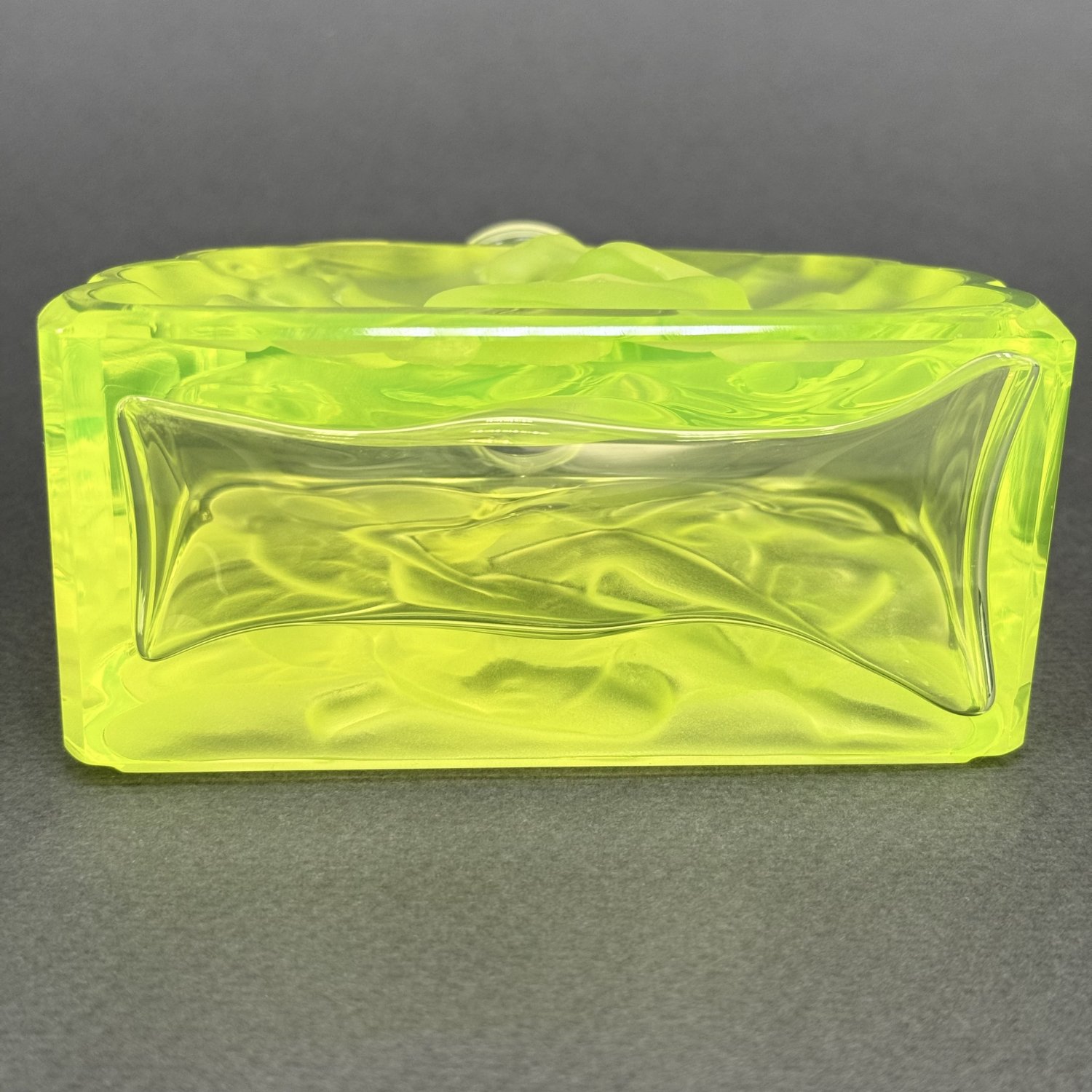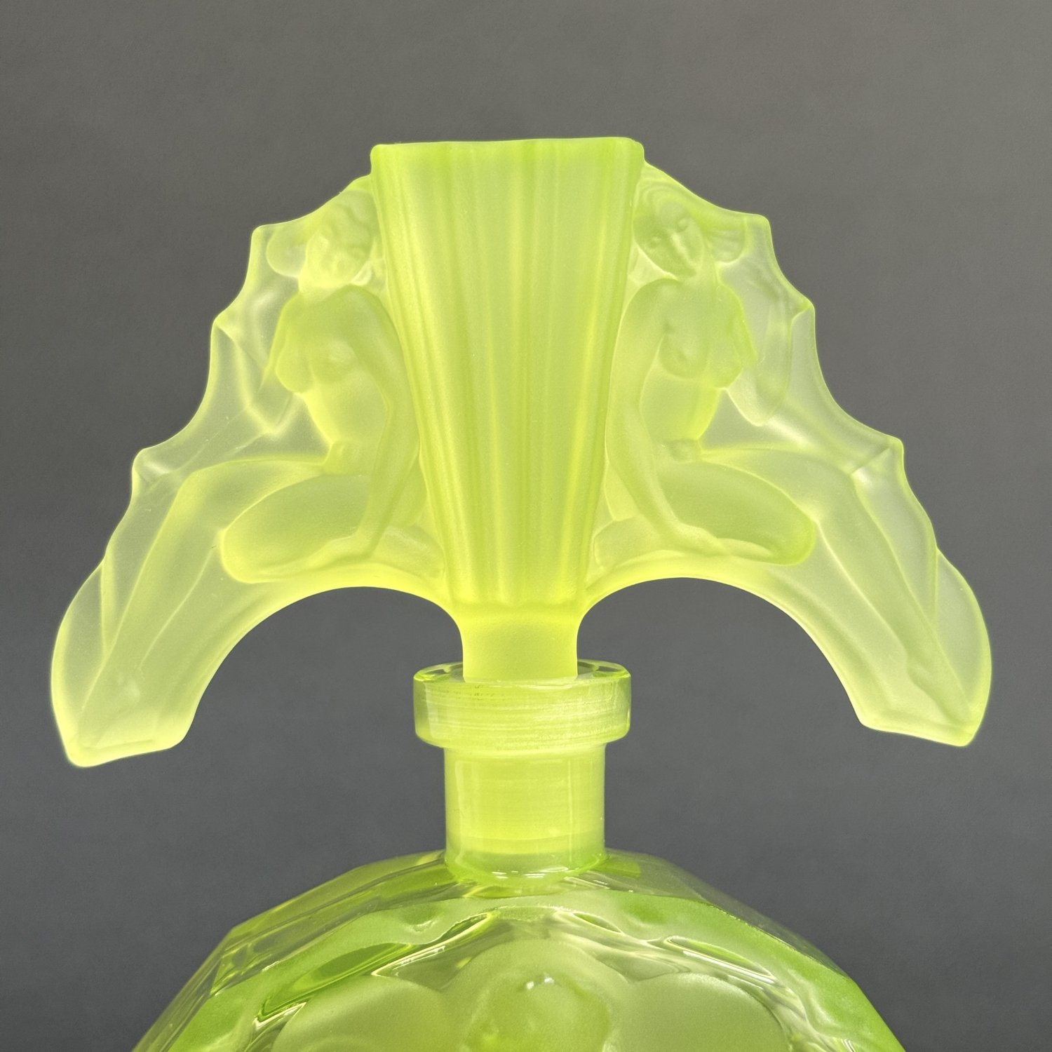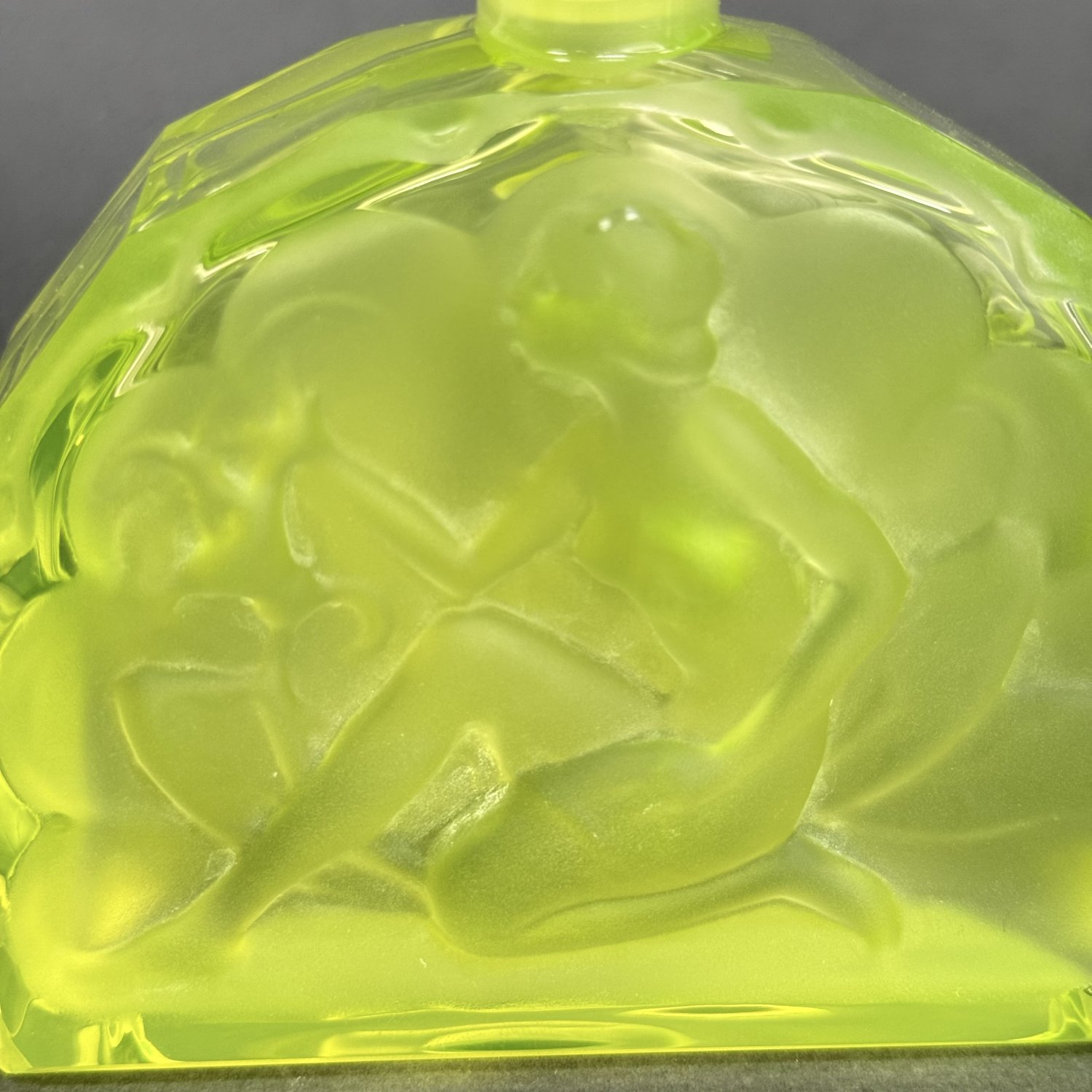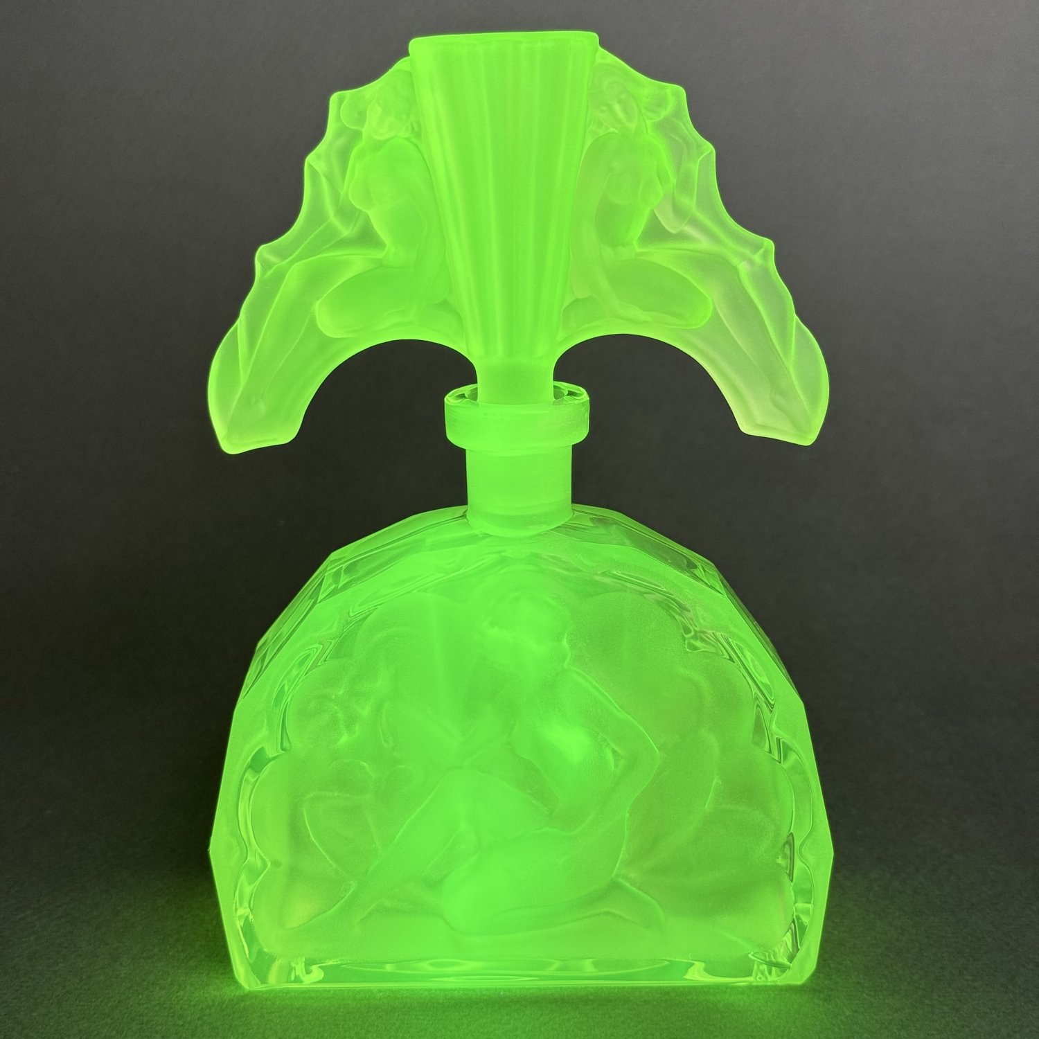 Коллекционный парфюмерный флакон в стиле Артдеко, дизайн Heinrich Hoffmann ( Генрих Хоффман ) 1930е г. Из вазелинового уранового стекла, 21 в Чехия. Размер: высота 16,4 см, длина 11 см, ширина 5 см. Урановое стекло
