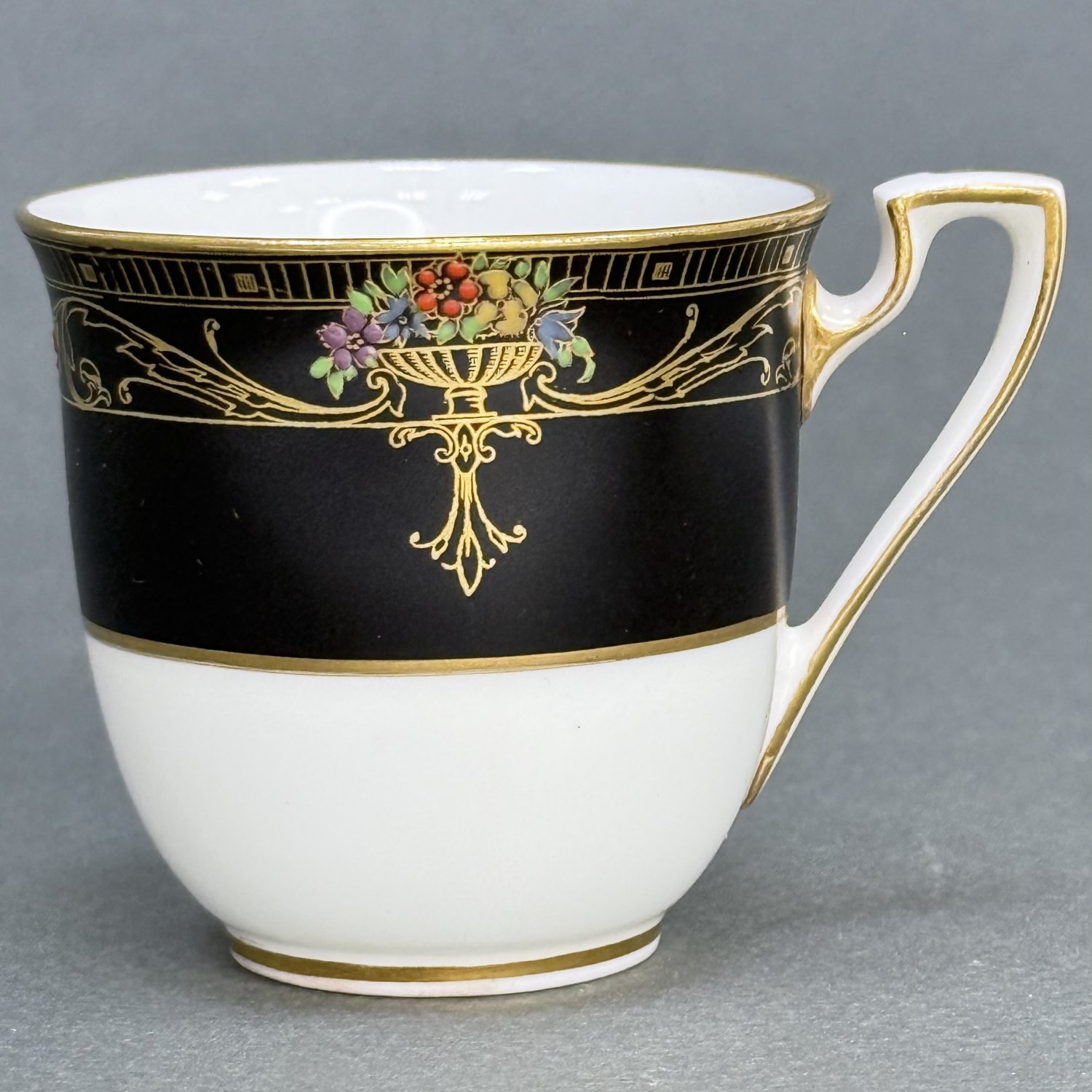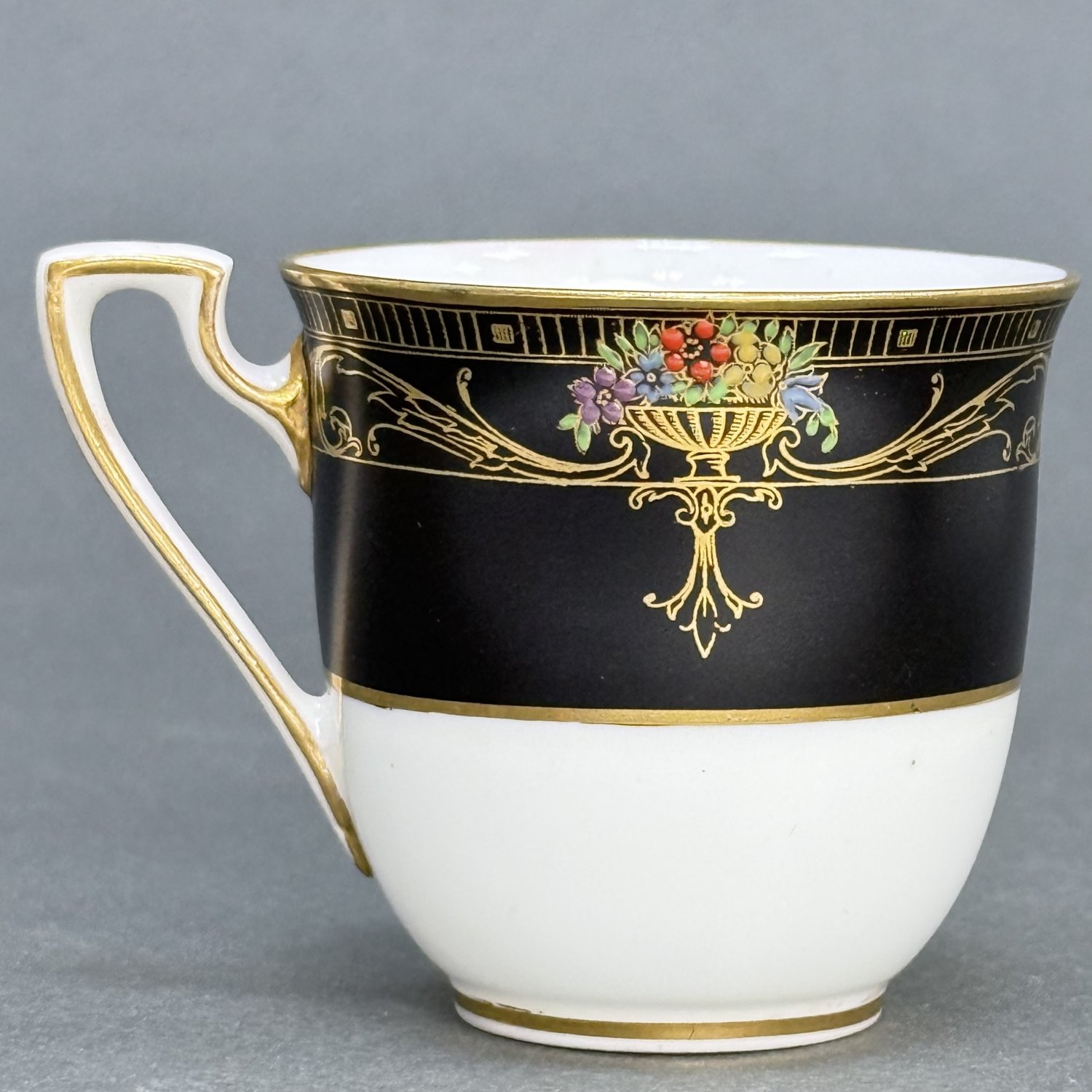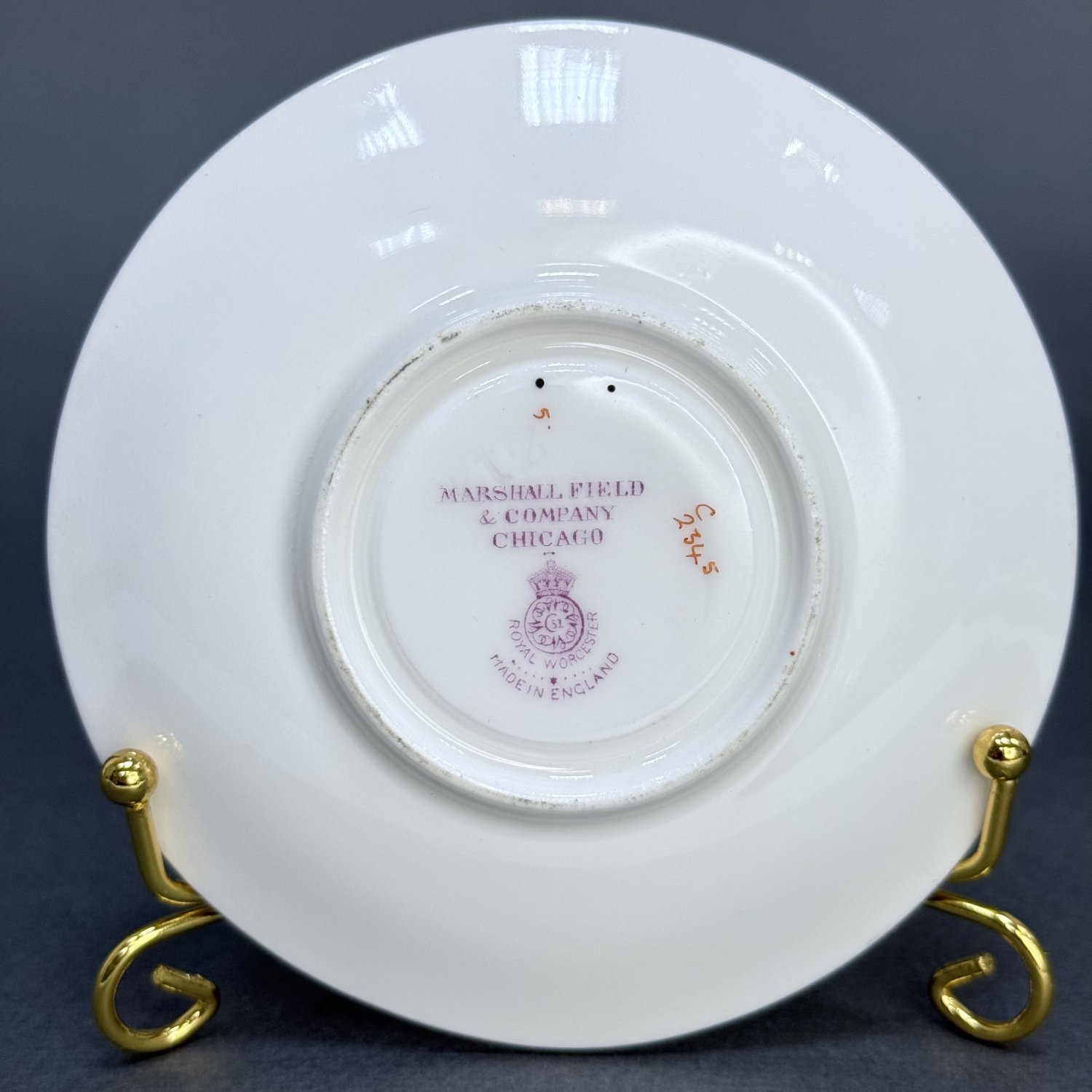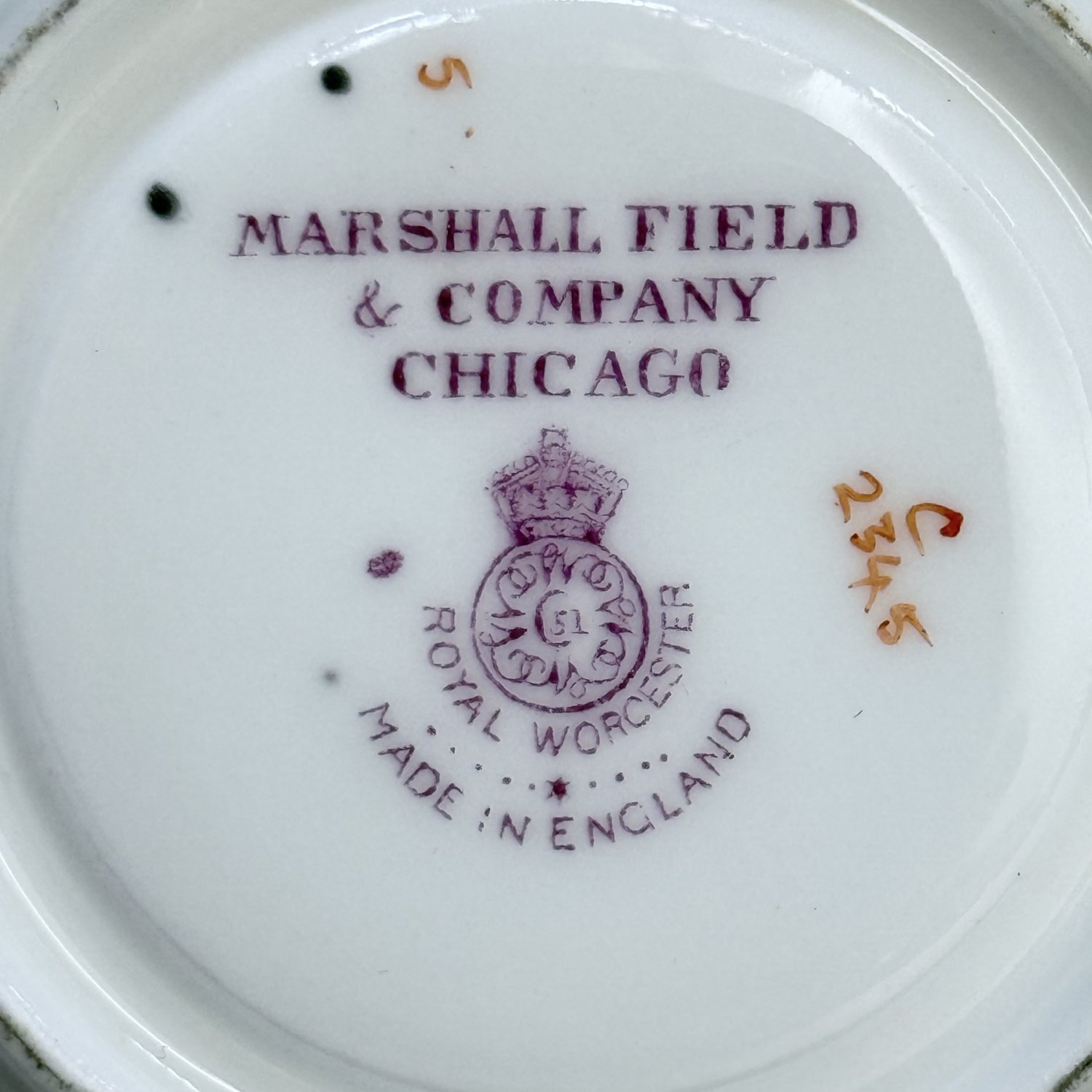 Чикагская история Уникальный артефакт эпохи: кофейный набор Royal Worcester (1920 гг.), распространявшийся через культовый универмаг Marshall Field's. Характерные элементы: благородное чёрное крытье, сочная цветочная роспись, изящные золотые акценты. Особую ценность придаёт двойное клеймение - британского производителя и американского ритейлера. Габариты (чашка: 5.4×5.6 см) соответствуют стандартам подачи кофе в эпоху джаза.