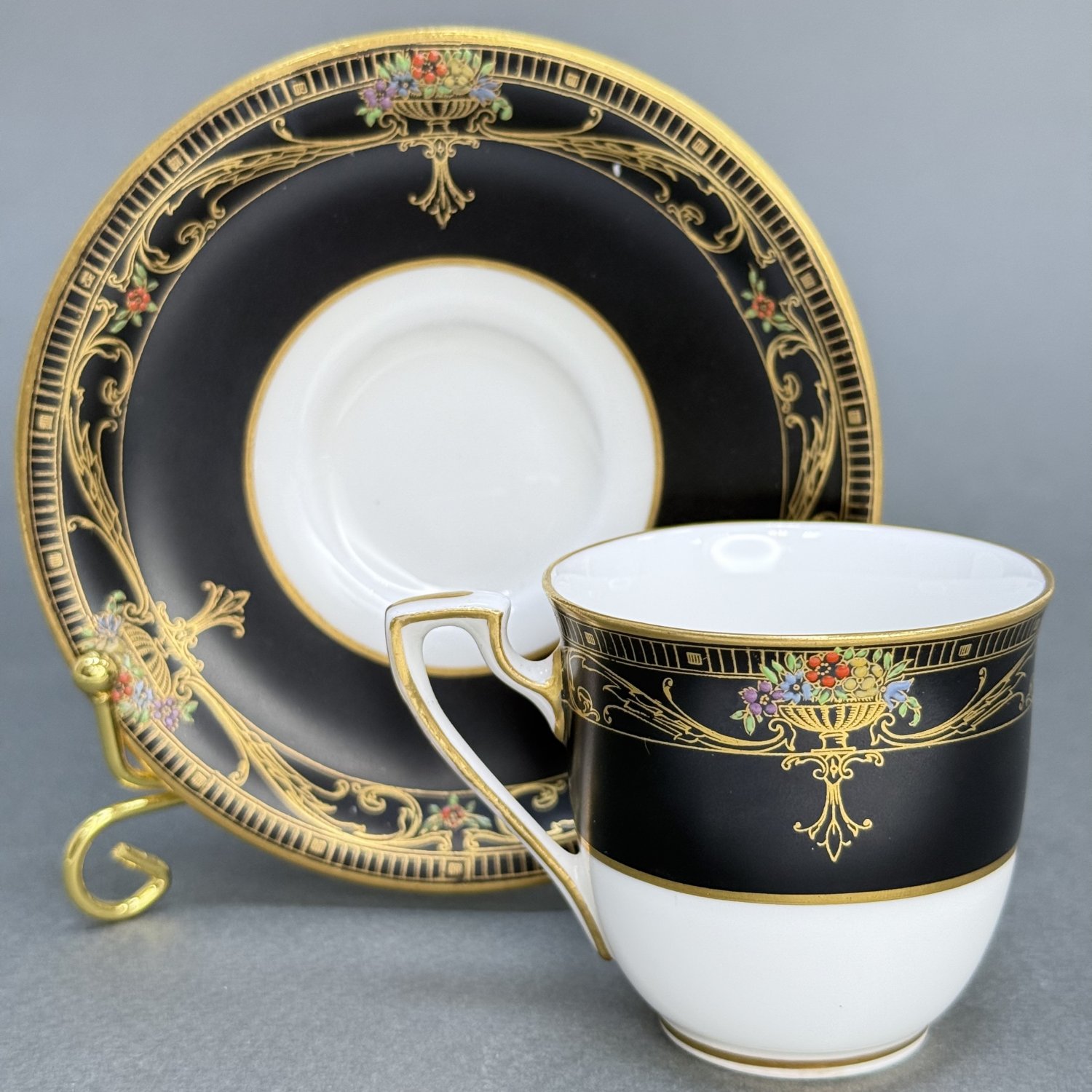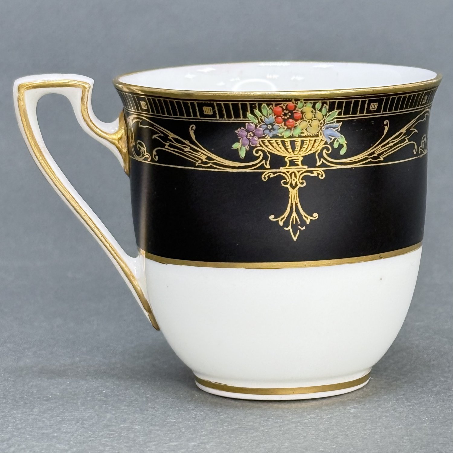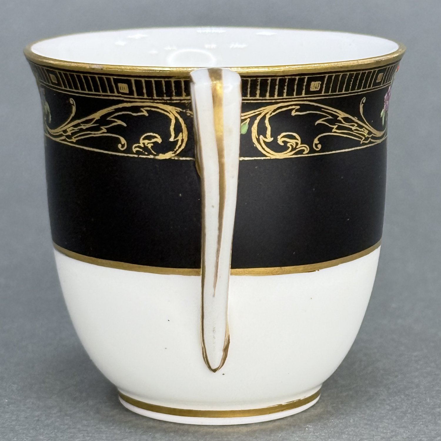 Чикагская история Уникальный артефакт эпохи: кофейный набор Royal Worcester (1920 гг.), распространявшийся через культовый универмаг Marshall Field's. Характерные элементы: благородное чёрное крытье, сочная цветочная роспись, изящные золотые акценты. Особую ценность придаёт двойное клеймение - британского производителя и американского ритейлера. Габариты (чашка: 5.4×5.6 см) соответствуют стандартам подачи кофе в эпоху джаза.