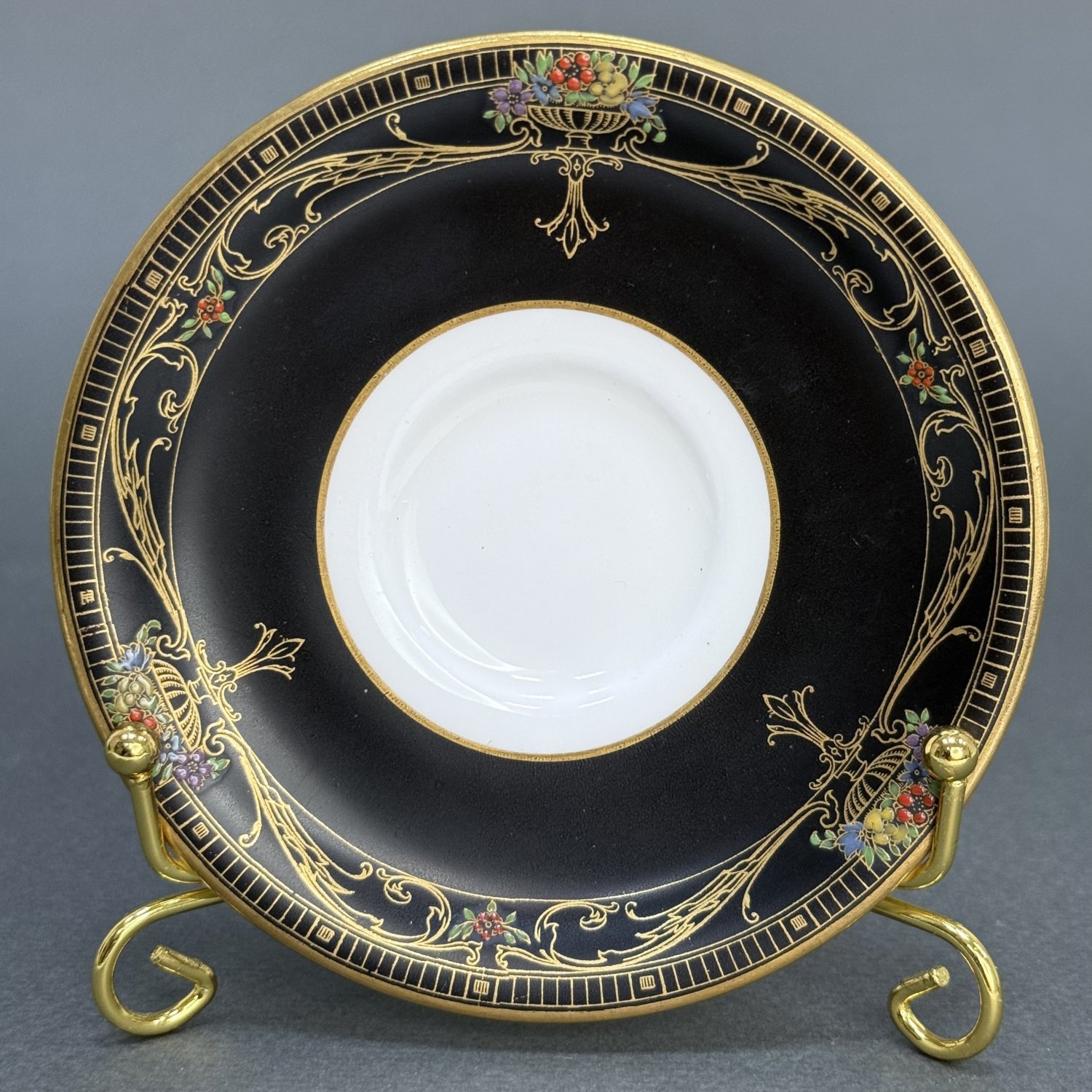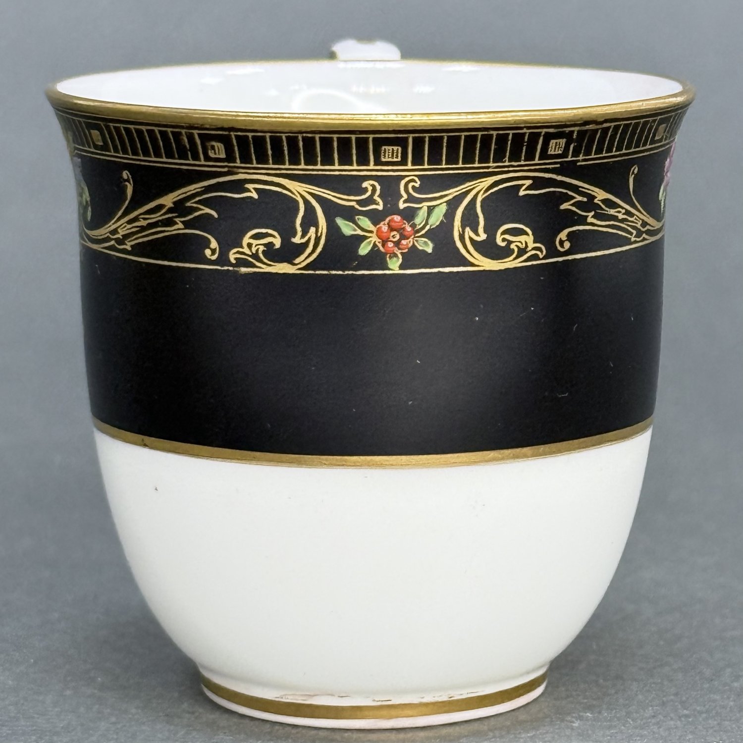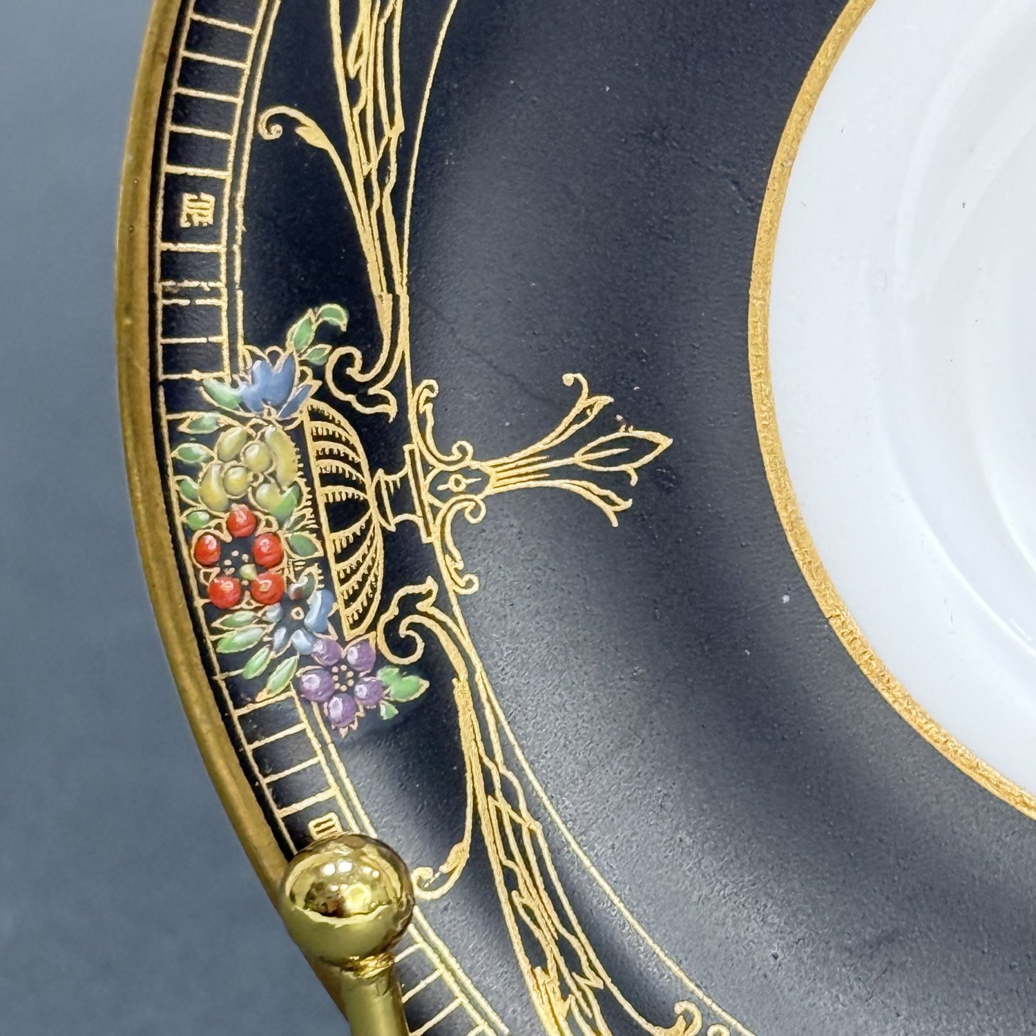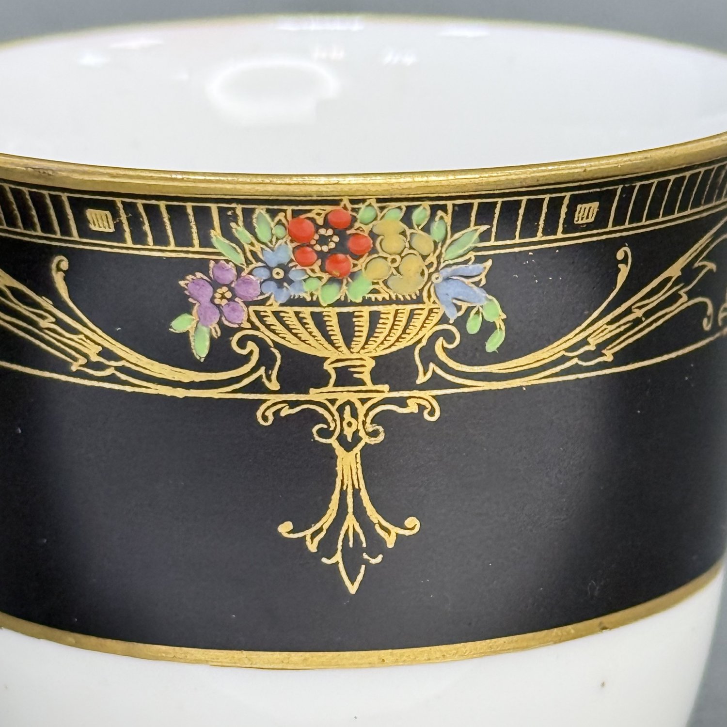 Чикагская история Уникальный артефакт эпохи: кофейный набор Royal Worcester (1920 гг.), распространявшийся через культовый универмаг Marshall Field's. Характерные элементы: благородное чёрное крытье, сочная цветочная роспись, изящные золотые акценты. Особую ценность придаёт двойное клеймение - британского производителя и американского ритейлера. Габариты (чашка: 5.4×5.6 см) соответствуют стандартам подачи кофе в эпоху джаза.