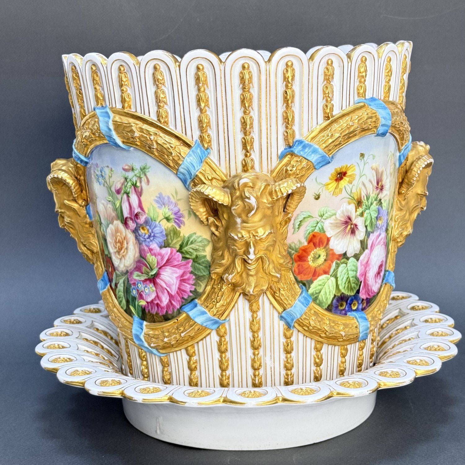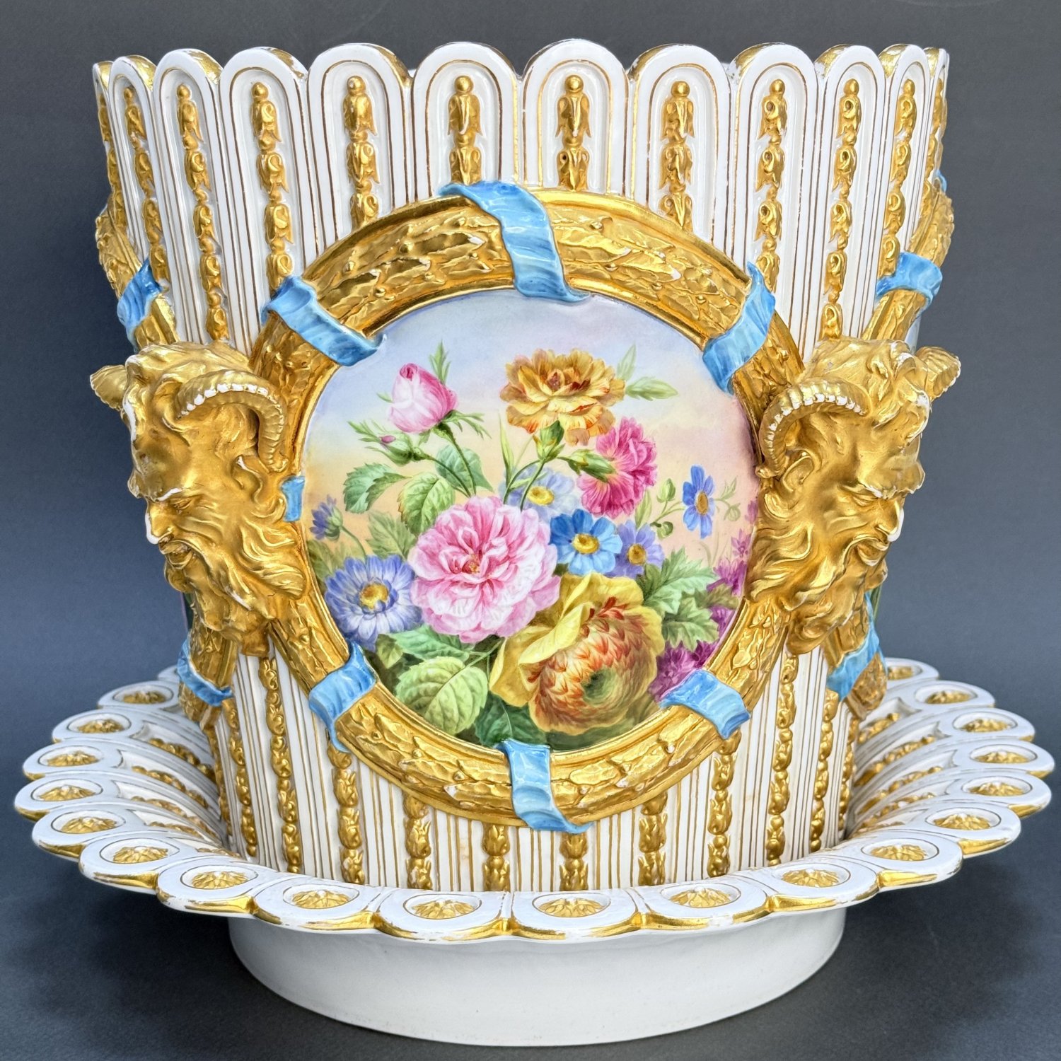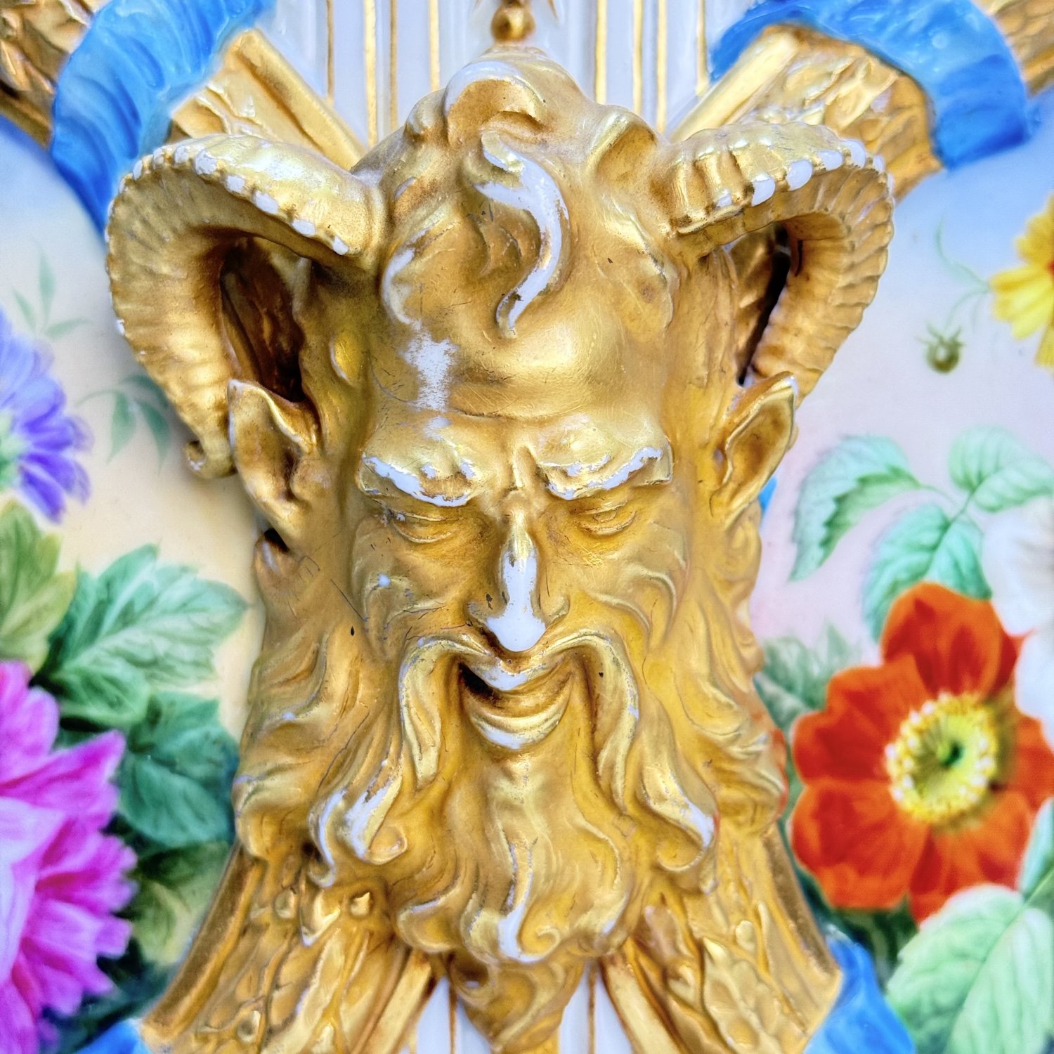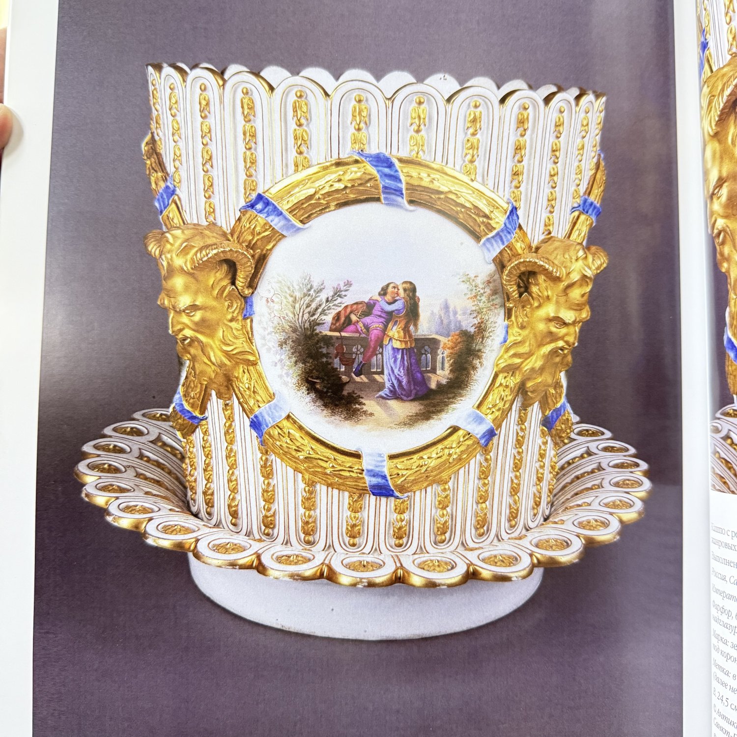 Кашпо с поддоном ИФЗ ( Императорский Фарфоровый Завод ) период правления Александра II ( 1855-1881 ) Императорская Россия 1850-1860 гг. Фарфор, золочение, надглазурная полихромная роспись - букеты цветов, скульптурная отделка, головы с рогами,клеймо хромом. Размеры: высота 20,5 см, диаметр основания 14,7 см, диаметр чаши 24 см