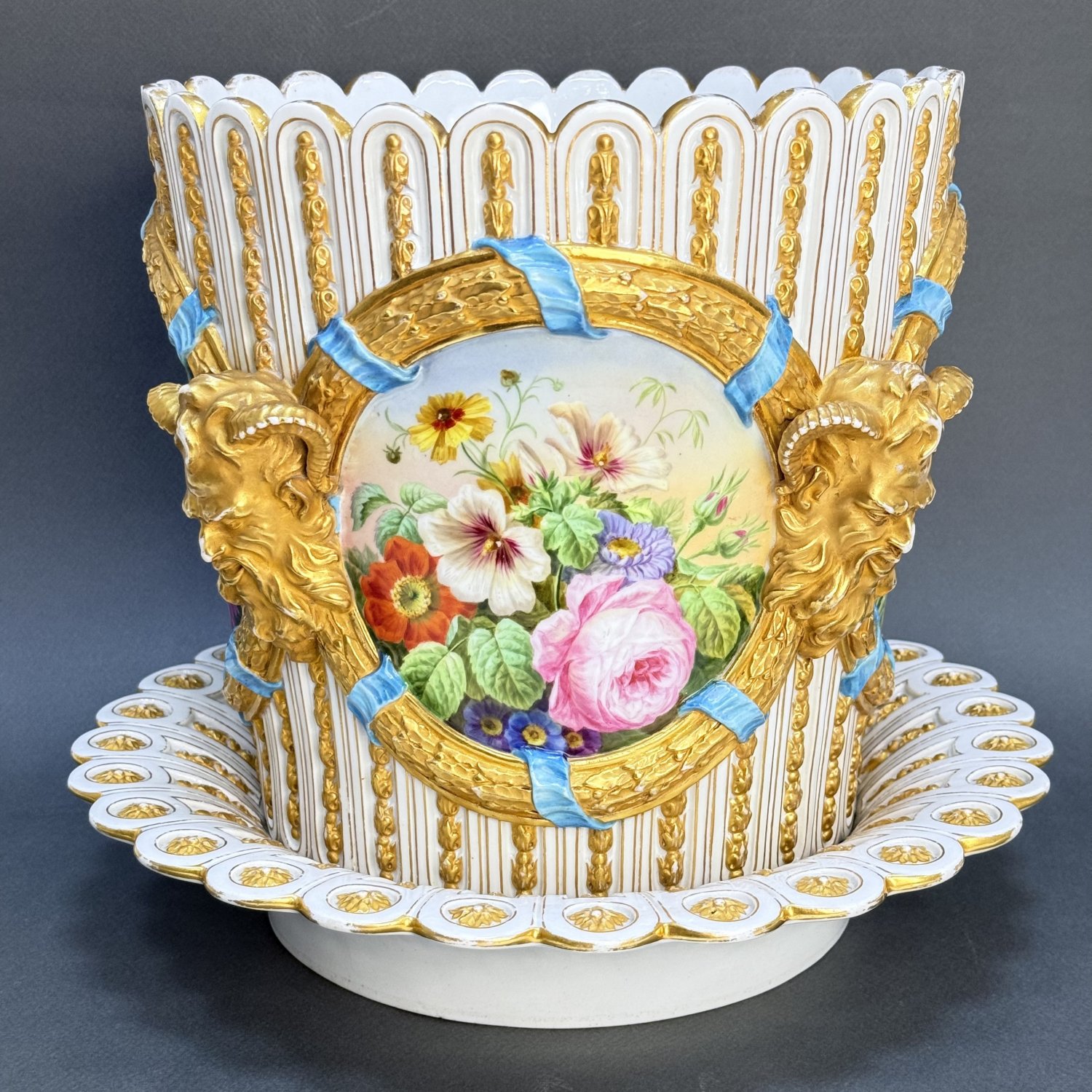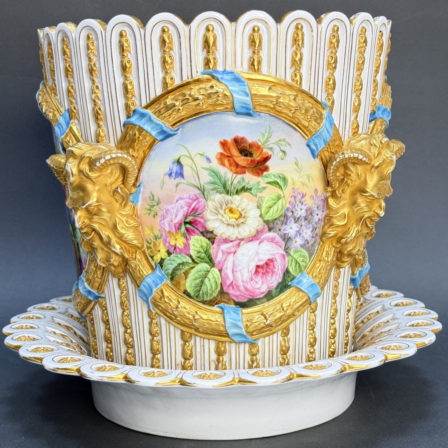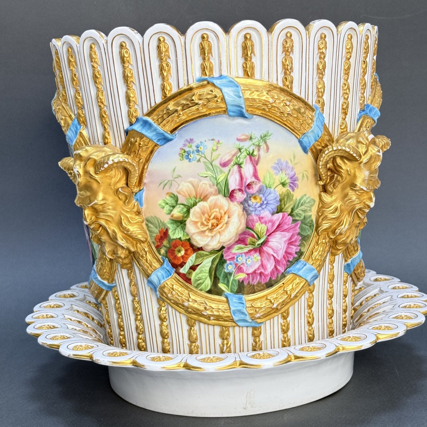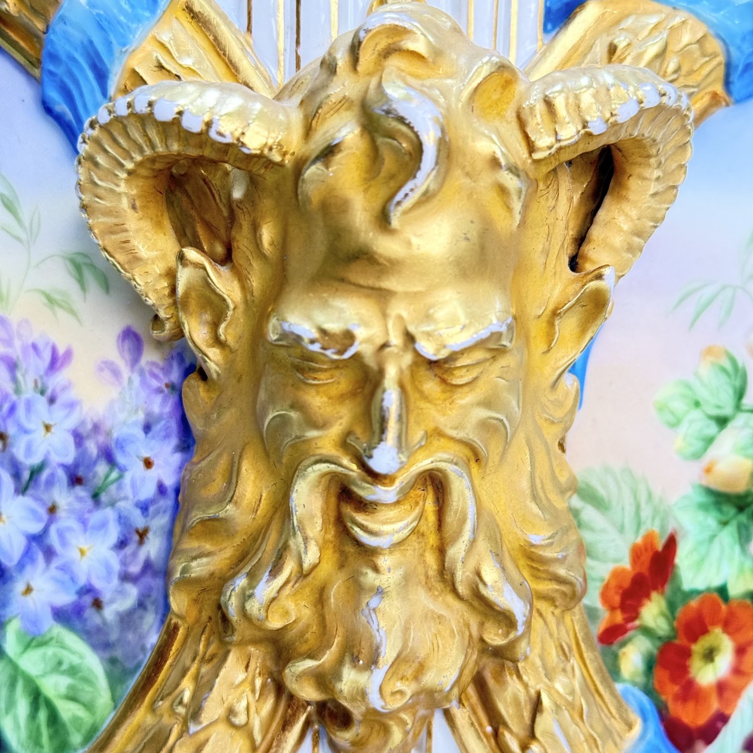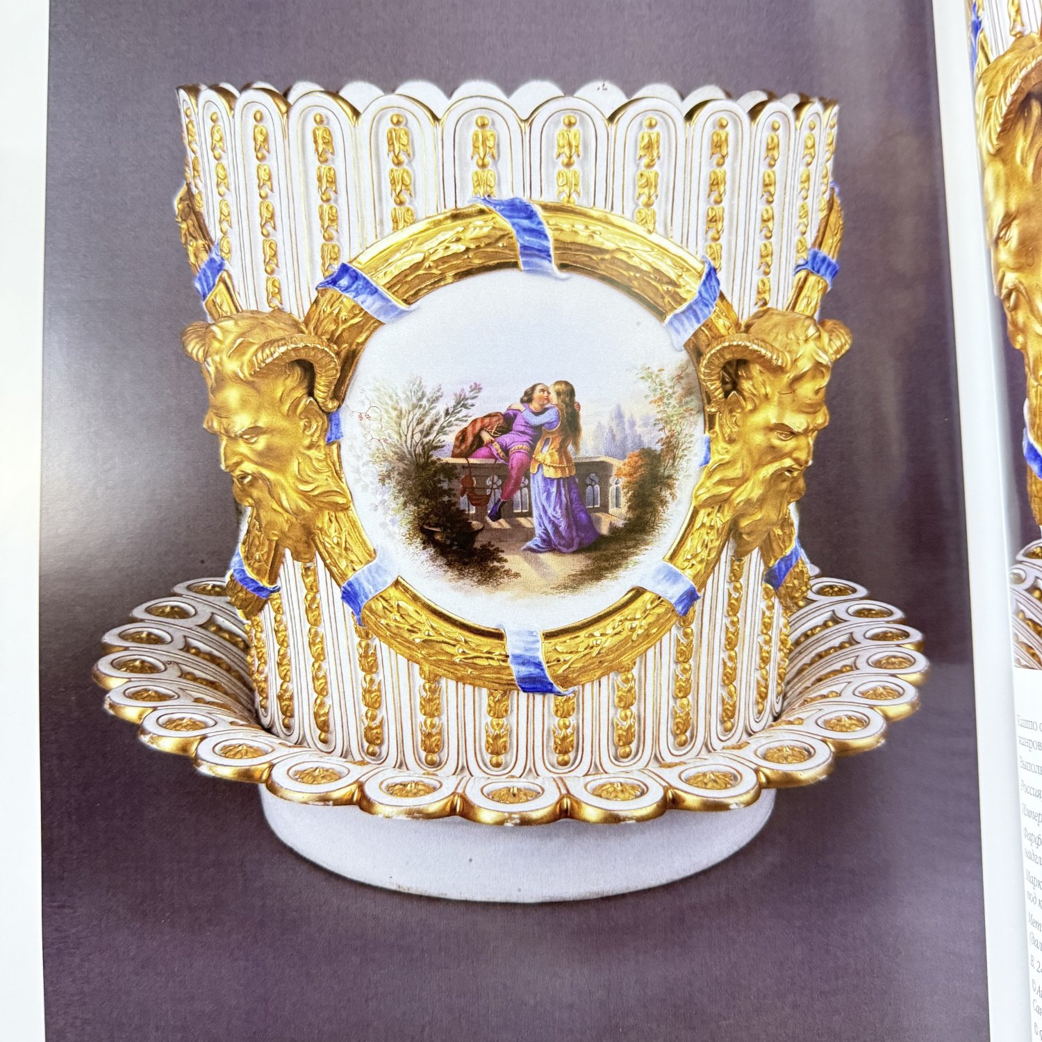 Кашпо с поддоном ИФЗ ( Императорский Фарфоровый Завод ) период правления Александра II ( 1855-1881 ) Императорская Россия 1850-1860 гг. Фарфор, золочение, надглазурная полихромная роспись - букеты цветов, скульптурная отделка, головы с рогами,клеймо хромом. Размеры: высота 20,5 см, диаметр основания 14,7 см, диаметр чаши 24 см
