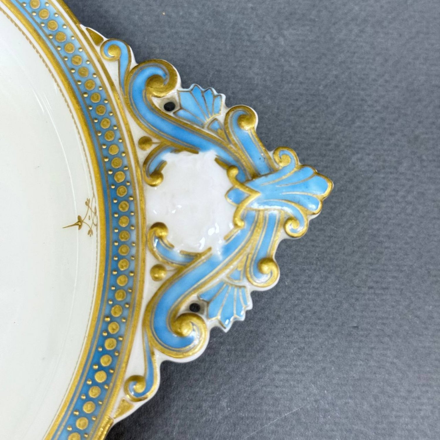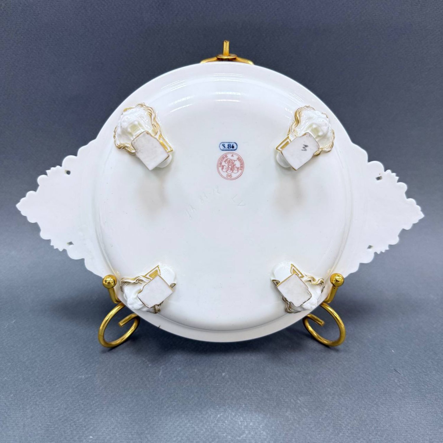 Мелочница,Sevres,1896 год ,маленькая ваза с 2мя ручками и на ножках в форме львиной головы ,ярко бирюзовые декор ,с росписью золотыми красками и пастами,золотая отводка.Клейма синее подглазурное Sevres 84,свидетельствующее о белье мануфактуры Sevres 1884 года,и красное печатное , RF 96 Decore a Sevres, подвтерждающее что предмет был декорирован и расписан на королевской Севрской Мануфактуре .При атрибуции использован марочник Севра стр 19 и 21 (Les Marques de Sevres Marcelle Brunet 1953 г)