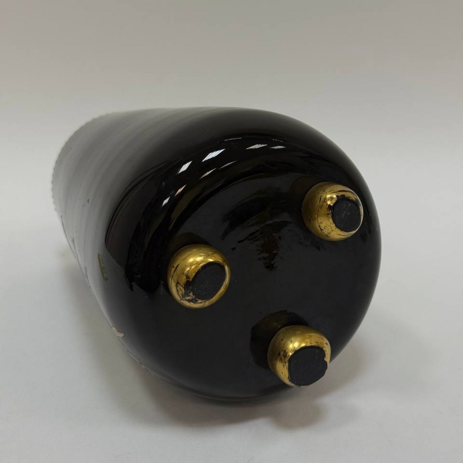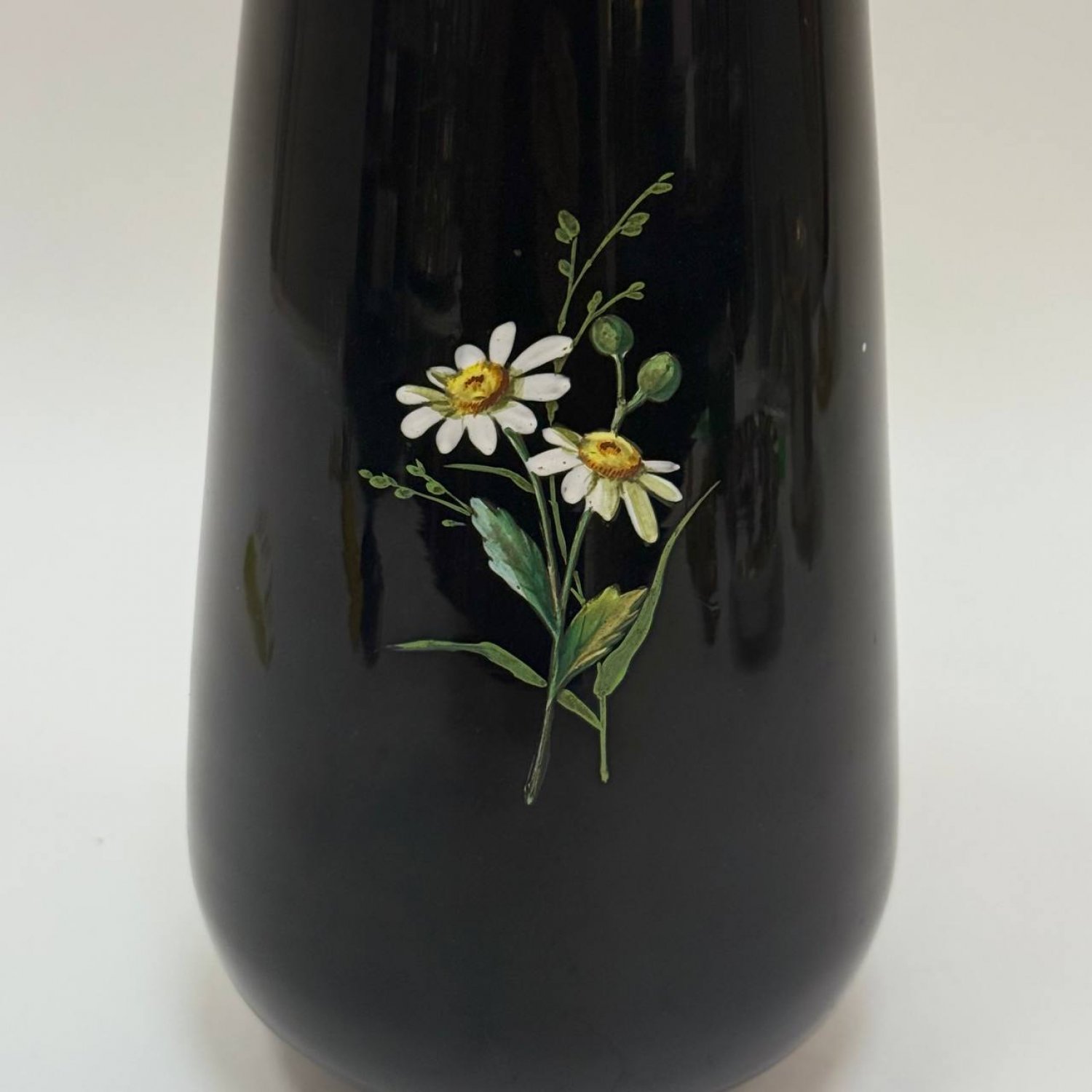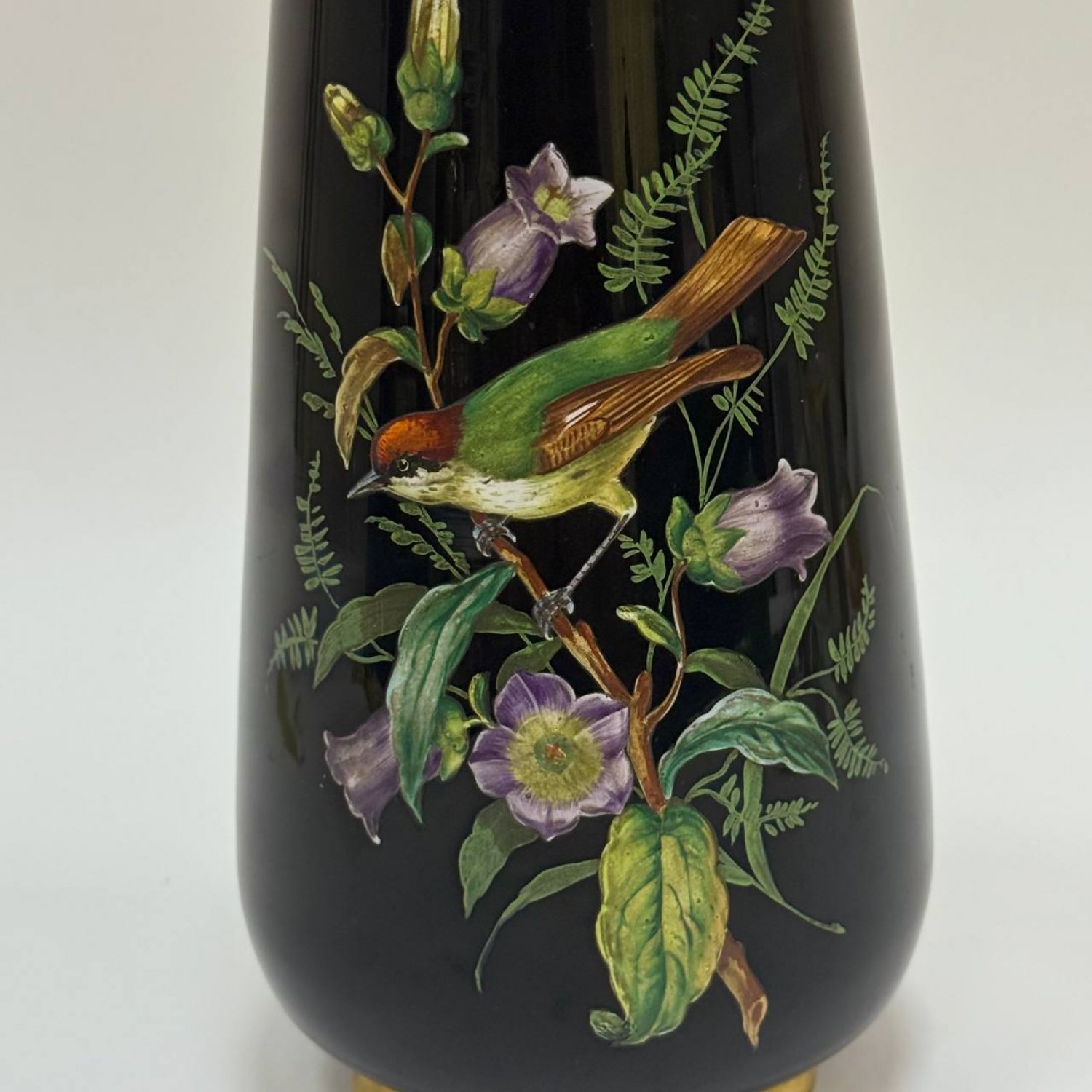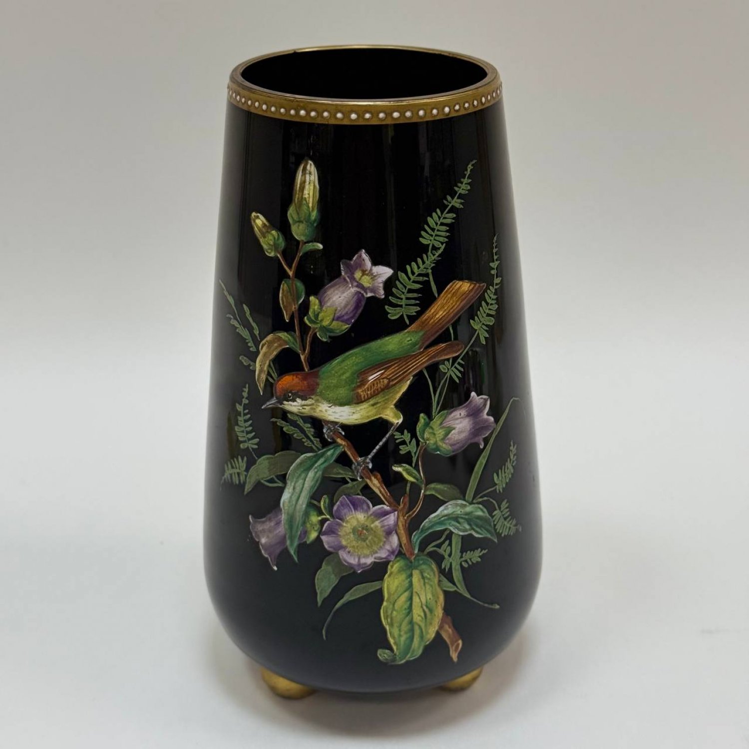 Ваза из черного стекла,Англия, Thomas Webb & Sons, Stourbridge, 1880-1900 гг. Роспись эмалевыми красками, на трех сферических позолоченных ножках, спереди эмалированная певчая птичка, сидящая на ветке магнолии среди колокольчиков и стеблей папоротника, сзади — веточка маргаритки.