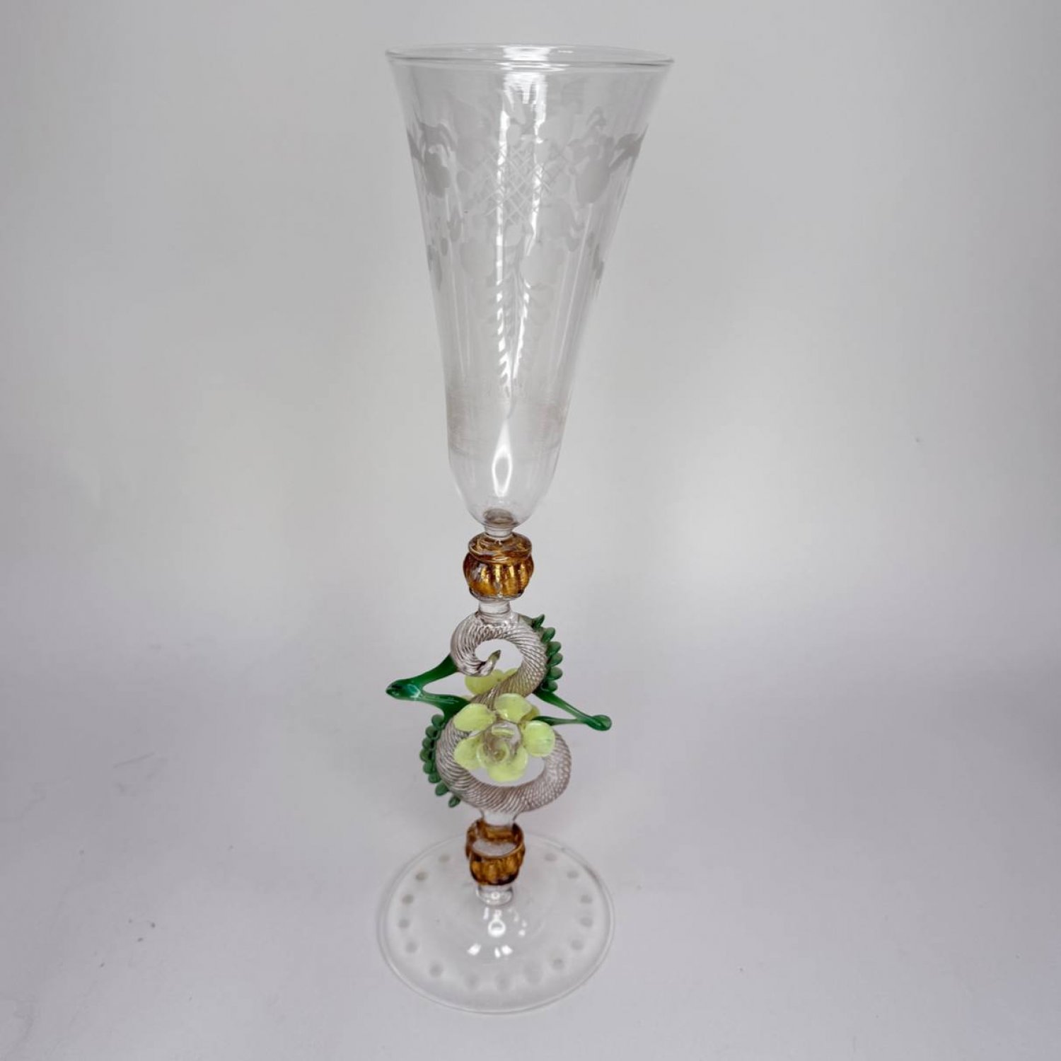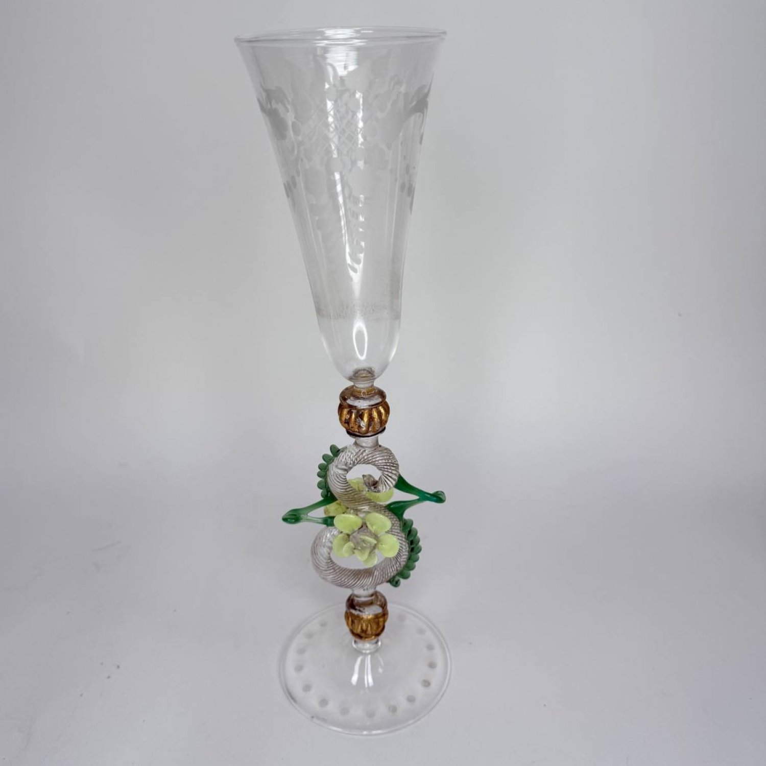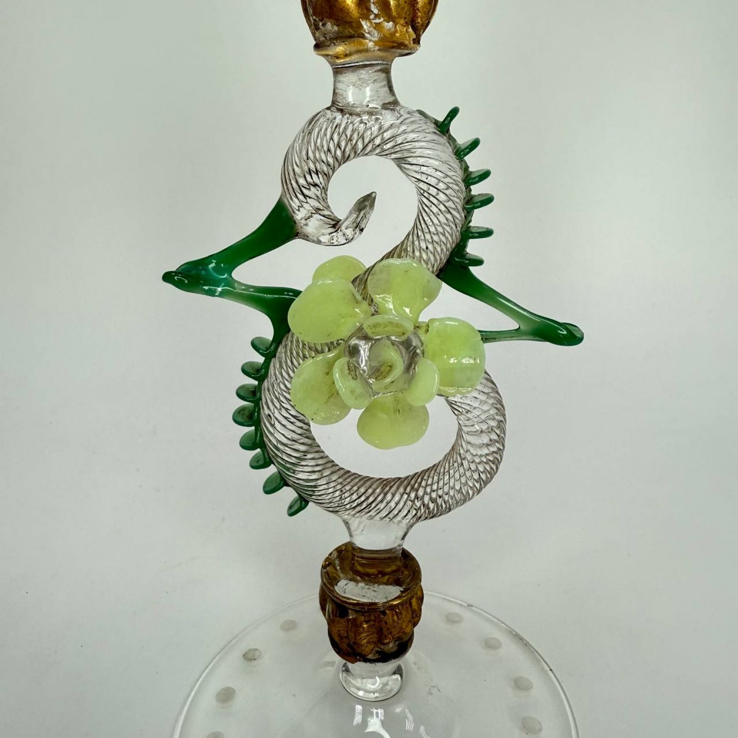 Золочение, ручная гравировка,сочетание прозрачного и декоративных элементов из светло-зеленого стекла