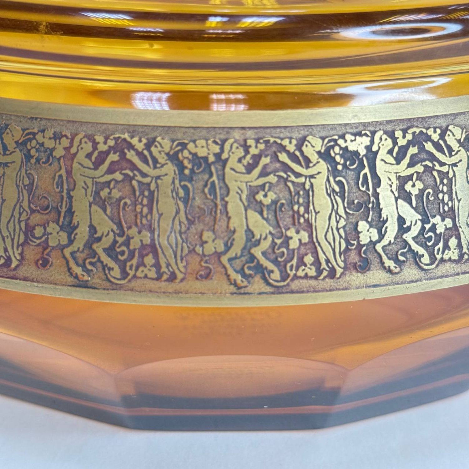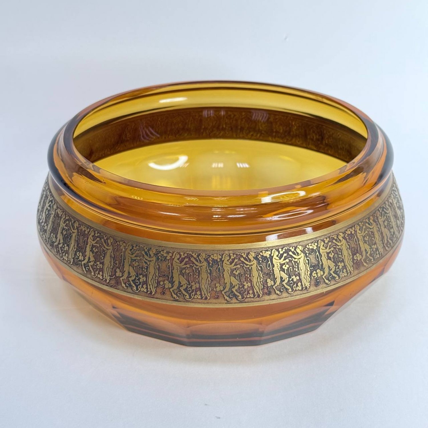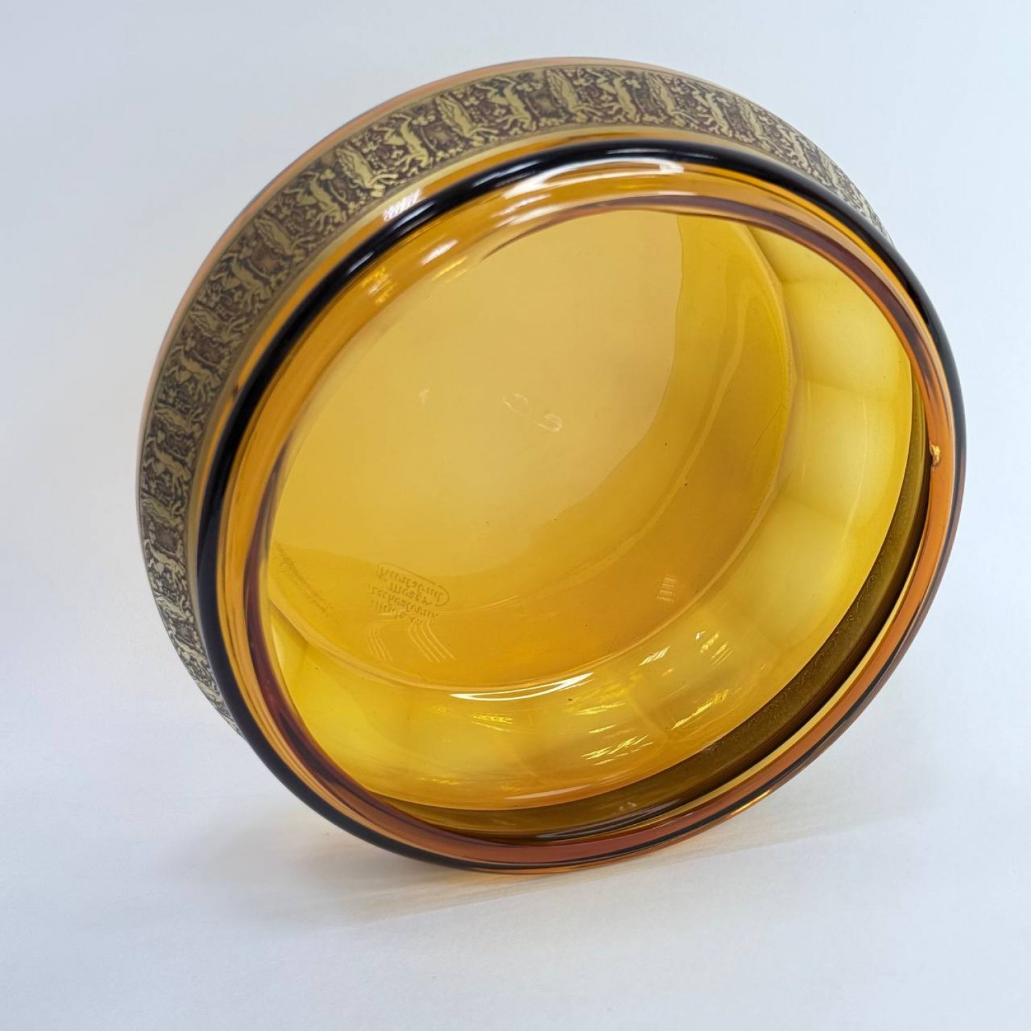 Чаша из янтарного стекла Мозер, Карлсбад, обрамленная лентой в технике травления золотом с изображением пар сатиров и нимф. Клеймо:"Сделано в Чехословакии, Мозер в Карсбаде"