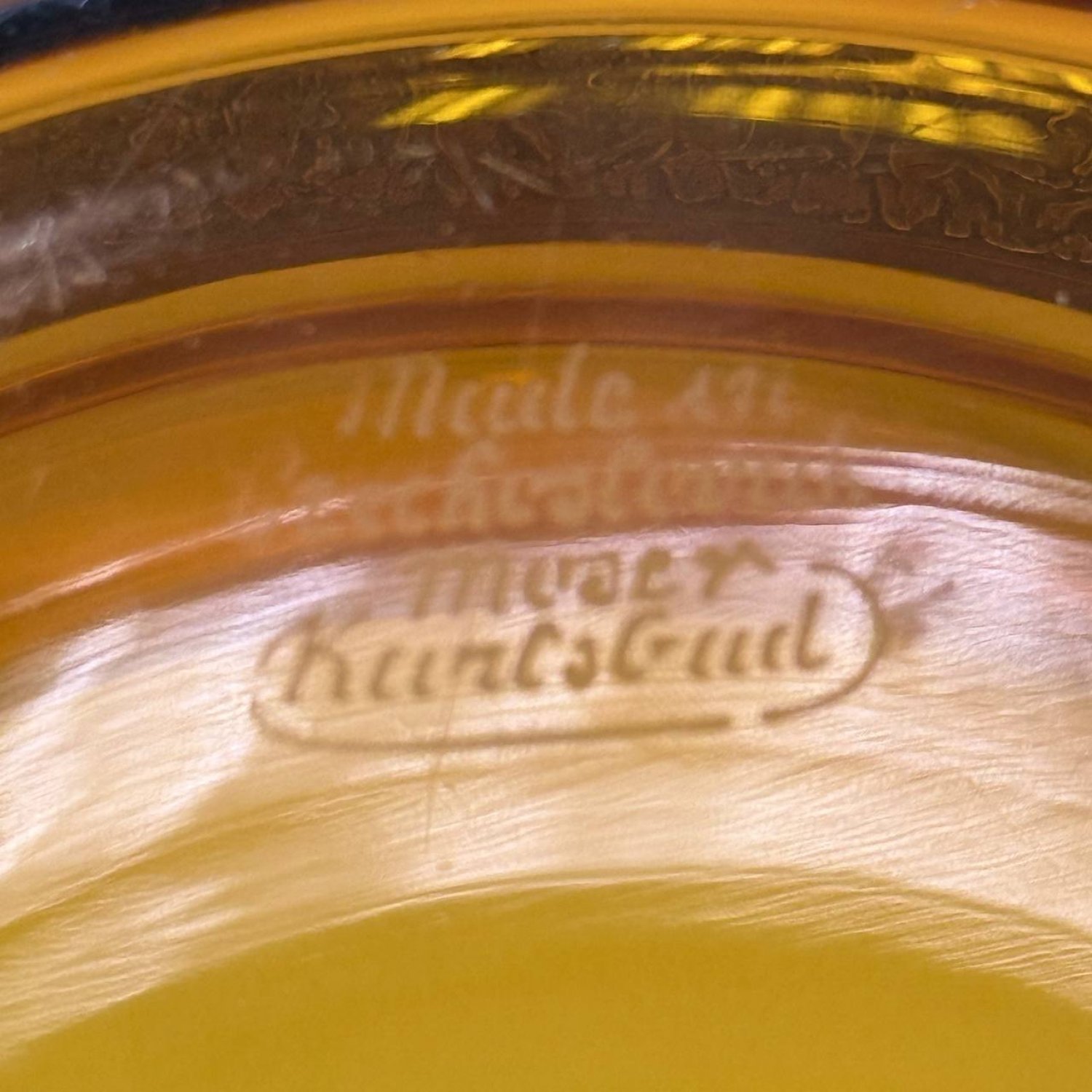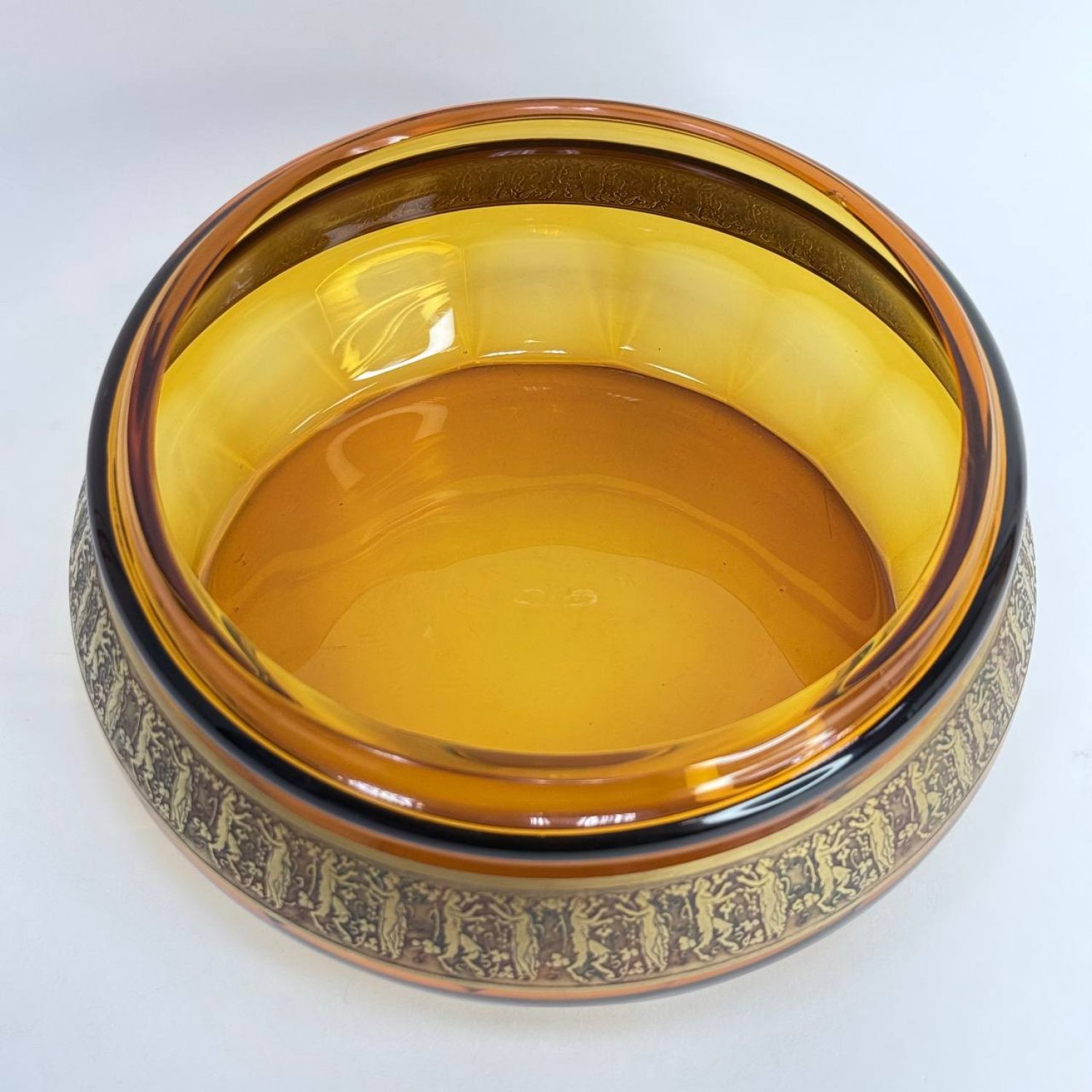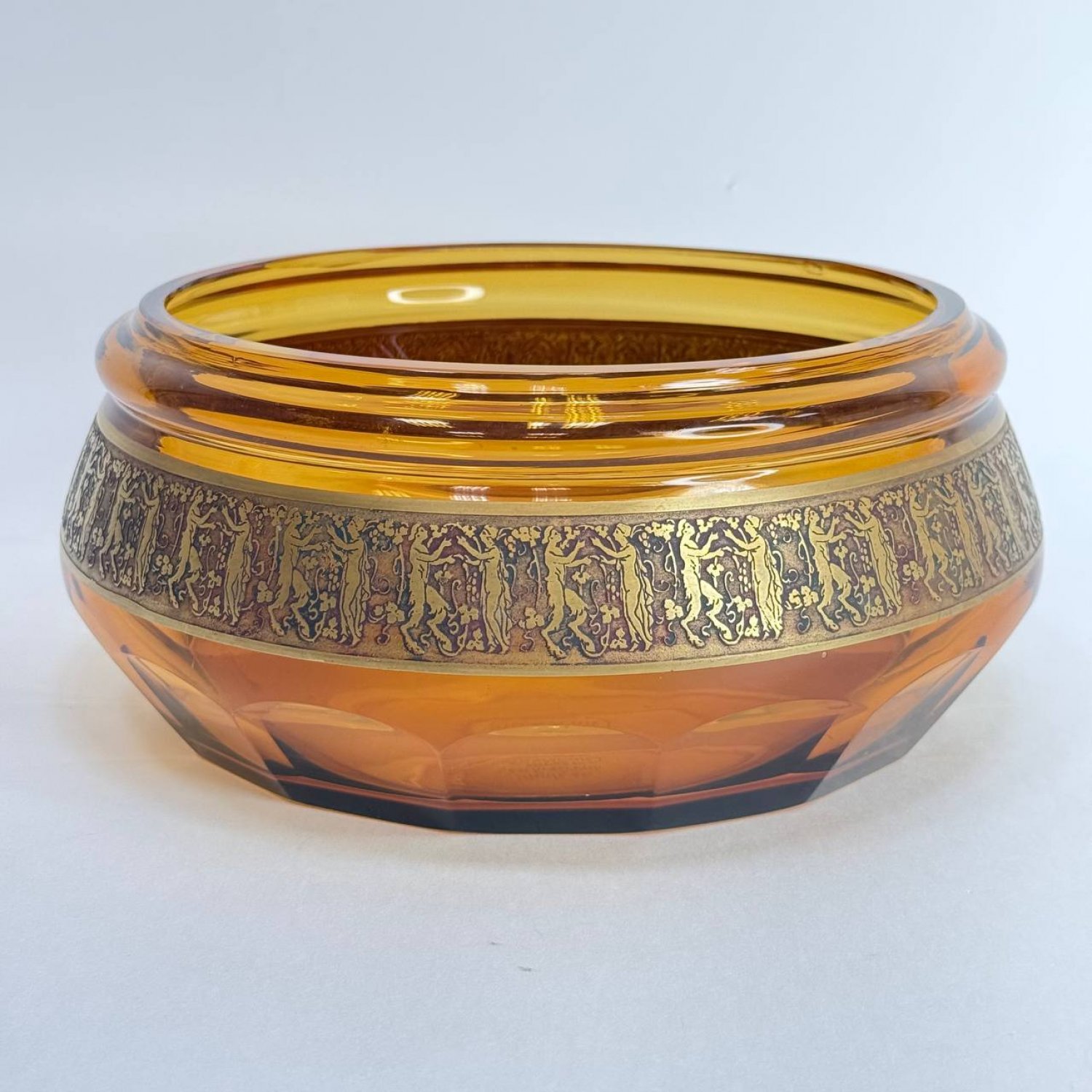 Чаша из янтарного стекла Мозер, Карлсбад, обрамленная лентой в технике травления золотом с изображением пар сатиров и нимф. Клеймо:"Сделано в Чехословакии, Мозер в Карсбаде"