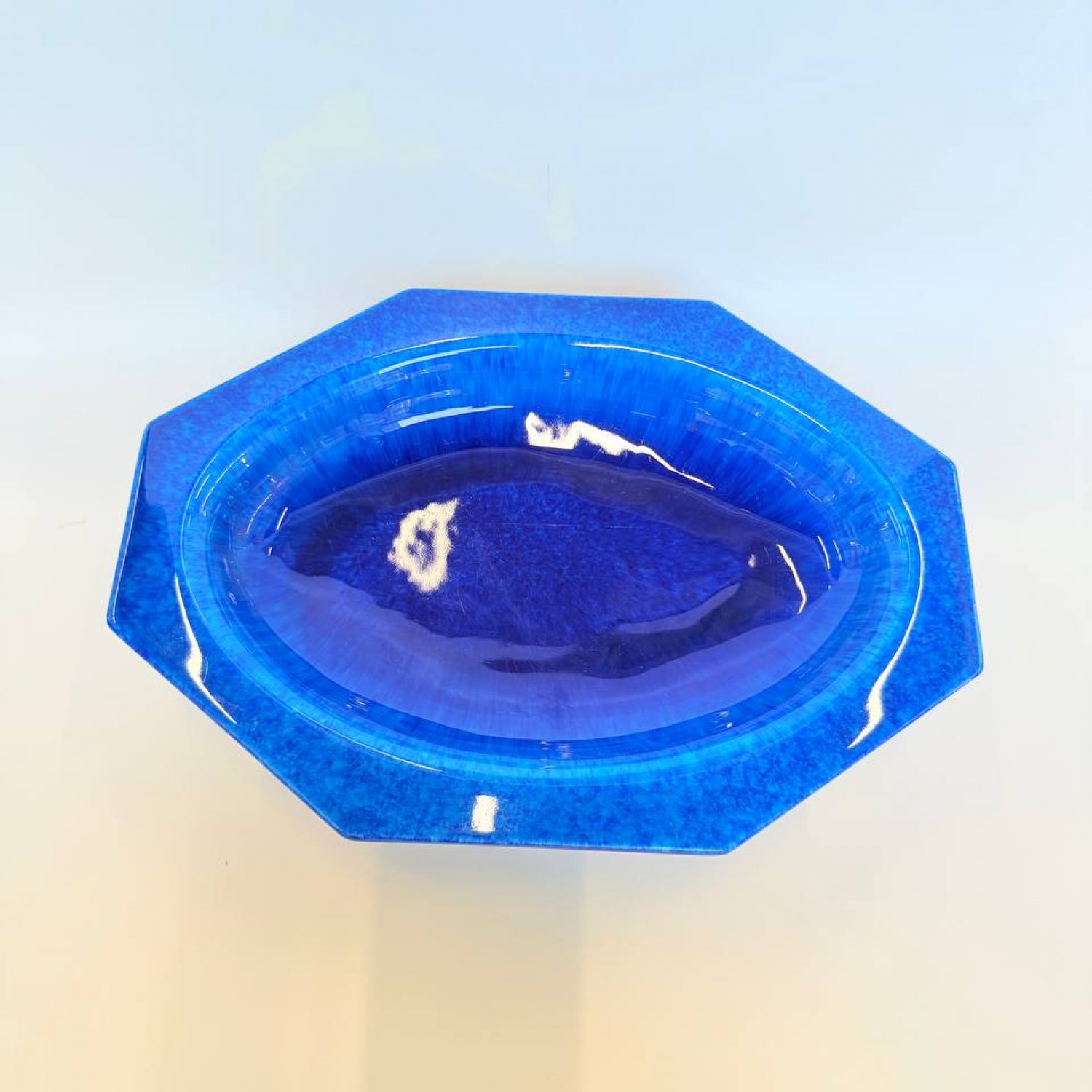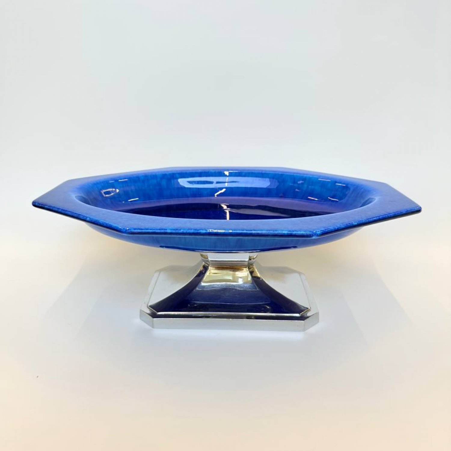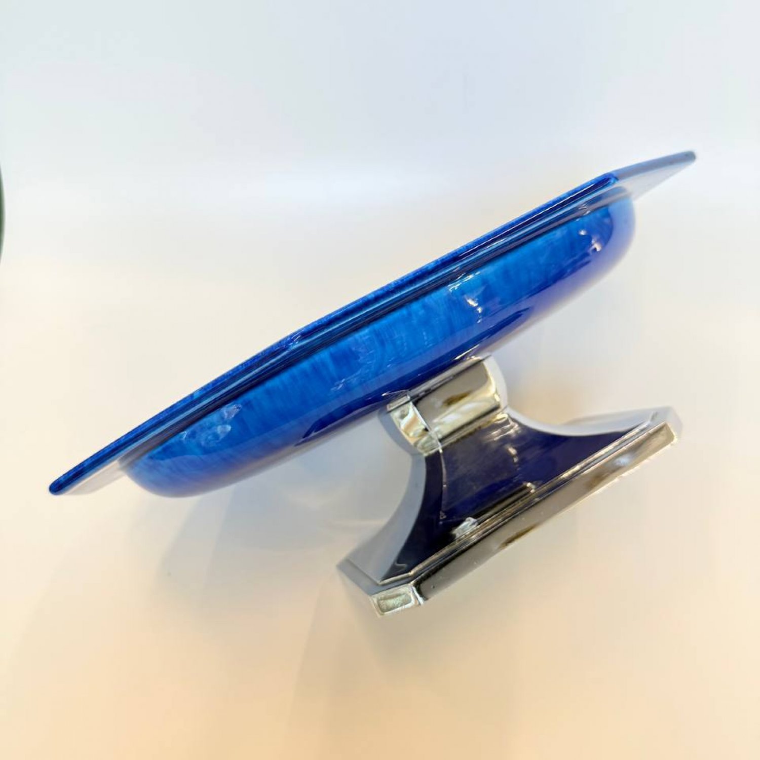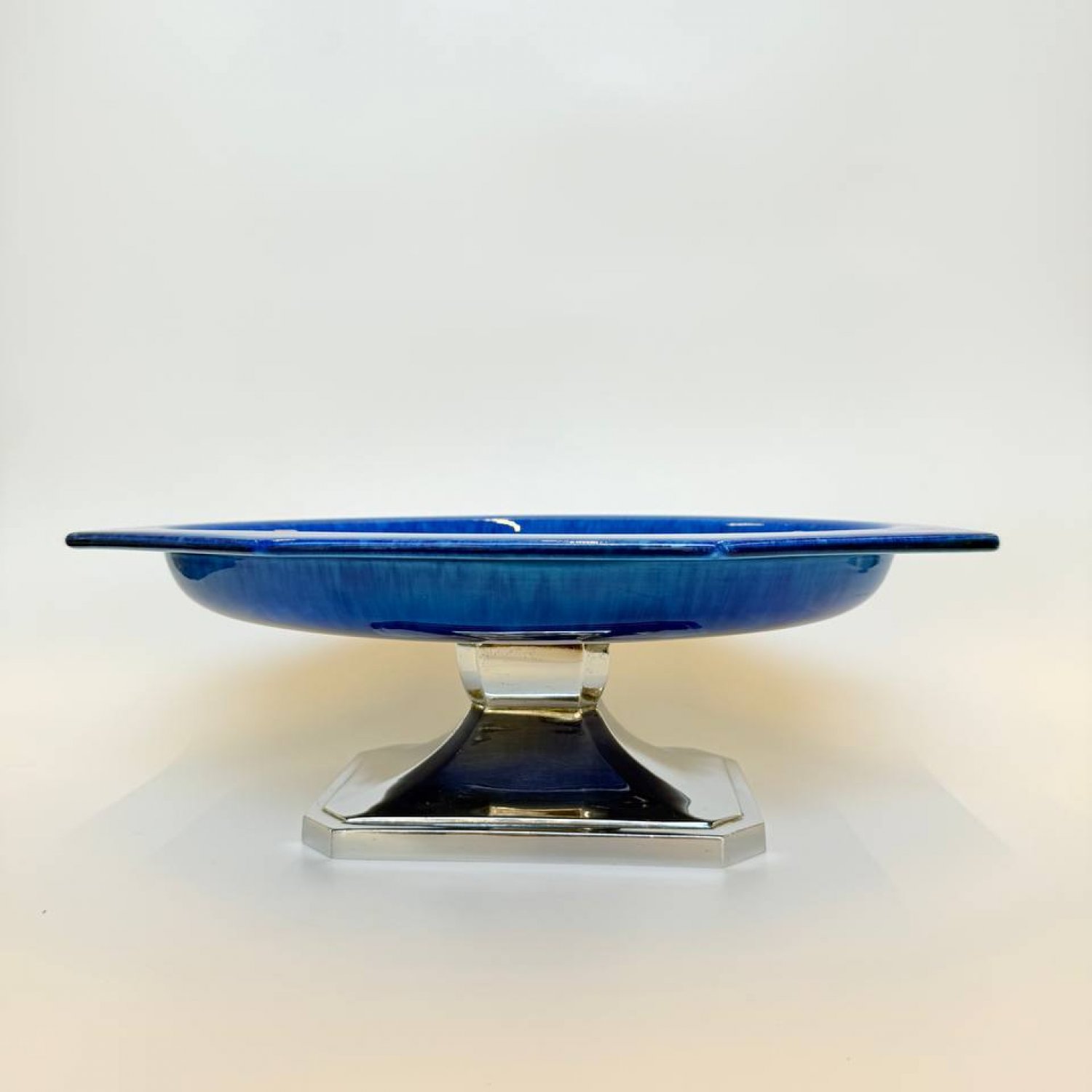Ваза на ножке из глазурованного фаянса синего цвета с никелированным латунным основанием.