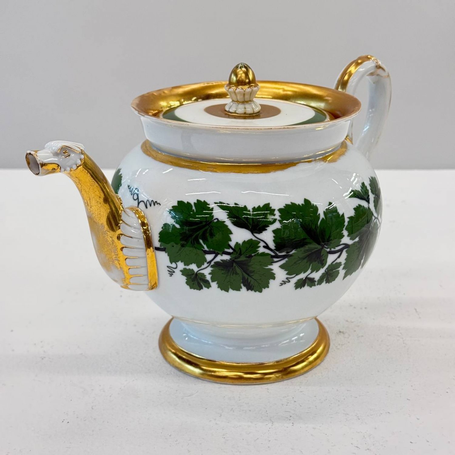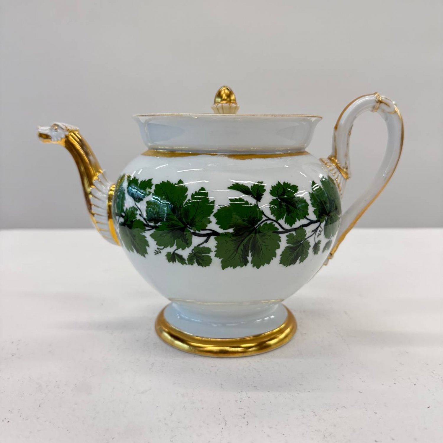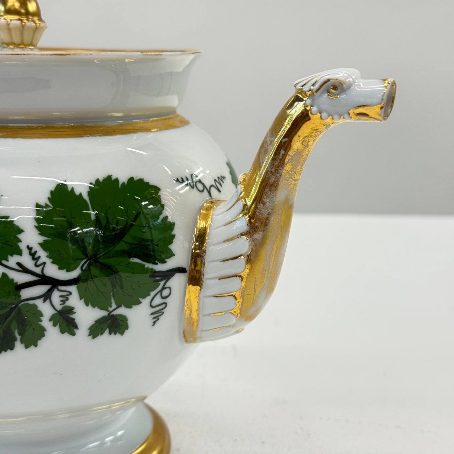 Чайник Meissen начало 19 века Германия фарфор,роспись монохромная в зеленых оттенках в виде гирлянды из зеленой виноградной лозы и носика в виде дракона.Золочение.Высокопрофессиональная реставрация сколов