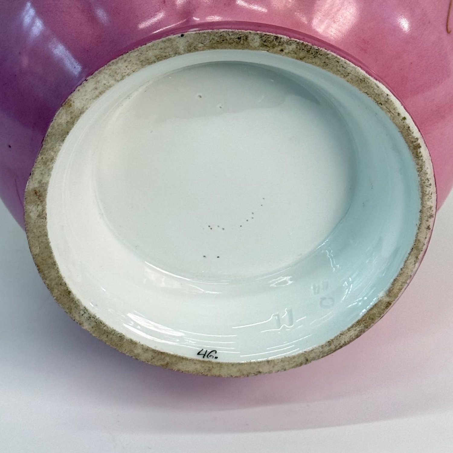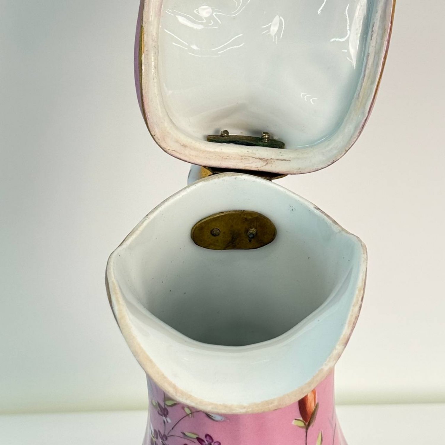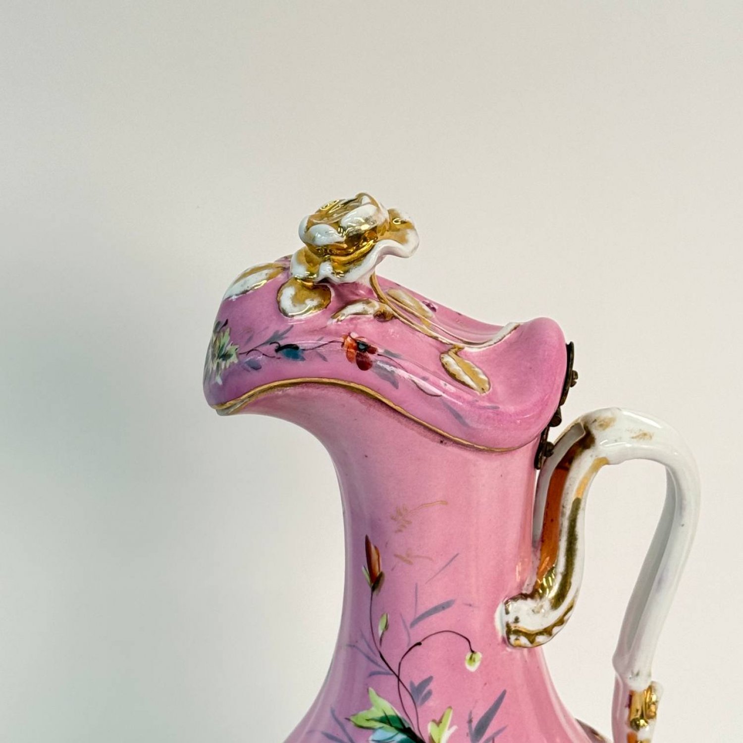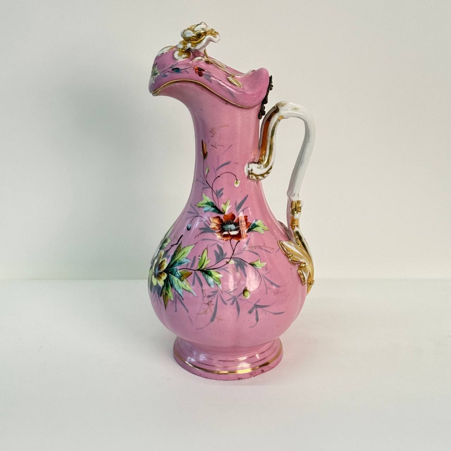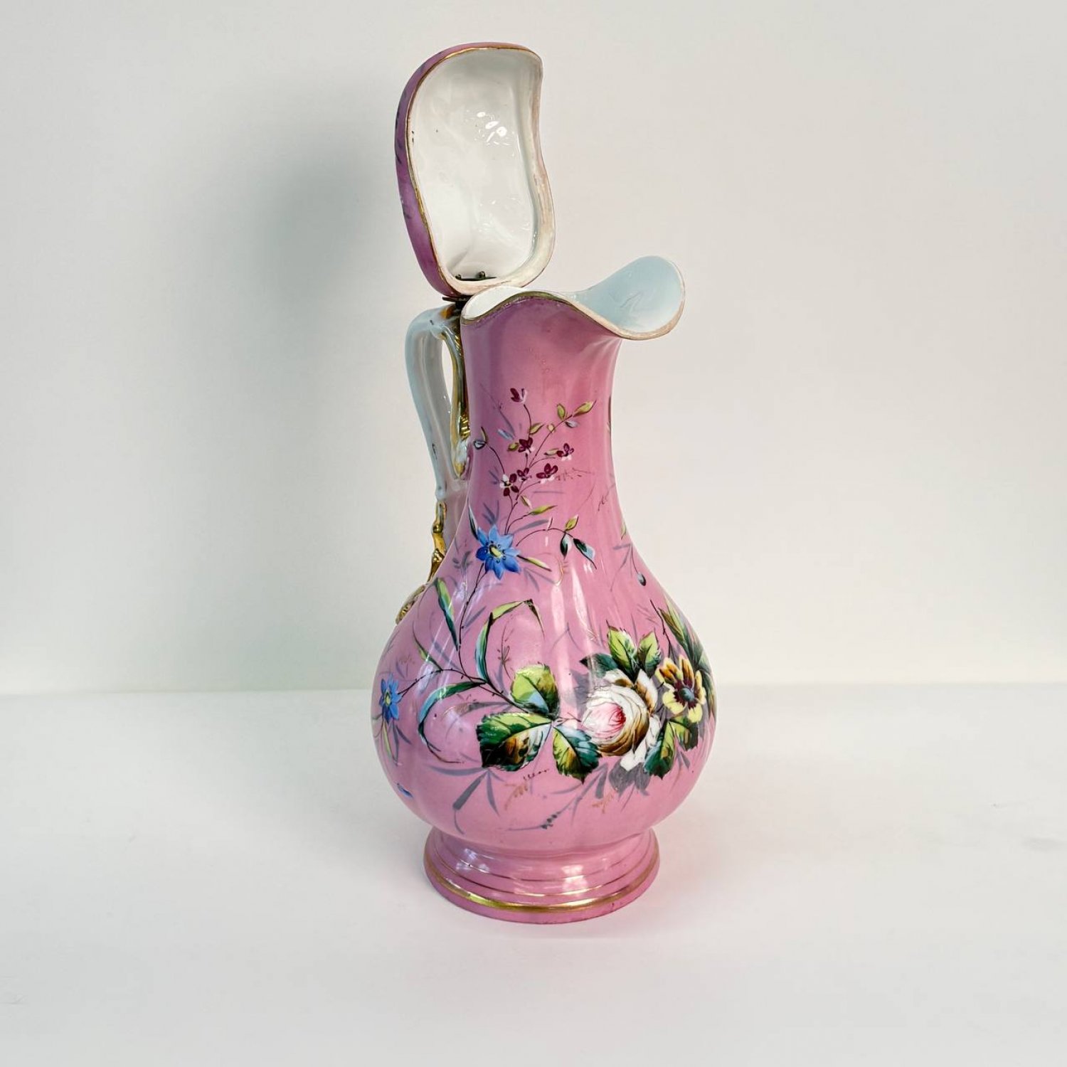 Старинный кувшин с крышкой для воды, умывания , Франция ,вторая половина 19 века. Крытье розового цвета, роспись полихромная надглазурная, цветы. Скульптурная ручка с листом , с золочением . Хваток крышки в виде розы с золочением. Крышка соединена с посредством крепления из латуни