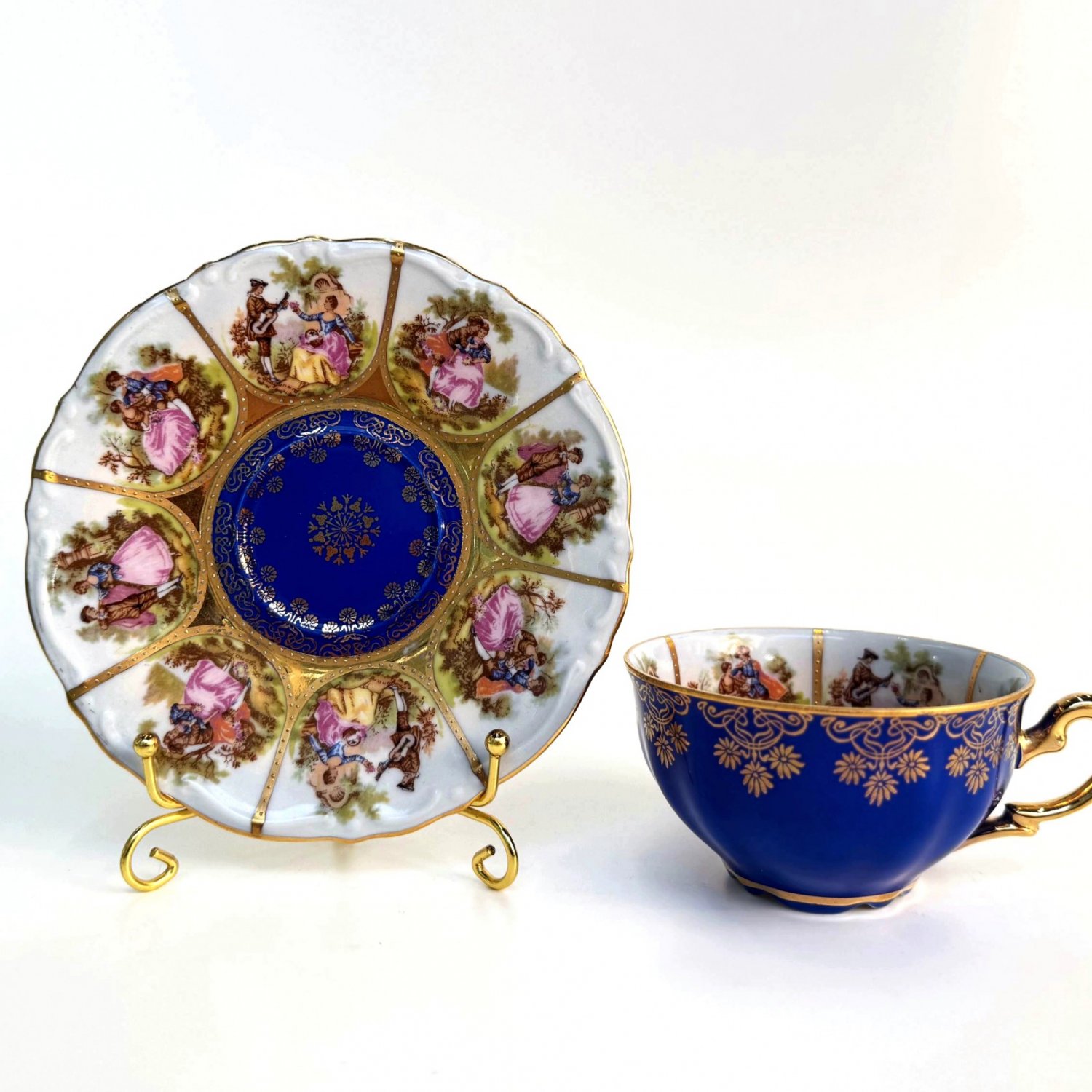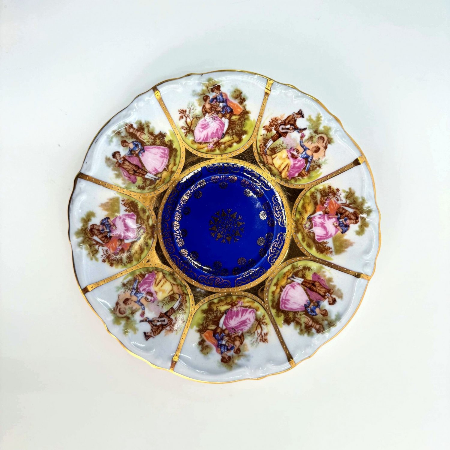 Декор: деколь с подрисовкой  с обильным золочением, многоцветные картуши в стиле рококо с романтическими сценами в духе Франсуа Буше или «courting couples» — типичный мотив для баварского и карлсбадского фарфора середины XX века