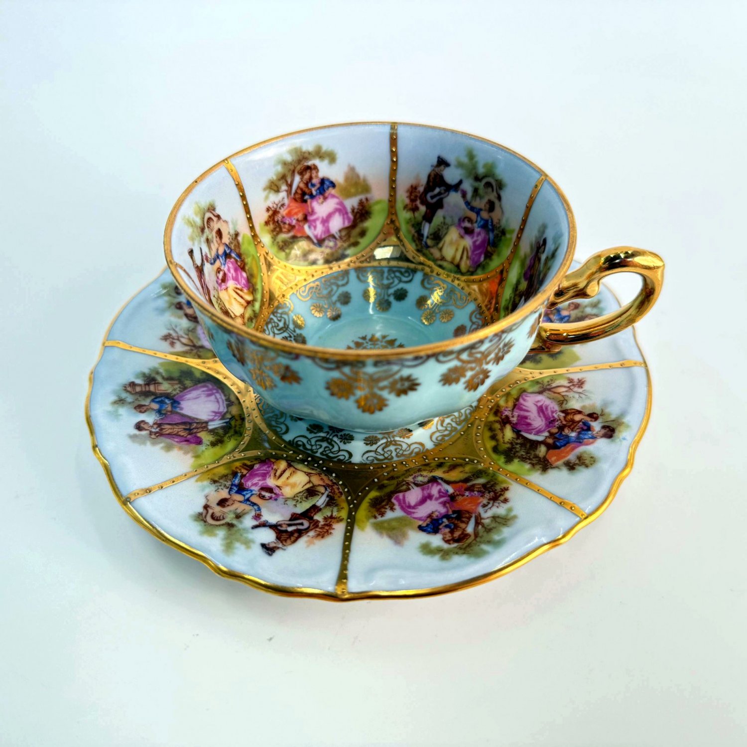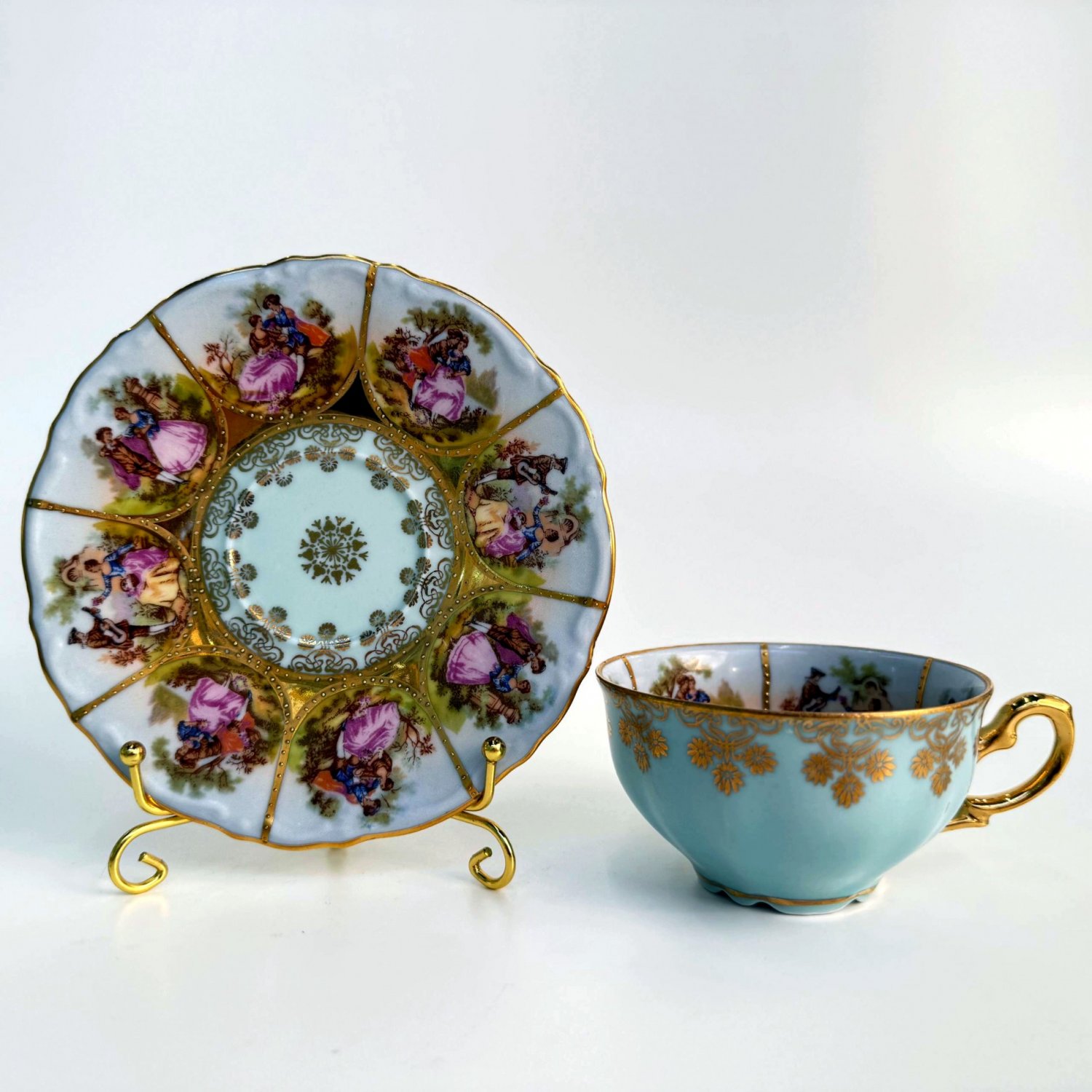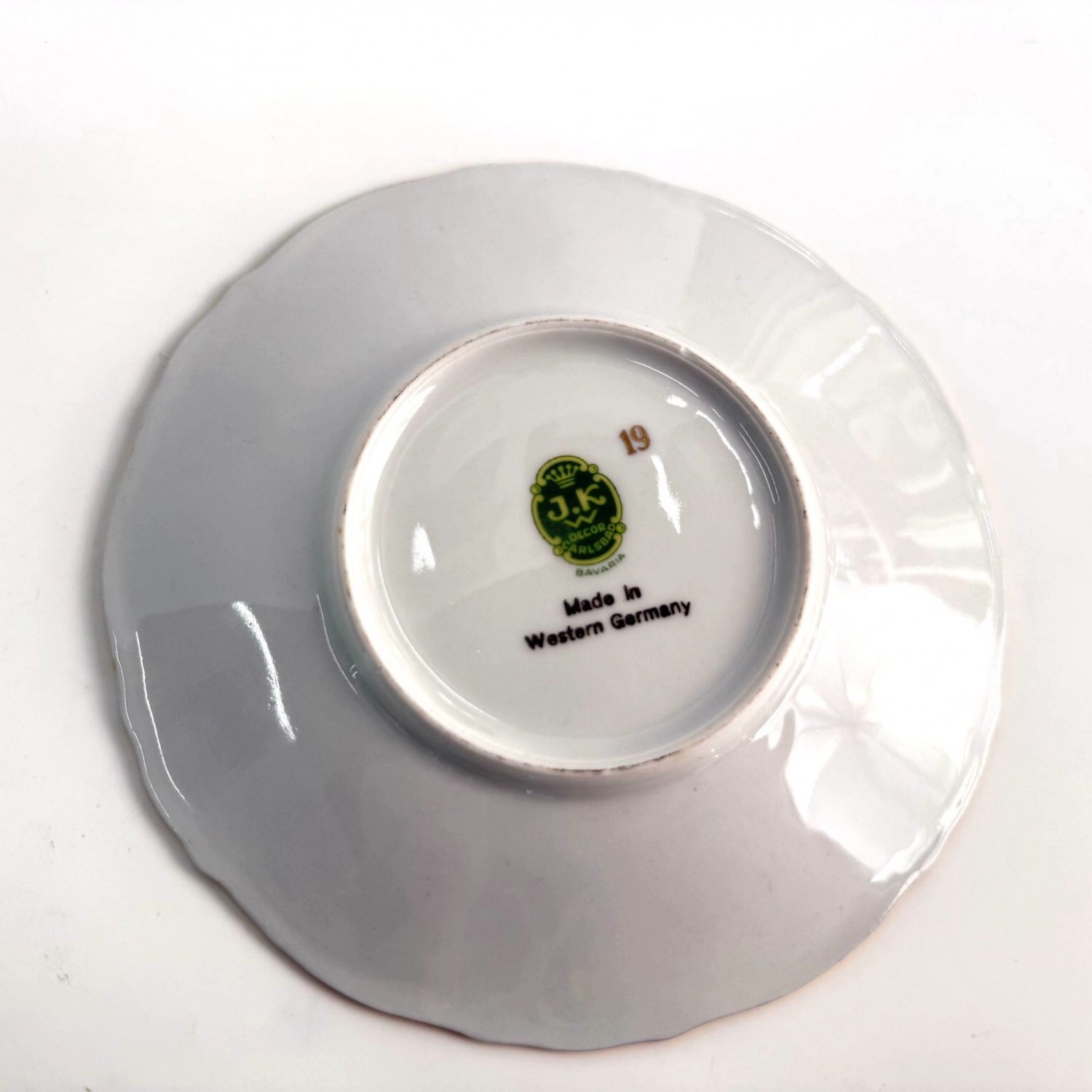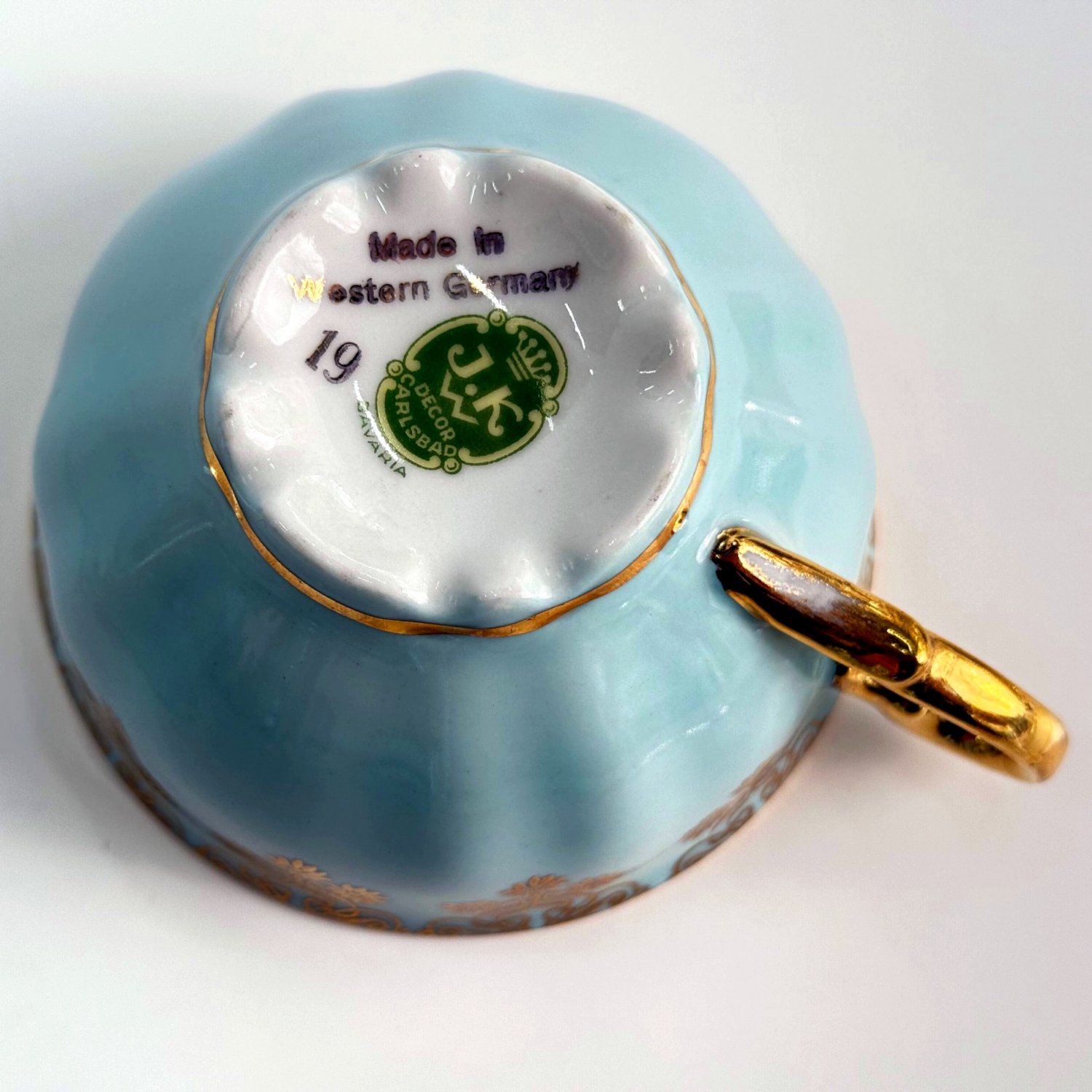 Фарфоровый чайный дуэт (чашка и блюдце) марки J.K. Decor Carlsbad Bavaria, произведённый в Западной Германии (Western Germany) — время выпуска ориентировочно 1950-е–1970-е годы.
