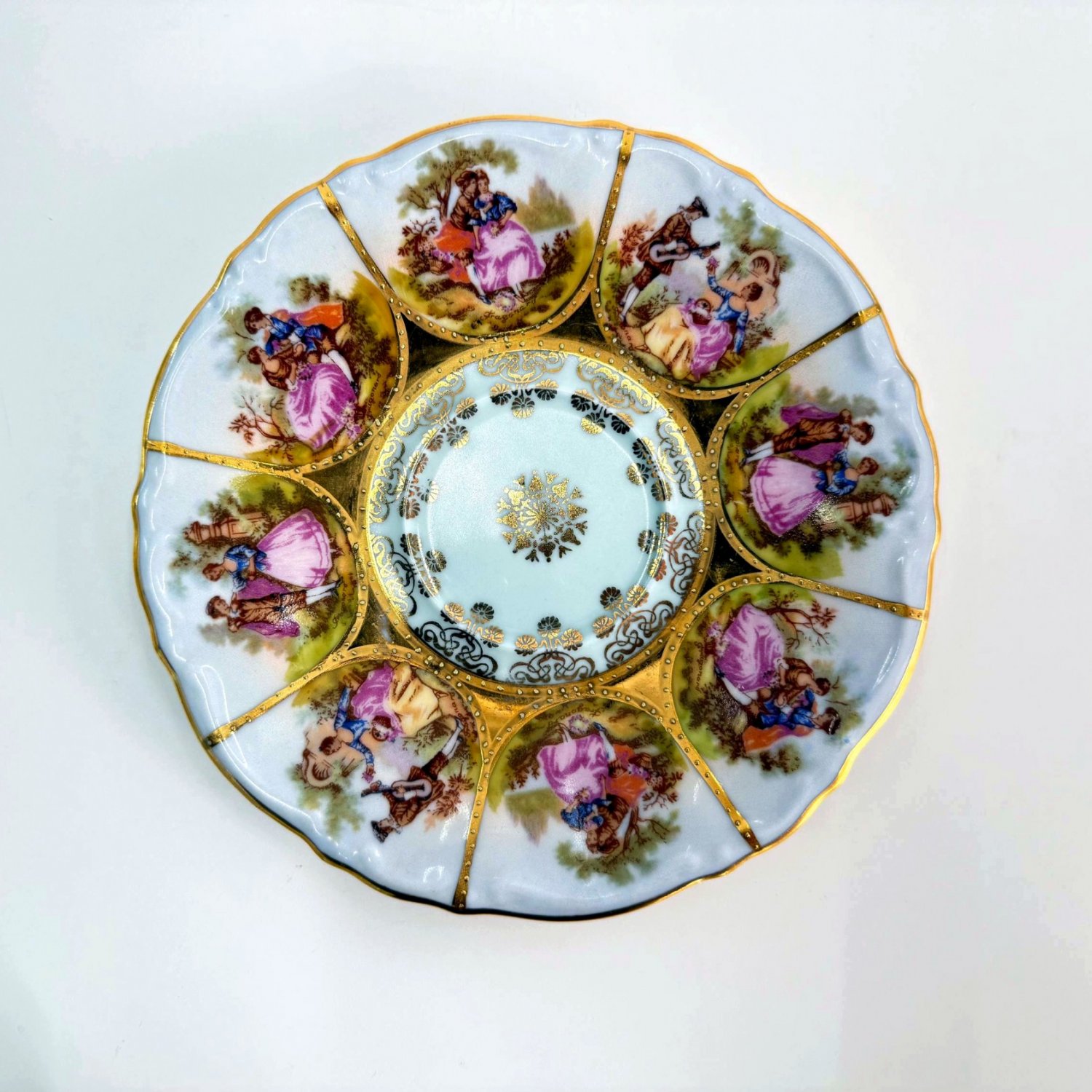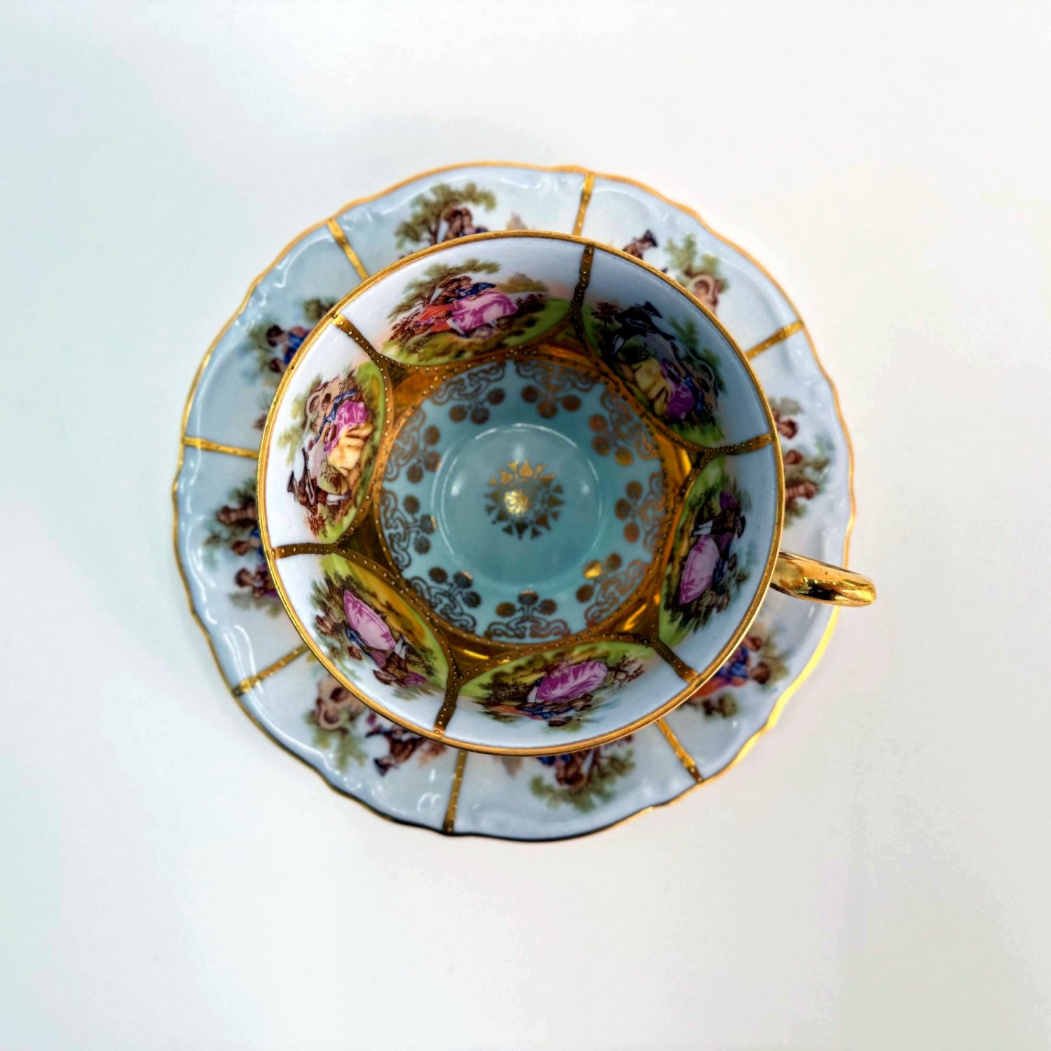 Декор: деколь с подрисовкой  с обильным золочением, многоцветные картуши в стиле рококо с романтическими сценами в духе Франсуа Буше или «courting couples» — типичный мотив для баварского и карлсбадского фарфора середины XX века