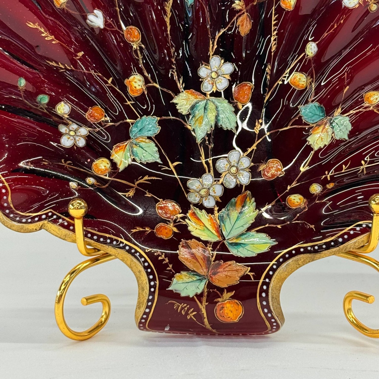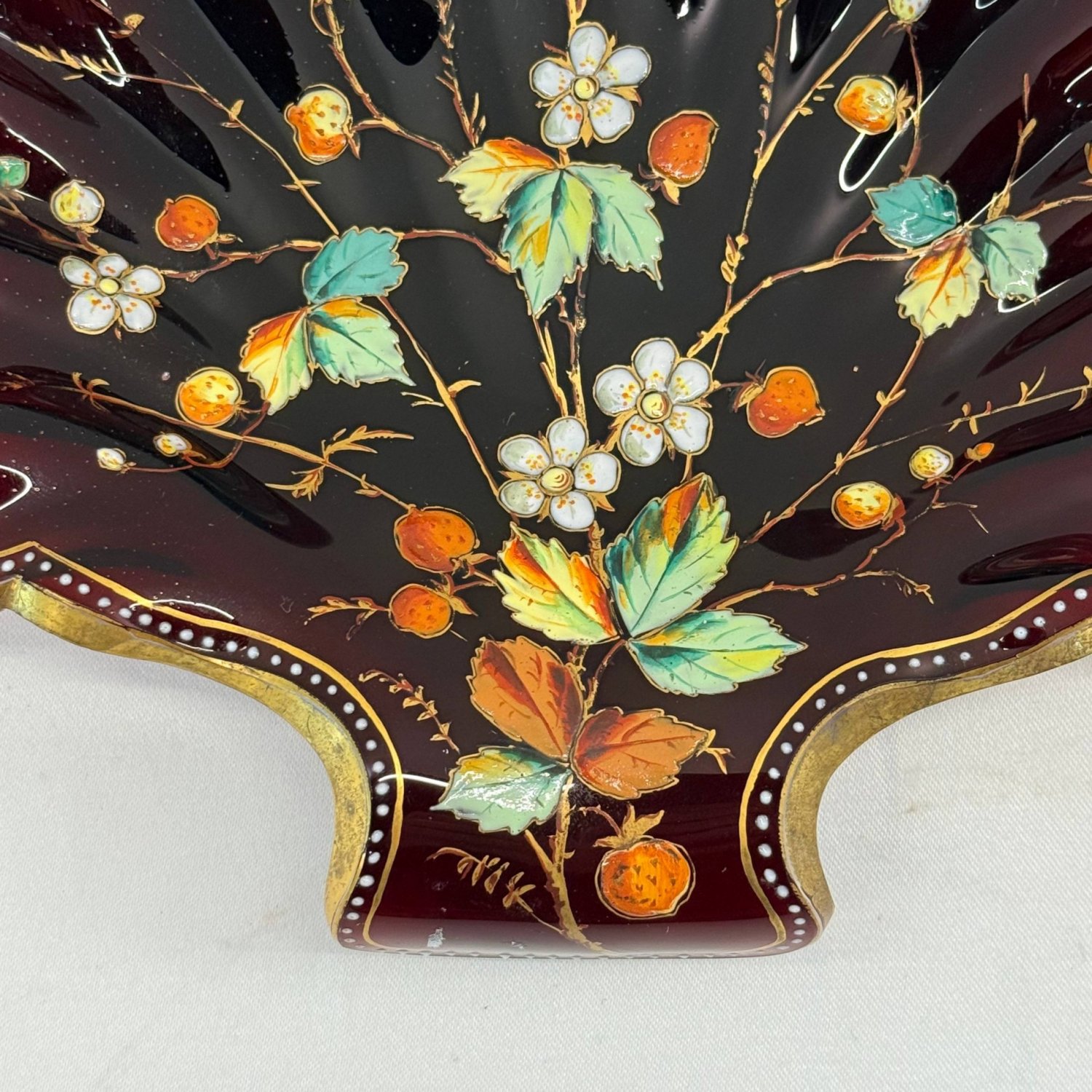 Стекло глубокого рубинового цвета, покрытое толстой эмалью с изображением клубники, цветов и лоз.