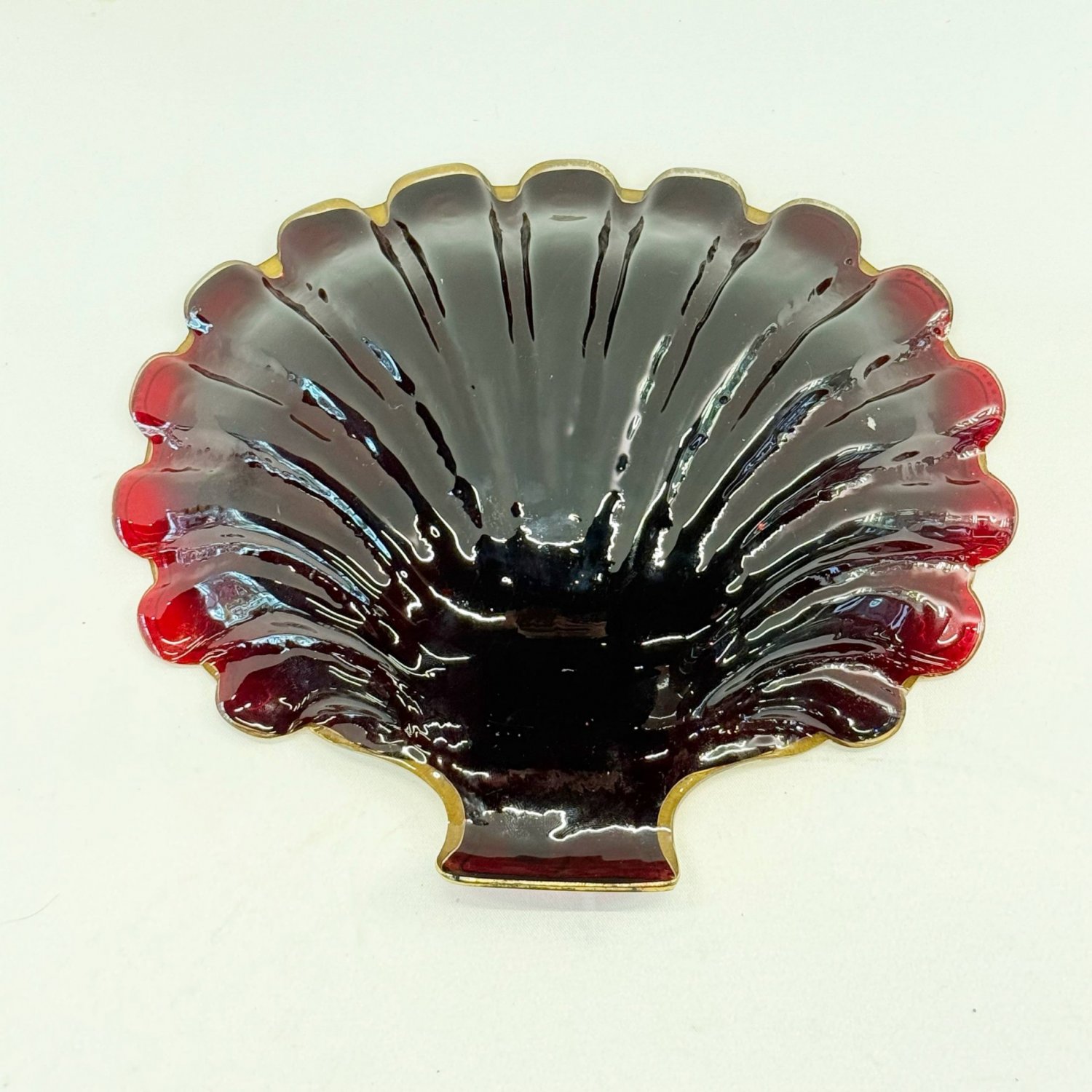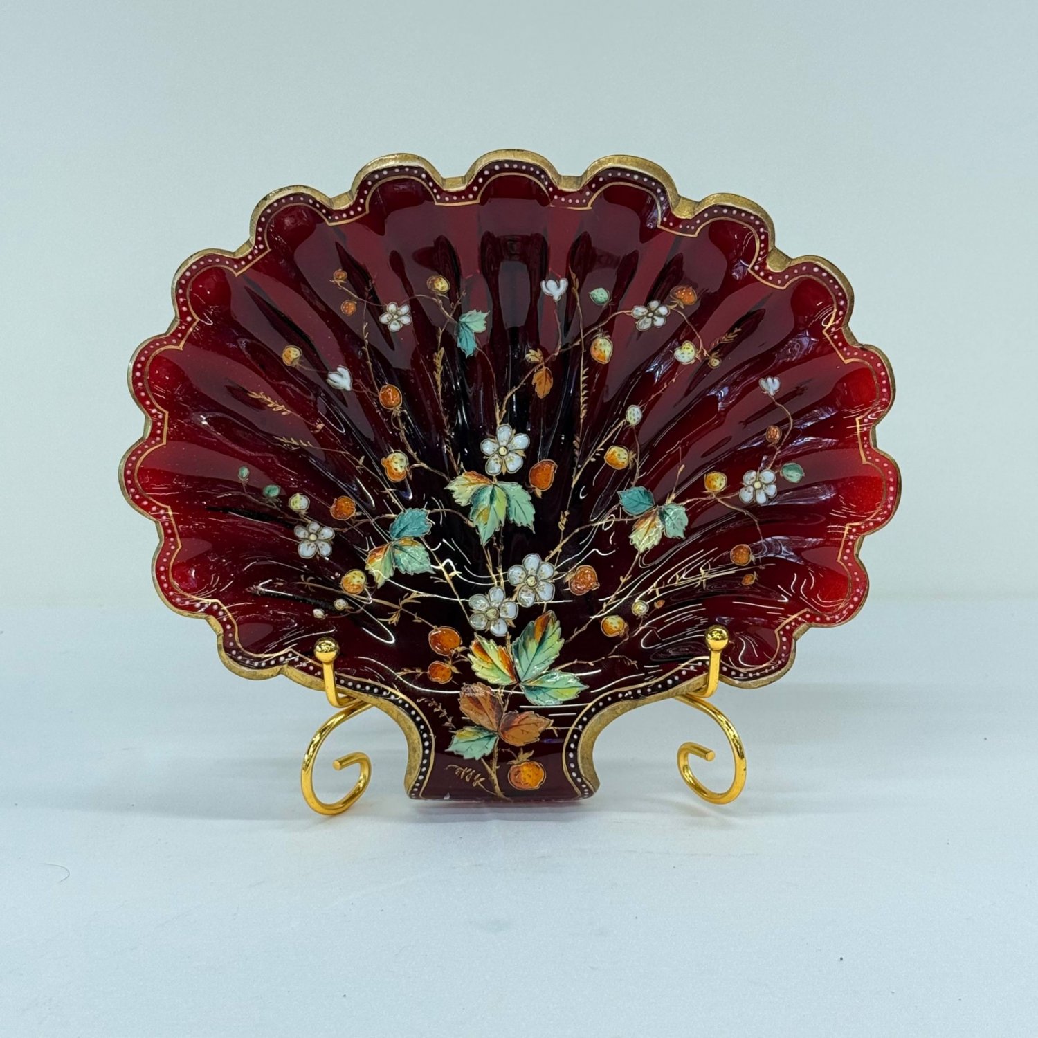 Старинная богемская эмалированная тарелка в форме раковины из рубинового стекла, изготовленная компанией Moser в конце 1800-х годов.