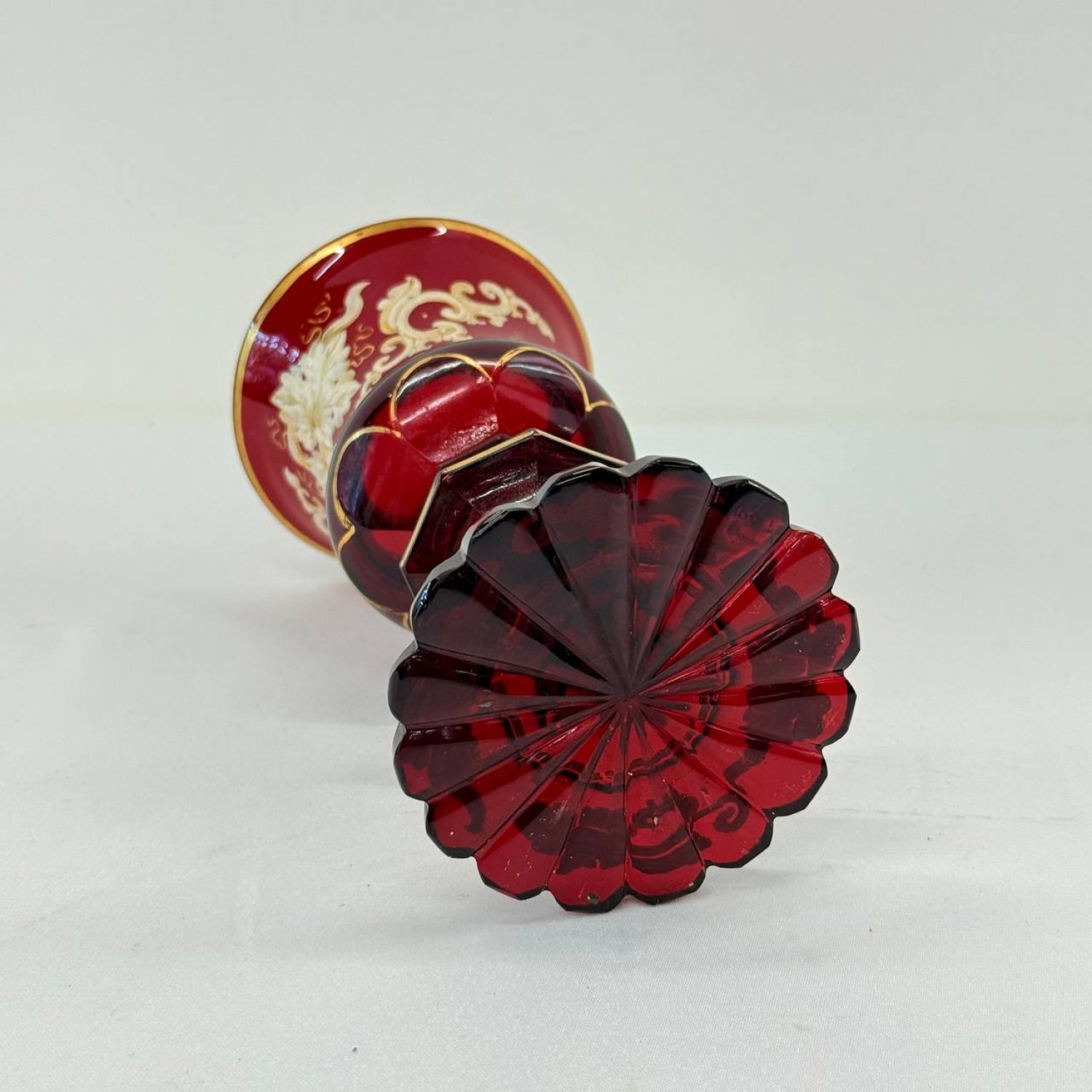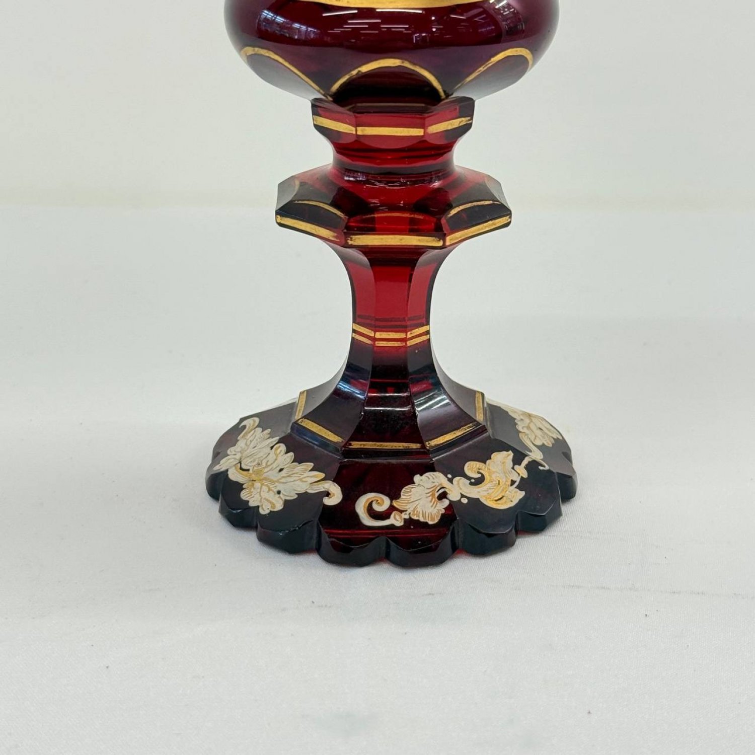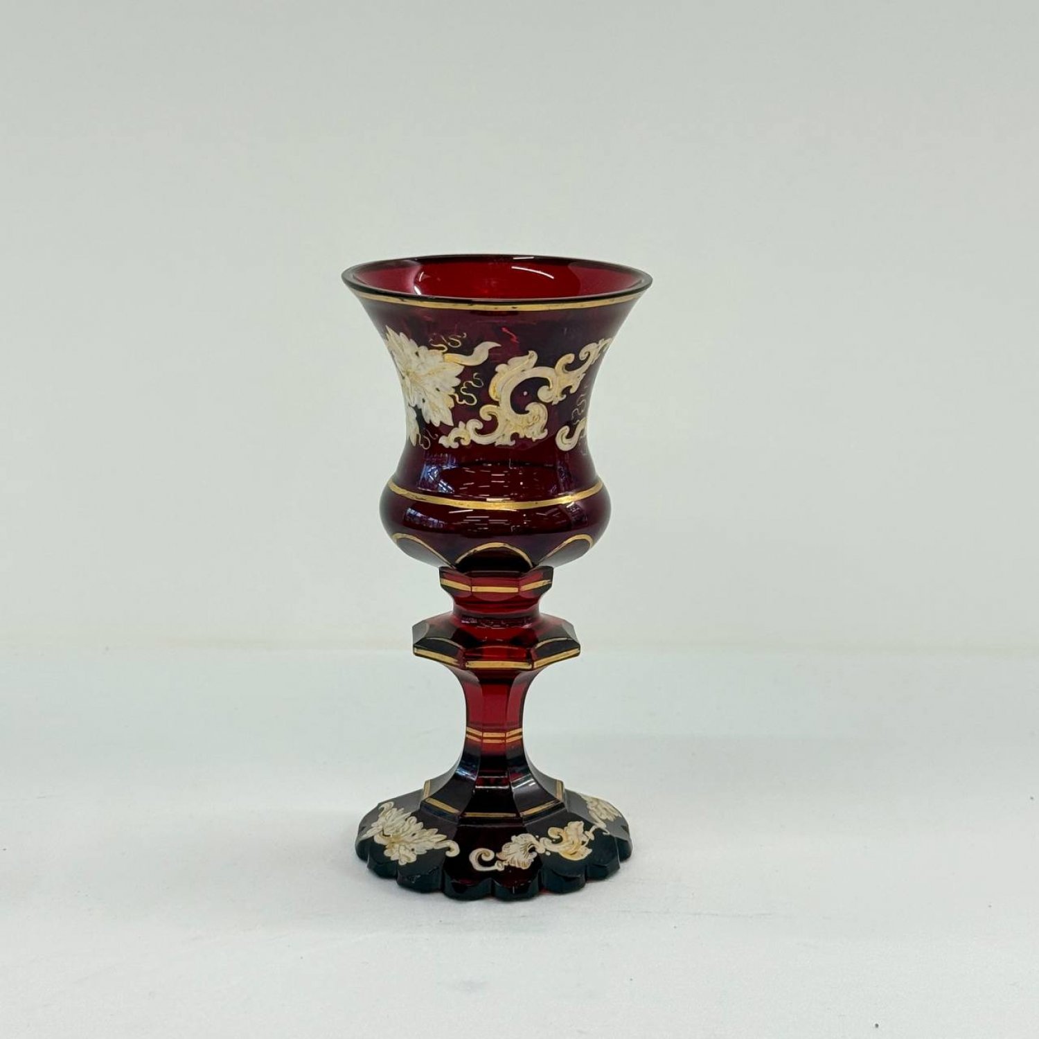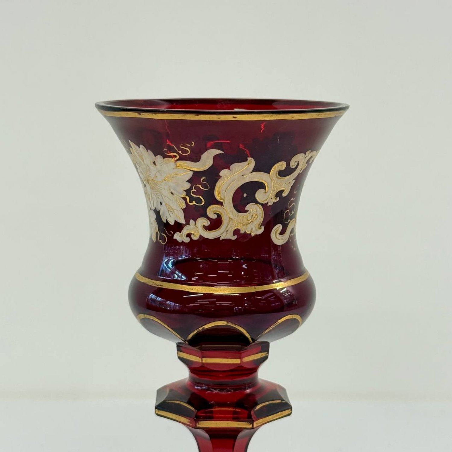 Старинный крупный бокал из рубинового стекла, Богемия , 1860 гг, с чашей в форме чертополоха на филенчатой ножке с широким резным граненым воротничком и фестончатым основанием, украшенный белой эмалью и позолоченным орнаментом в виде виноградной лозы. золочение .