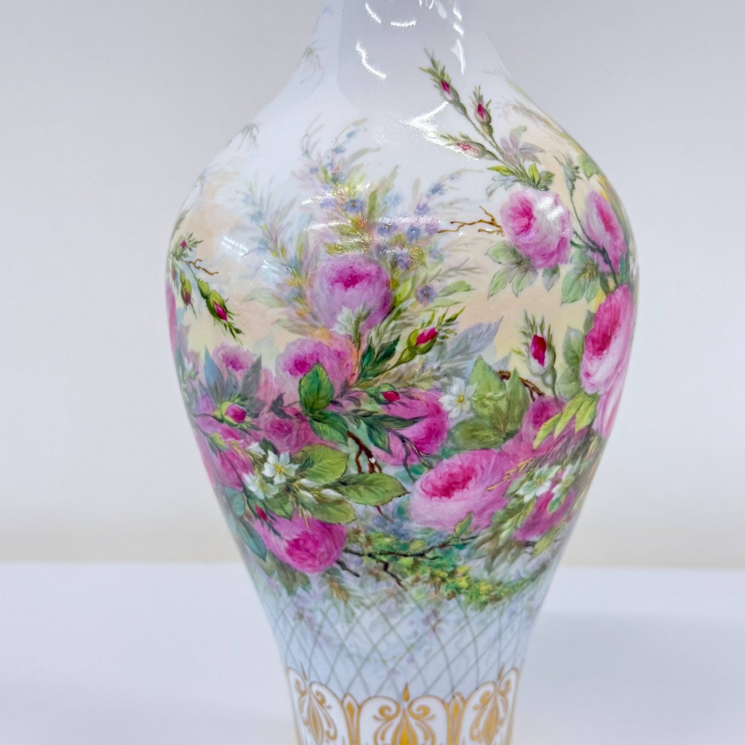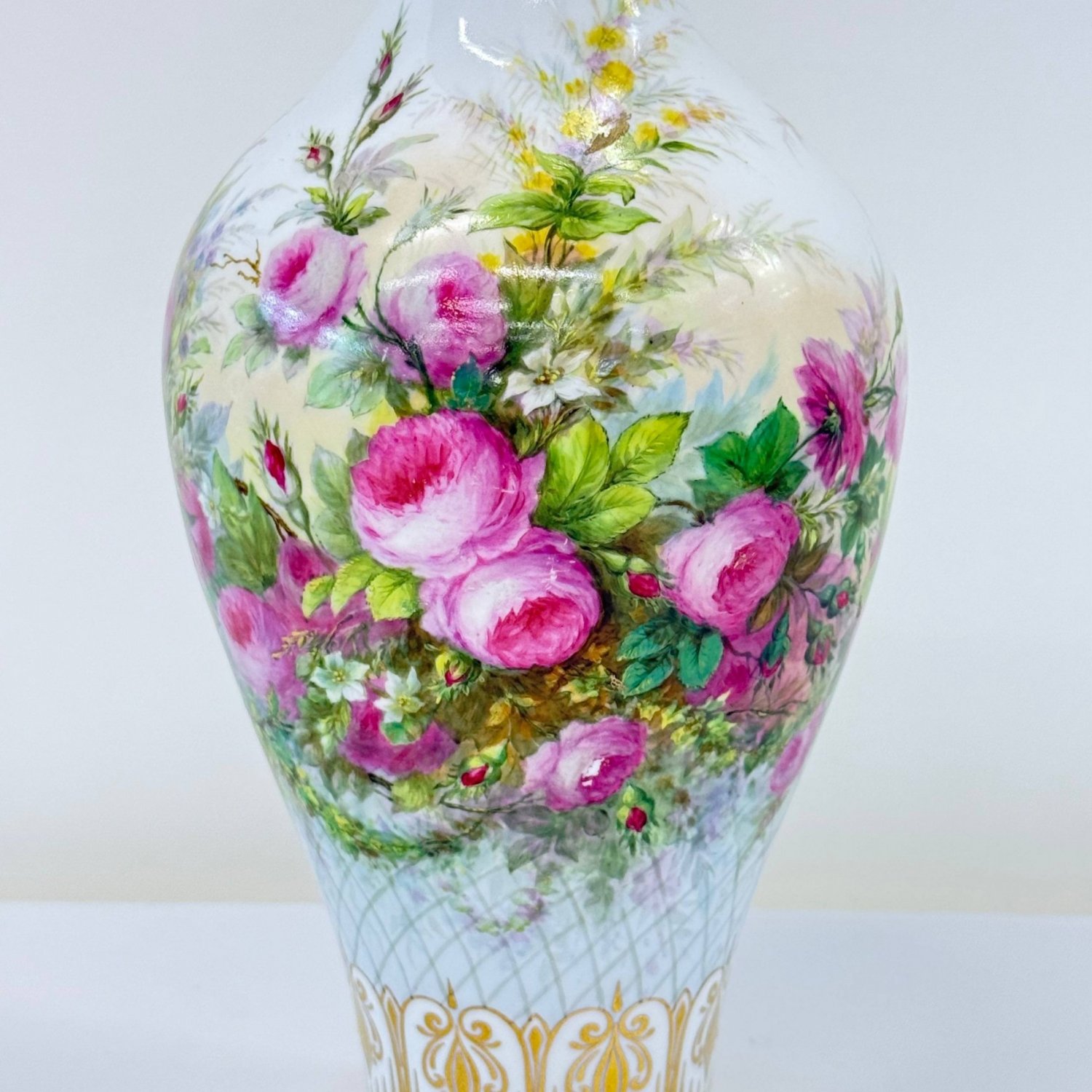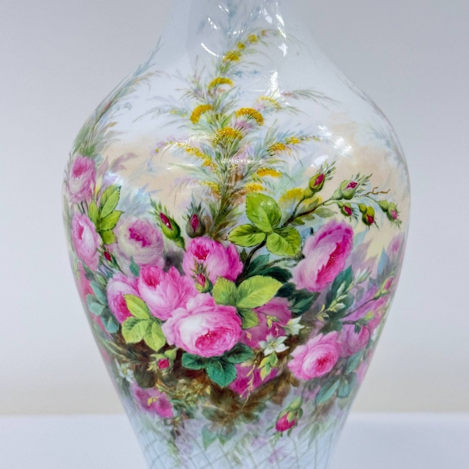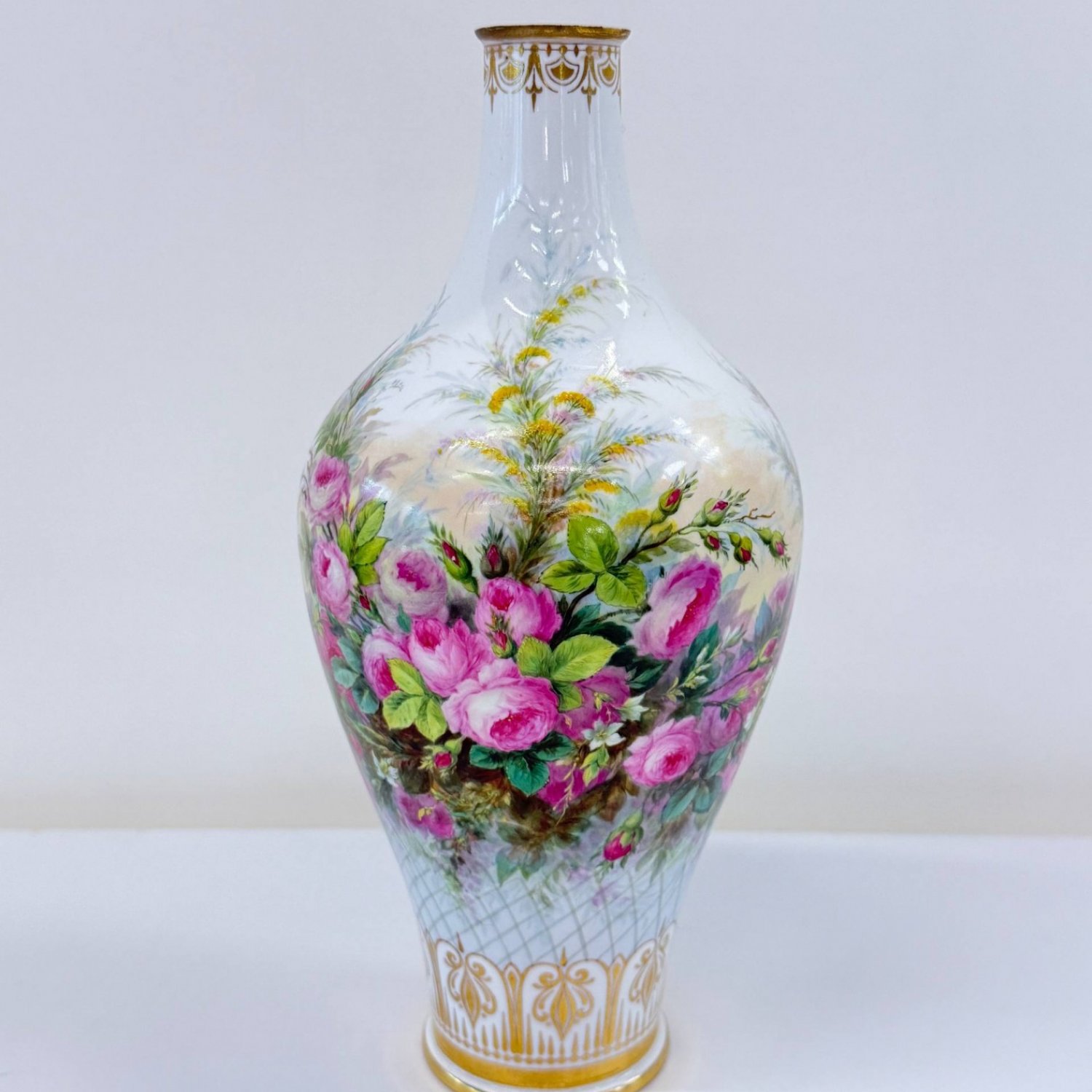 Старинная коллекционная ваза , Sevres 1864 год, декорирована 1865 год., фарфор Франция . Надглазурная полихромная роспись- розы -цветы и бутоны,клематисы, ветки хедеры. Роспись золотом на горлышке и основании вазы. Клеймо красное - декор Севра 1865 год, клеймо зеленое -64 , белье создано в 1864 году на мануфактуре Севр . Автор росписи Richard Eugene, 1833-1872г., по каталогу Les Marques DE SEVRES- 30cтр.