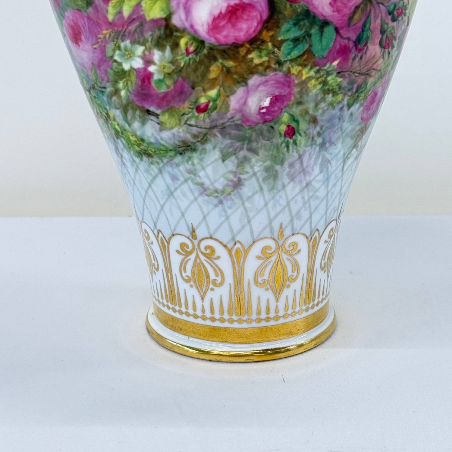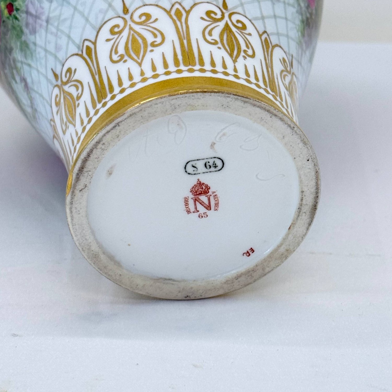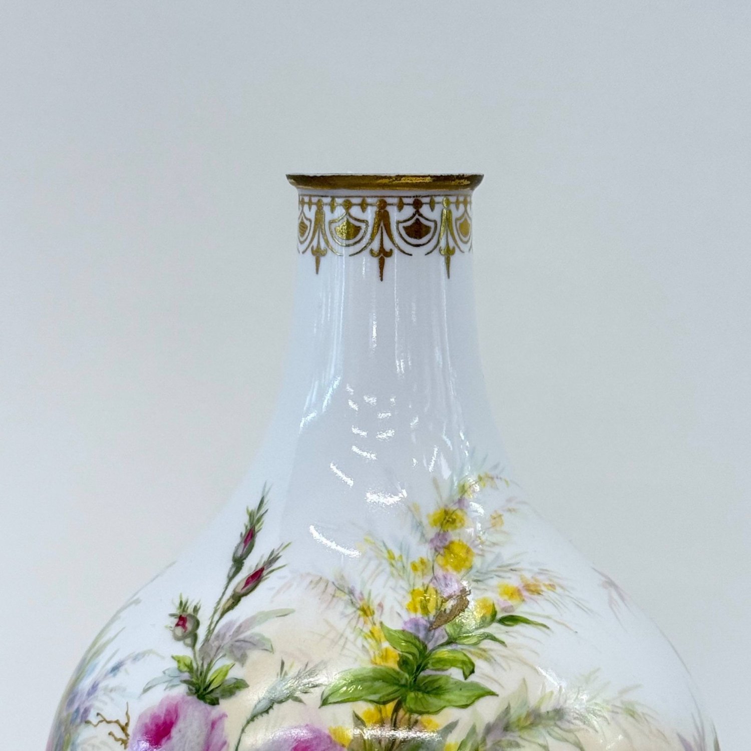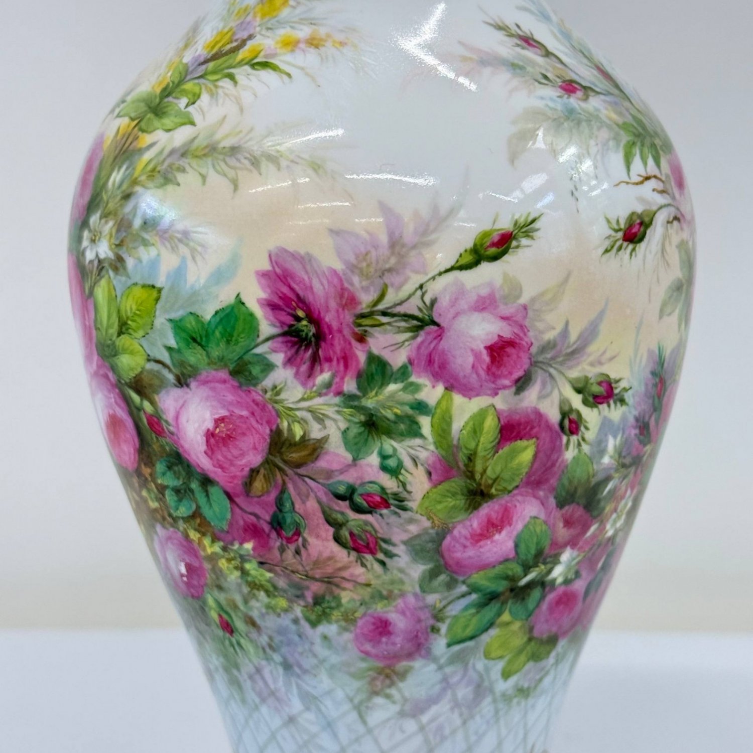 Старинная коллекционная ваза , Sevres 1864 год, декорирована 1865 год., фарфор Франция . Надглазурная полихромная роспись- розы -цветы и бутоны,клематисы, ветки хедеры. Роспись золотом на горлышке и основании вазы. Клеймо красное - декор Севра 1865 год, клеймо зеленое -64 , белье создано в 1864 году на мануфактуре Севр . Автор росписи Richard Eugene, 1833-1872г., по каталогу Les Marques DE SEVRES- 30cтр.