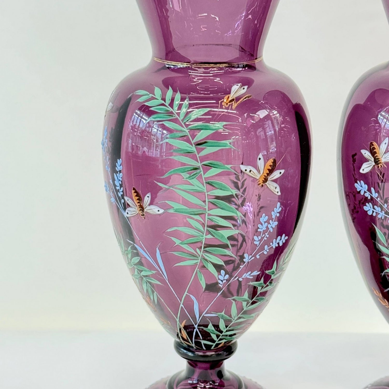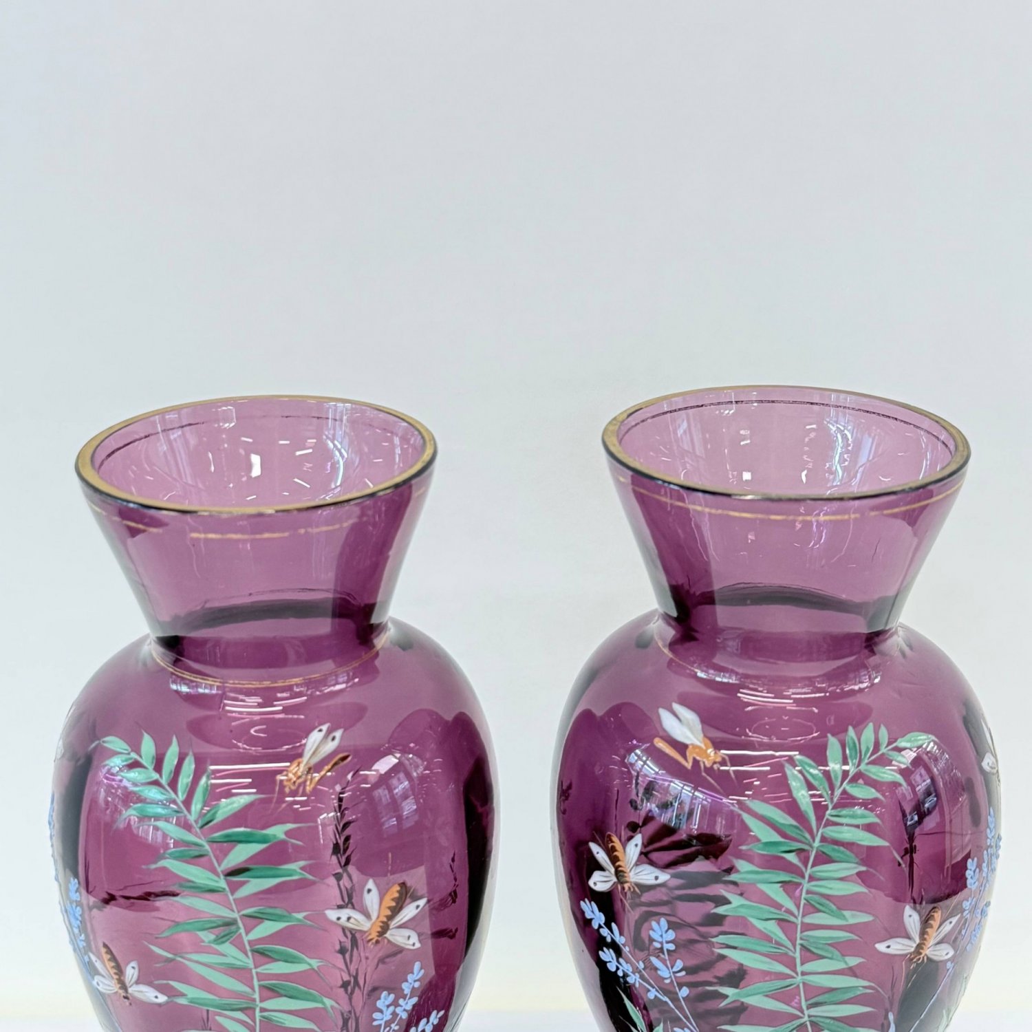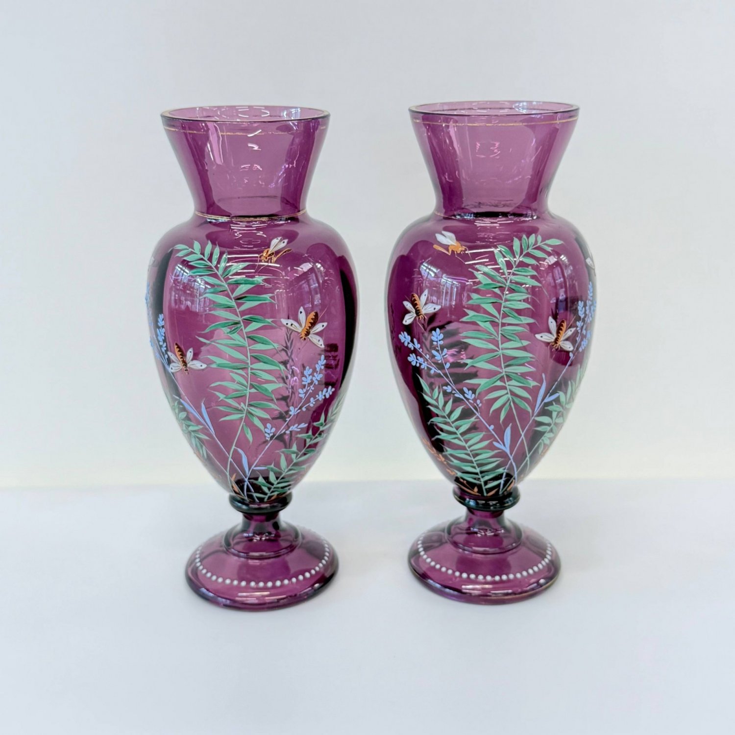 Пара ваз Moser, конец 19 века, из художественного аметистового стекла, украшенных цветными эмалями .Цвет аметистовый, с таким же цветочным орнаментом: летящие пчёлы, осы и стрекоза. Позолоченный ободок на горлышке