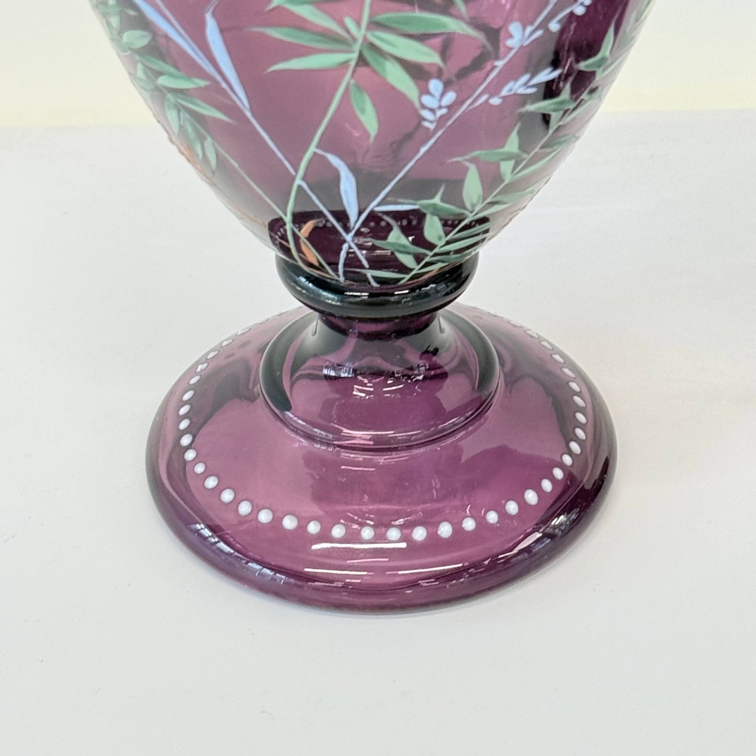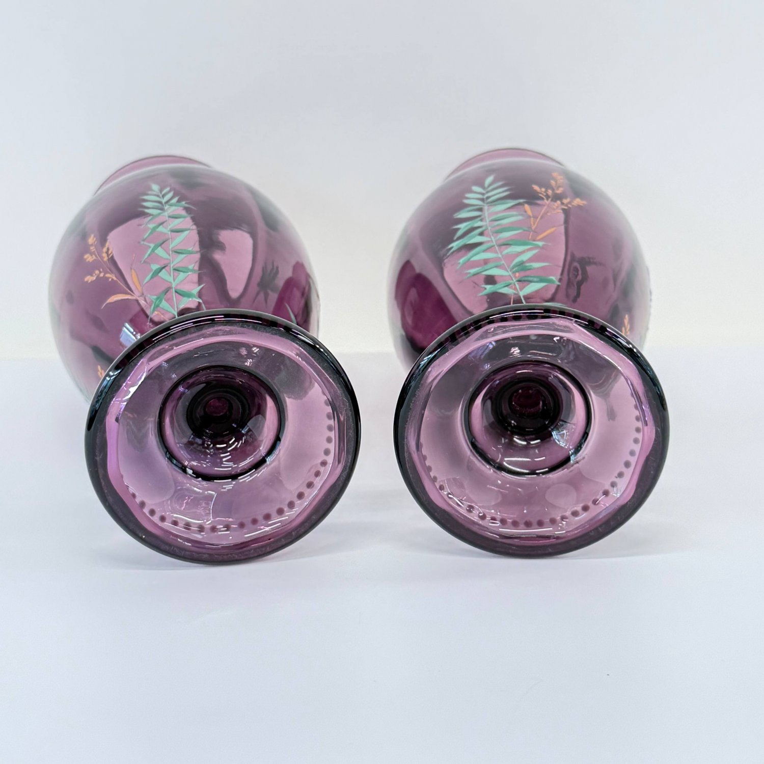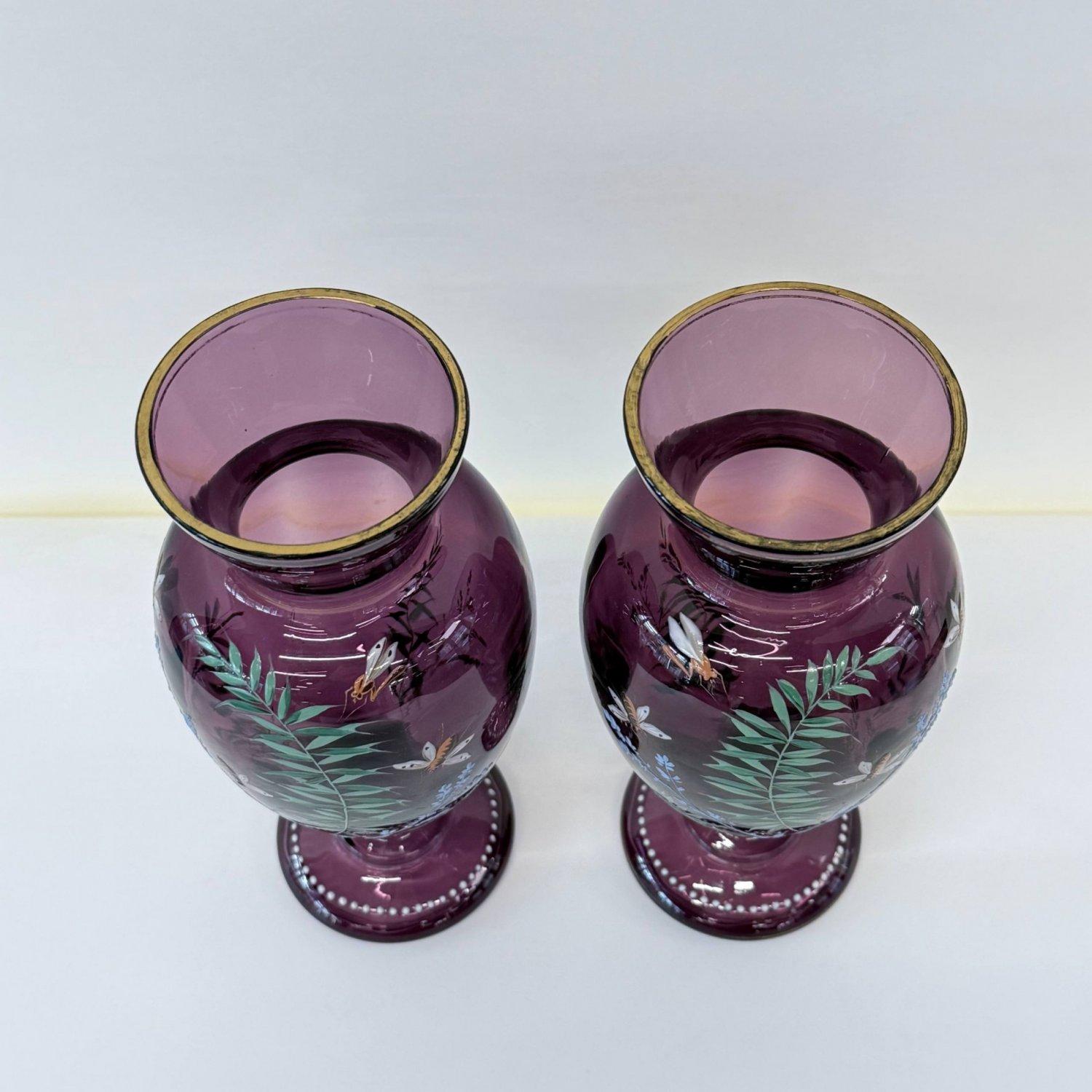 Пара ваз Moser, конец 19 века, из художественного аметистового стекла, украшенных цветными эмалями .Цвет аметистовый, с таким же цветочным орнаментом: летящие пчёлы, осы и стрекоза. Позолоченный ободок на горлышке