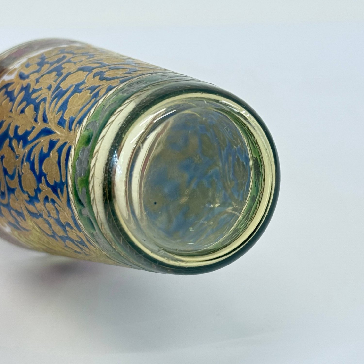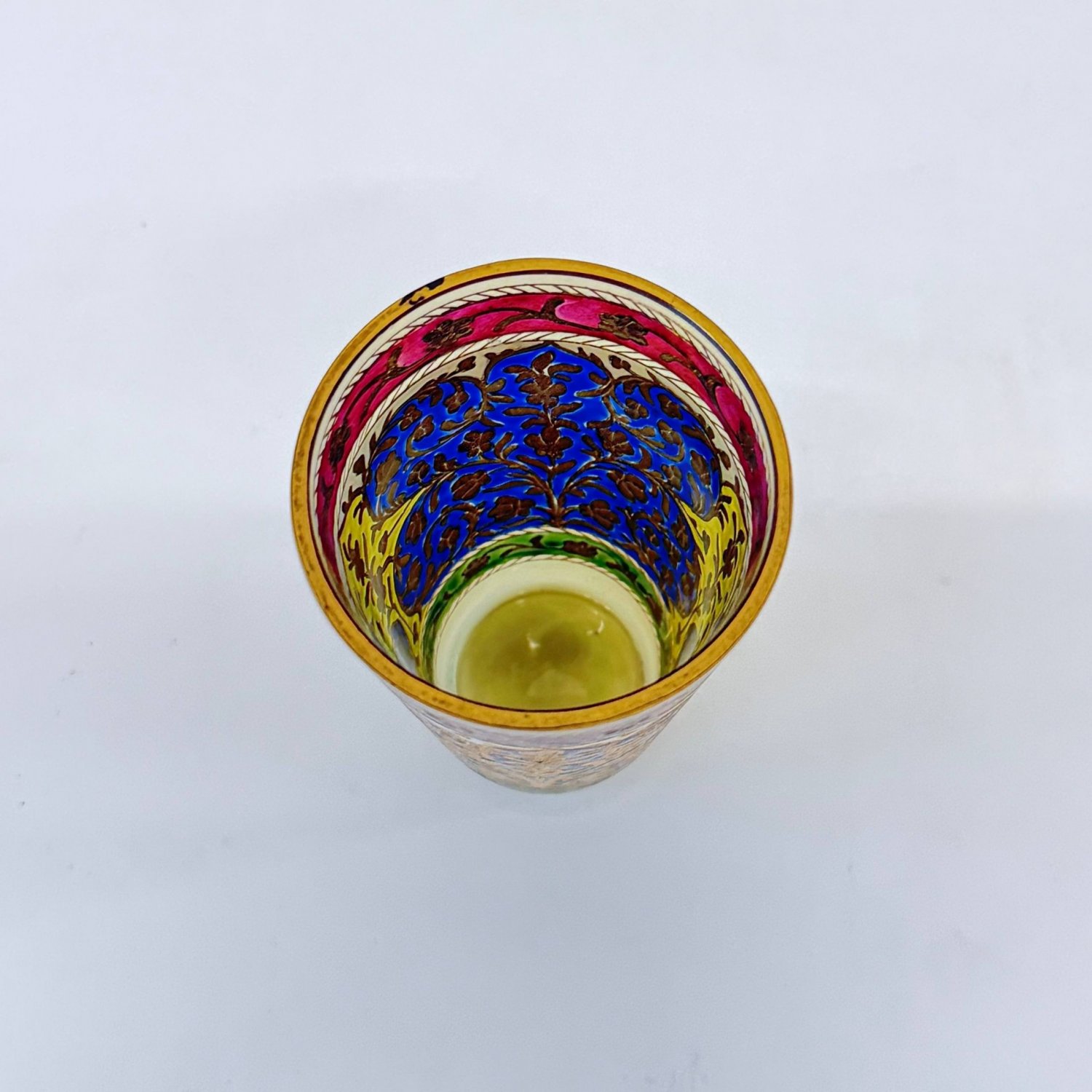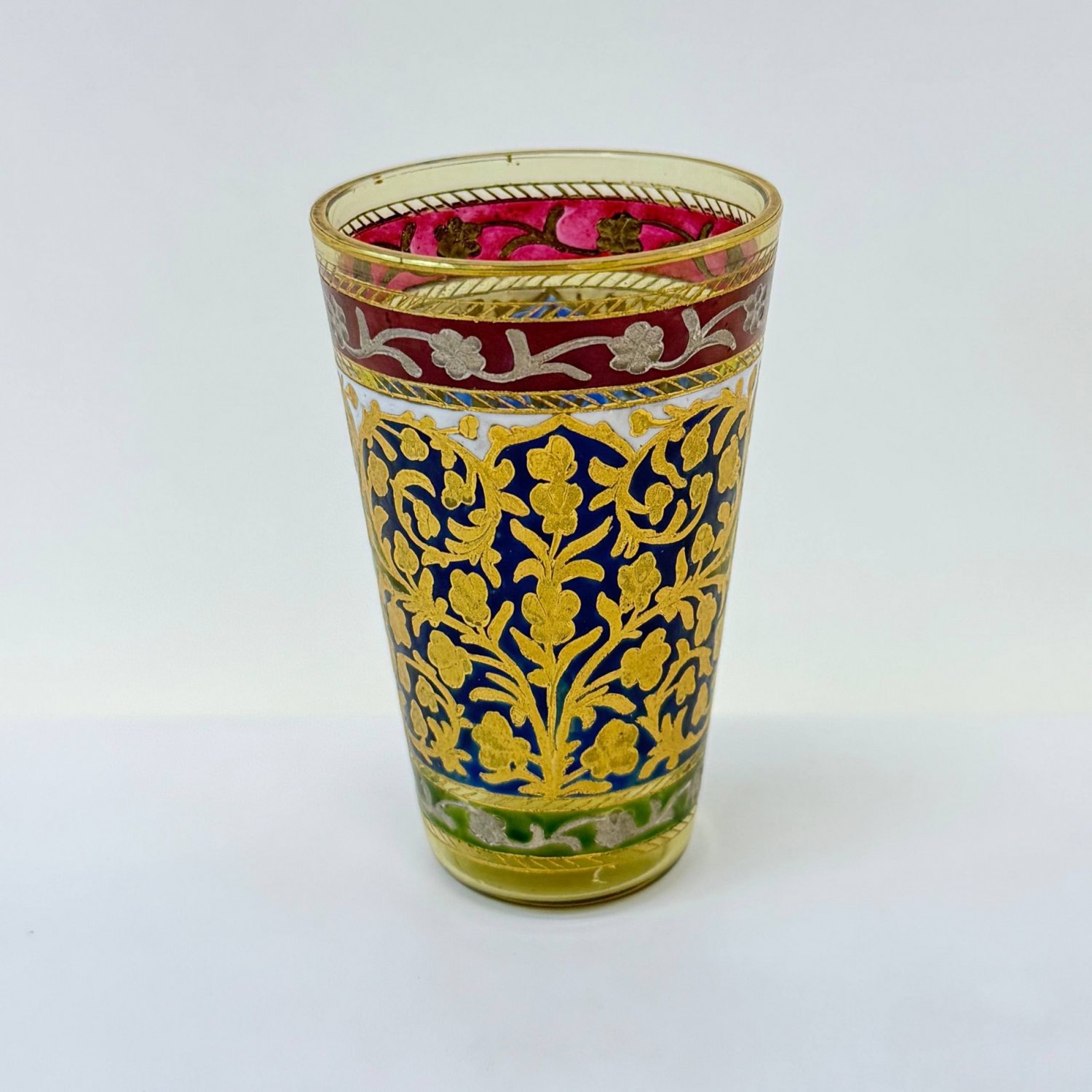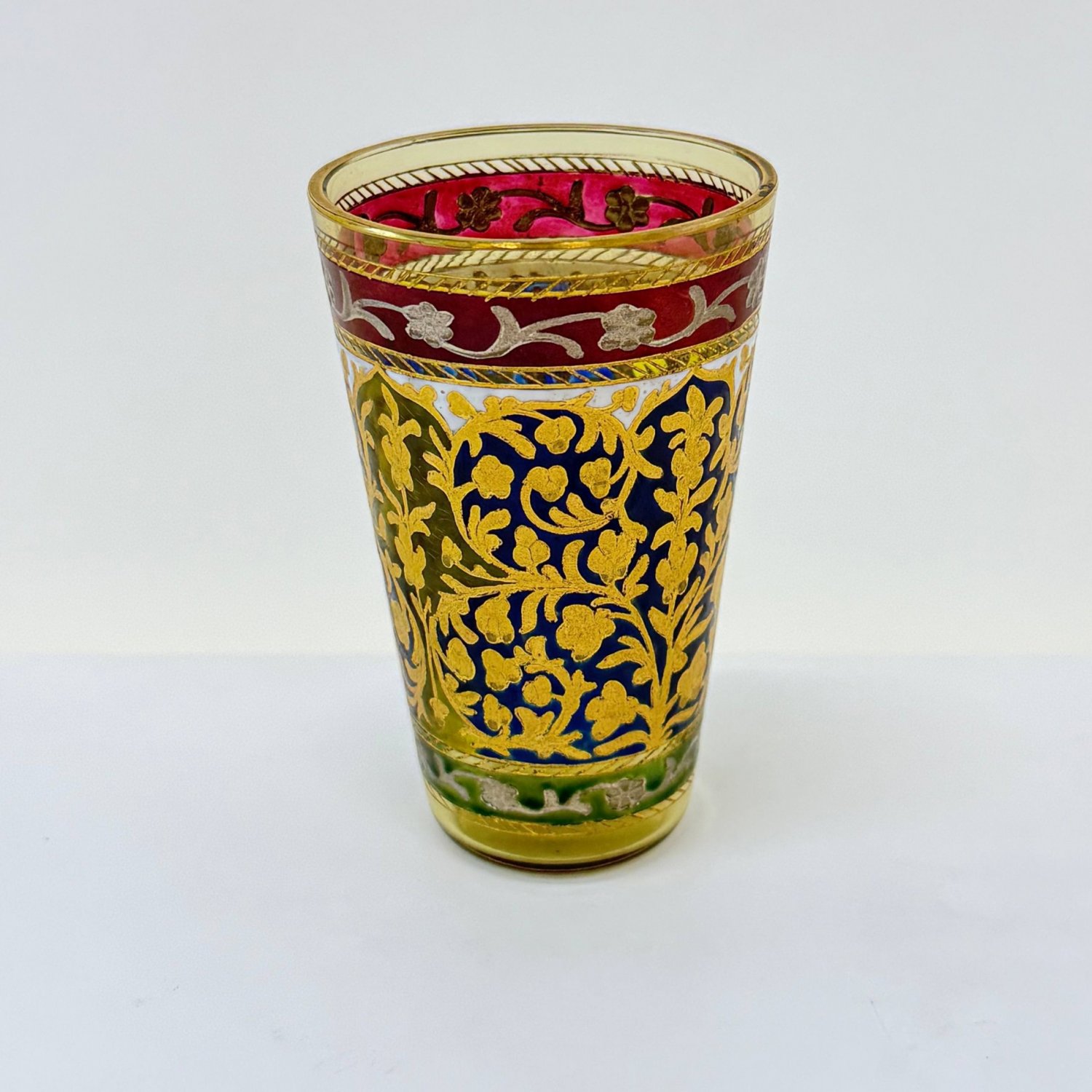Старинный коллекционный небольшой кубок, стекло , Фриц Хеккерт, конец 19 века, Силезия, с обширной сплошной позолотой и геометрической гравировкой с серебряным акцентом на мавританско-арабском основании с однотонной эмалевой основой , созданной из декора «джодхпурского» типа.