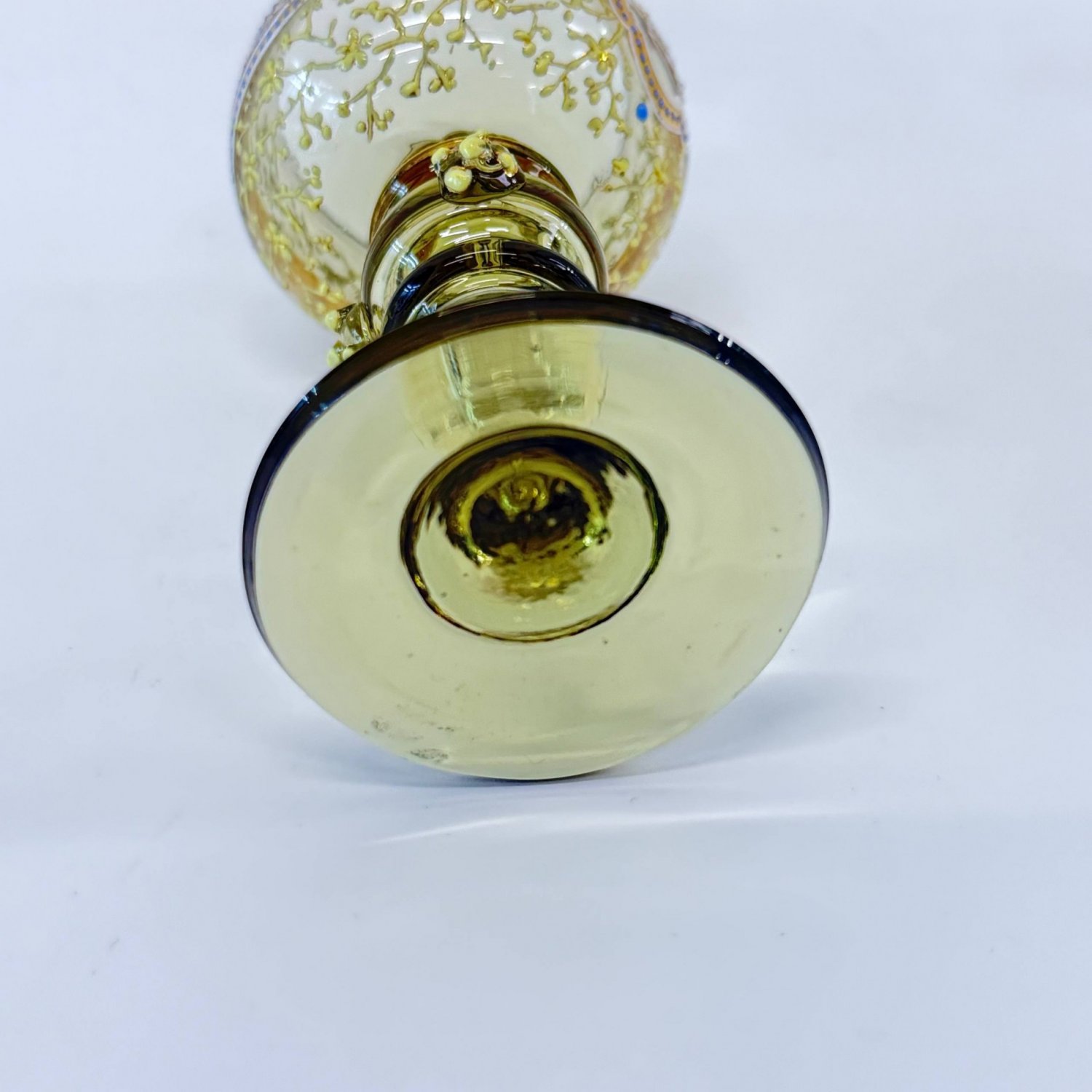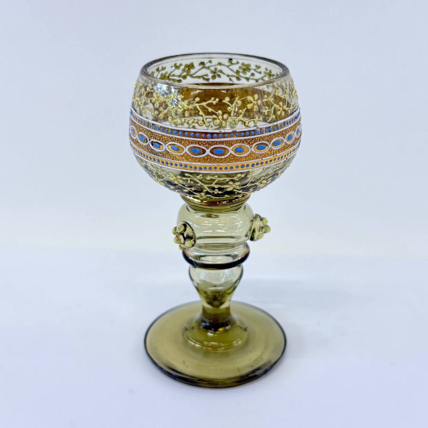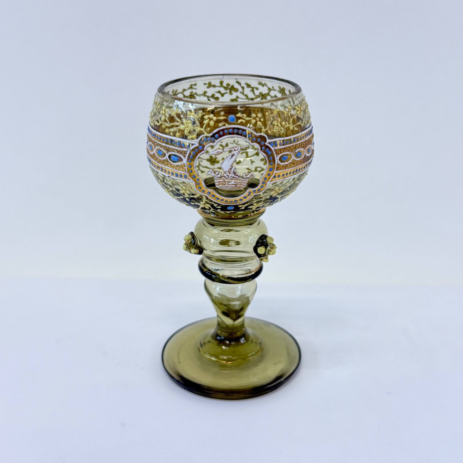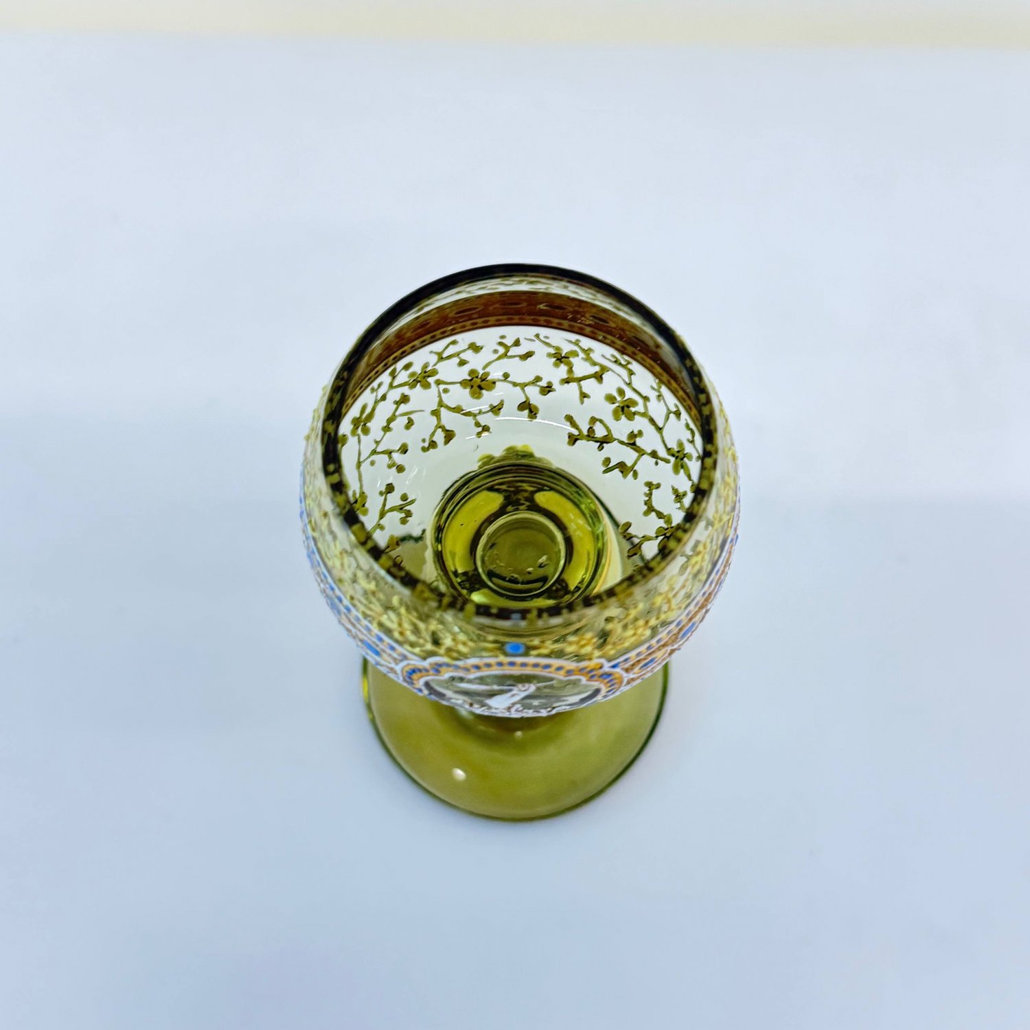 Старинный жёлто-зелёный бокал для ликёра, стекло ,Европа , 1880 гг, в стиле Рёмера с яйцевидной чашей, украшенной лиственной эмалью, в центре которой находится подставка с неизвестным гербом: рука, поднимающая копьё над короной, бокал расписан цветными эмалями , золочение .