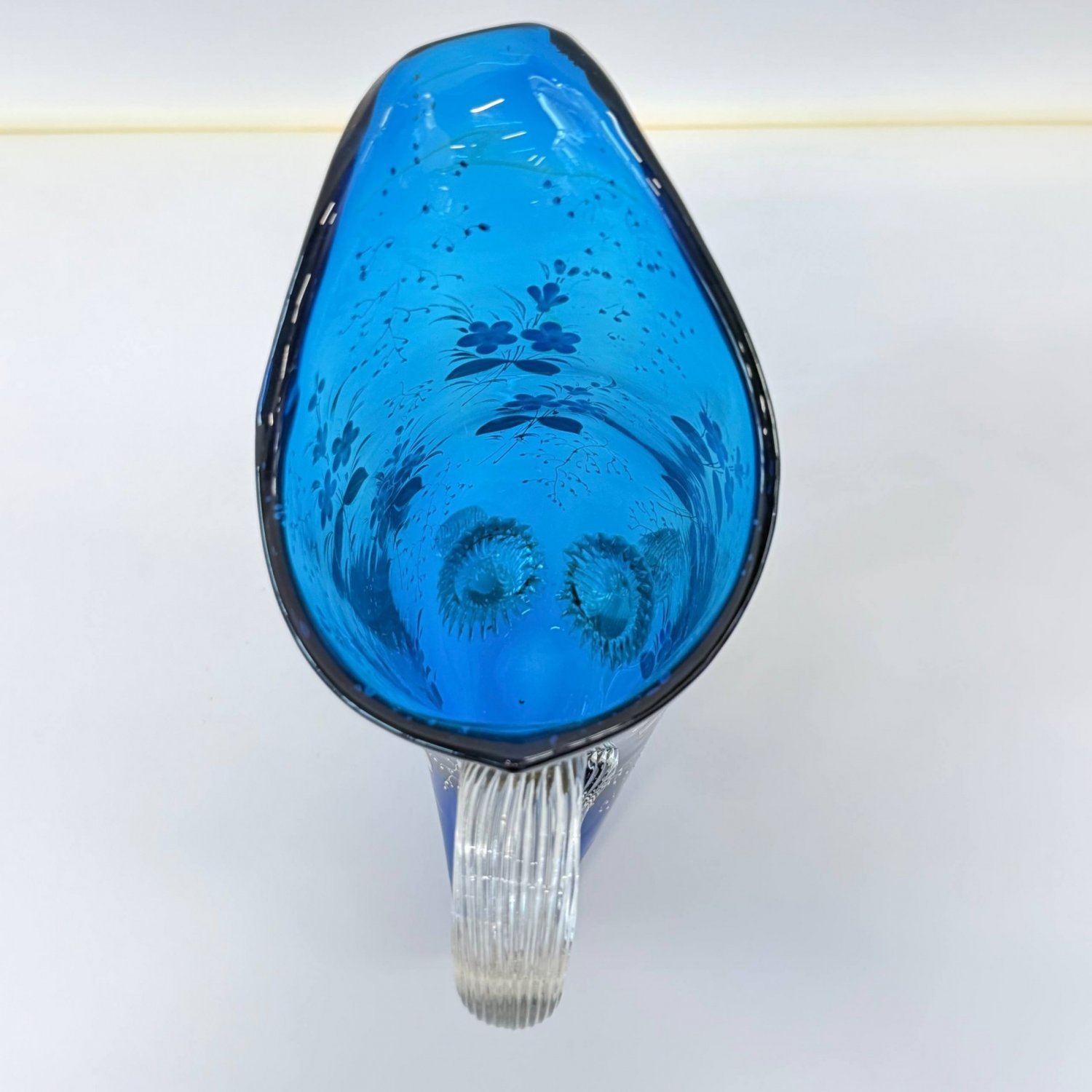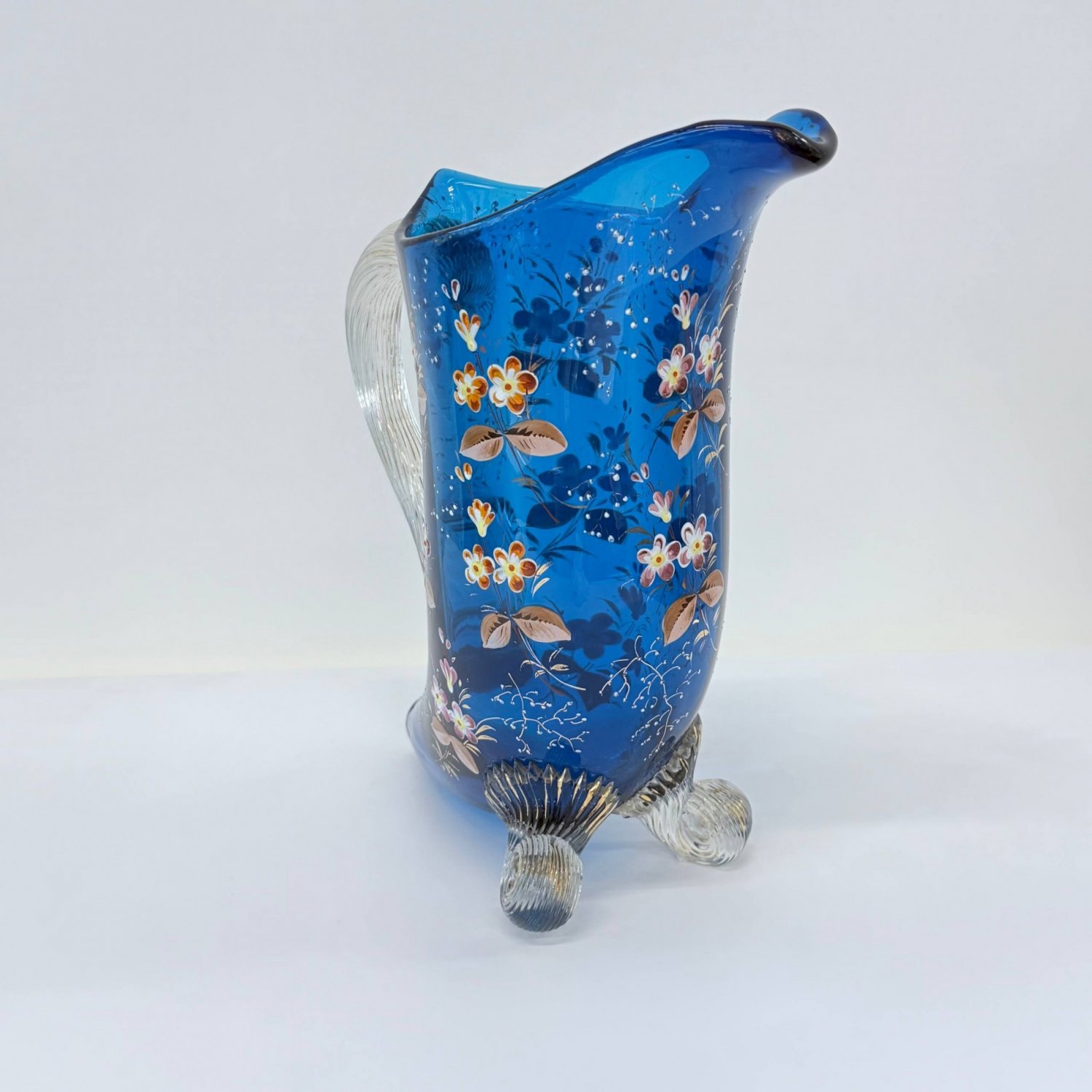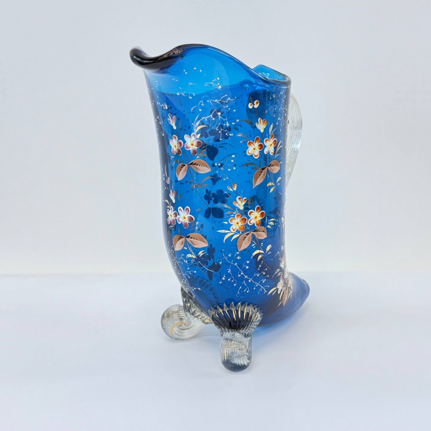 Кувшин для воды синего стекла , Moser , 1880 гг , в форме рога изобилия с цветочным орнаментом, выполненным цветными эмалями , накладной бесцветной ручкой с тростниковым узором и двумя ножками.