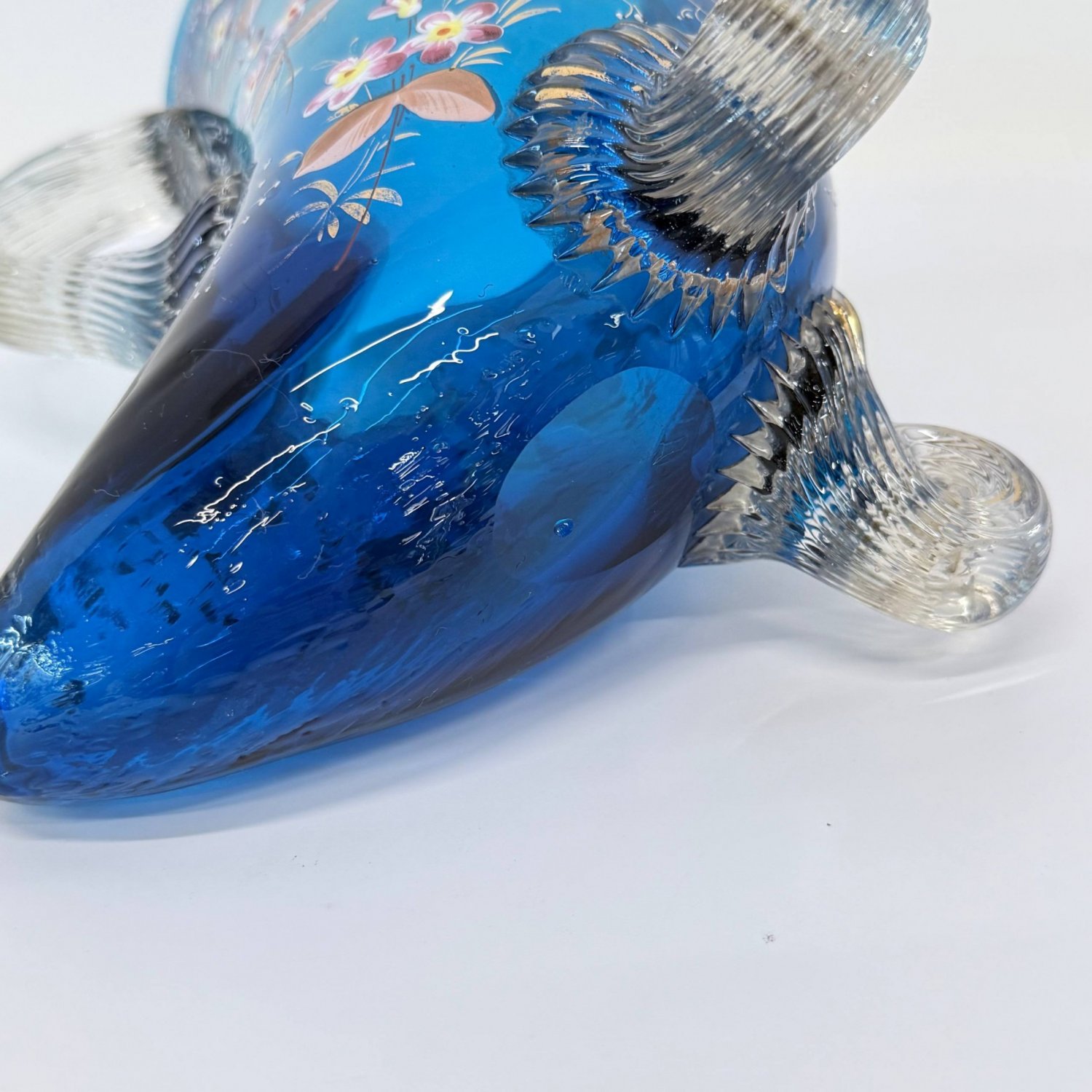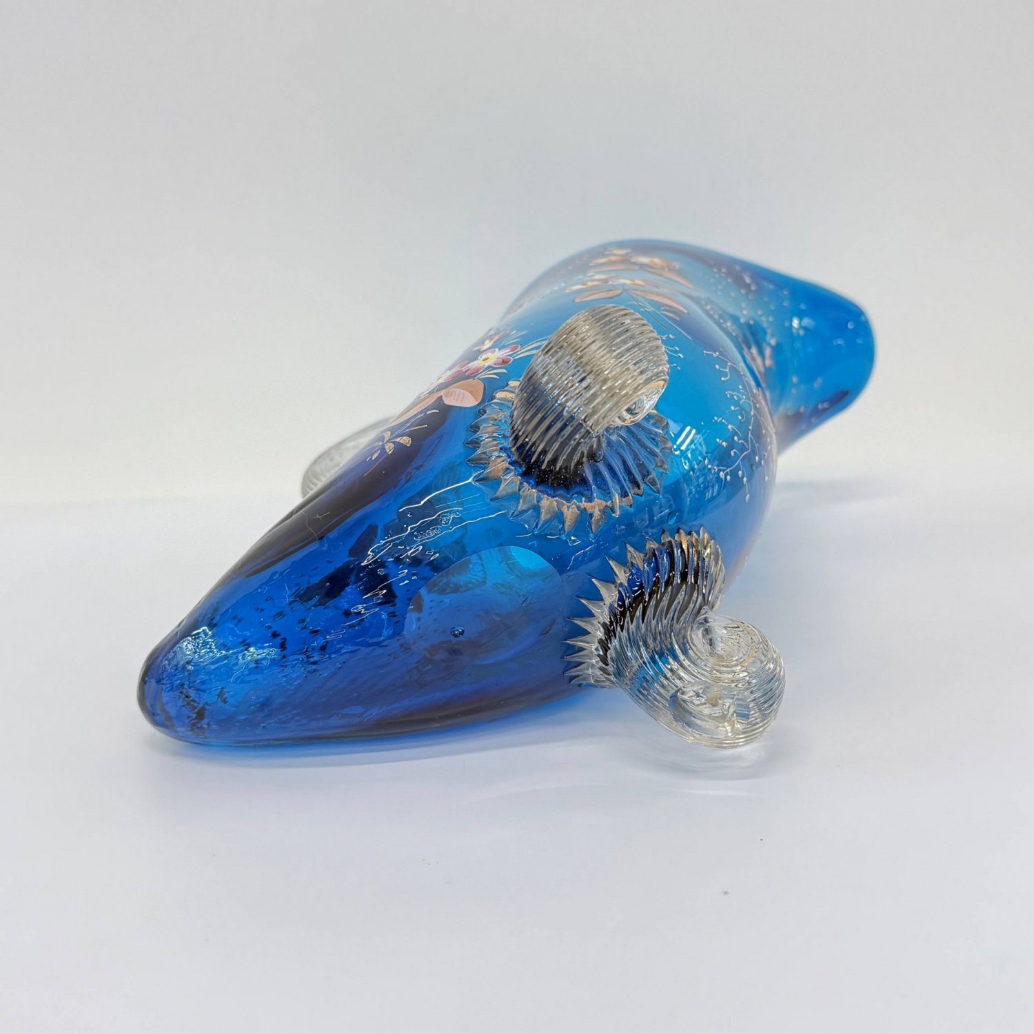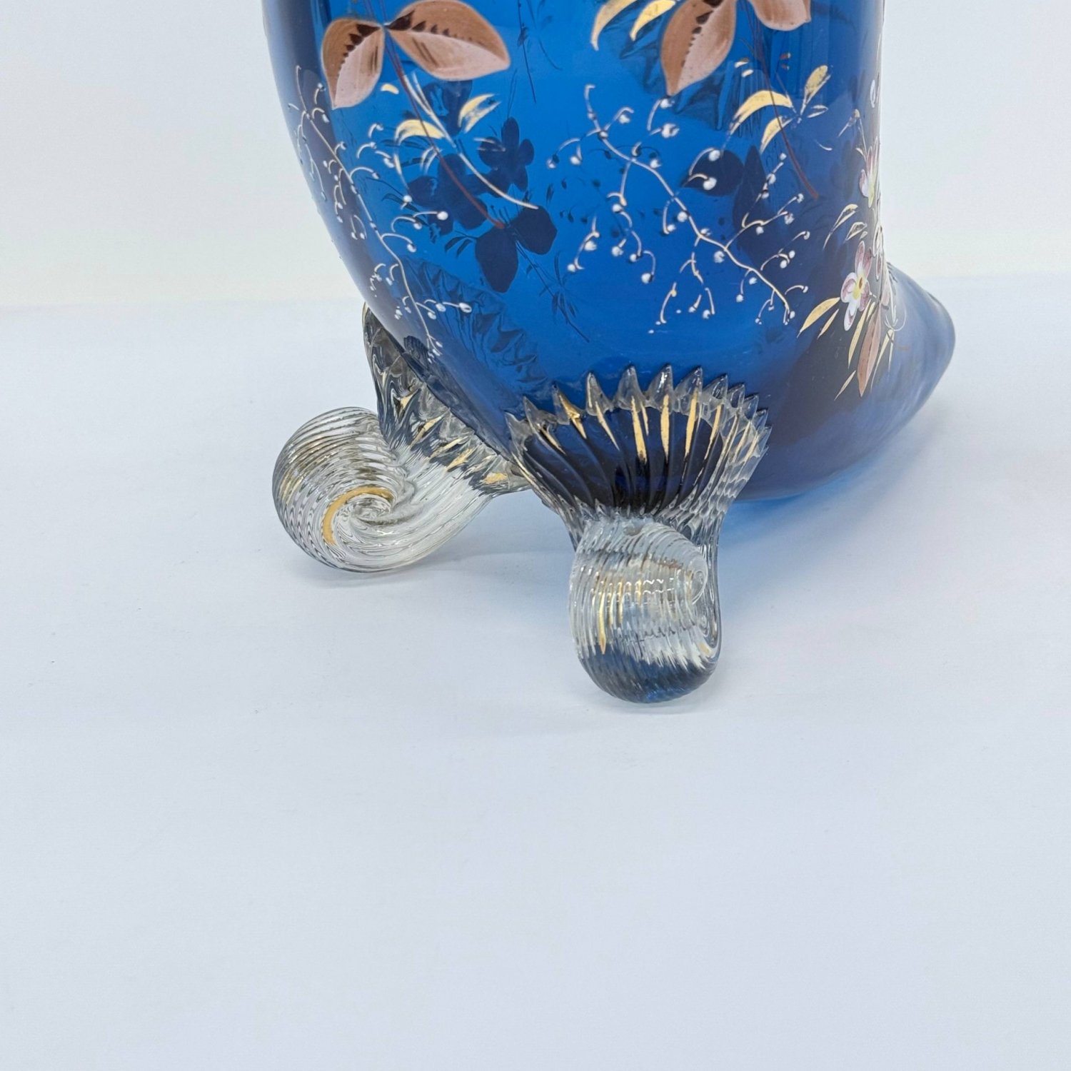 Кувшин для воды синего стекла , Moser , 1880 гг , в форме рога изобилия с цветочным орнаментом, выполненным цветными эмалями , накладной бесцветной ручкой с тростниковым узором и двумя ножками.