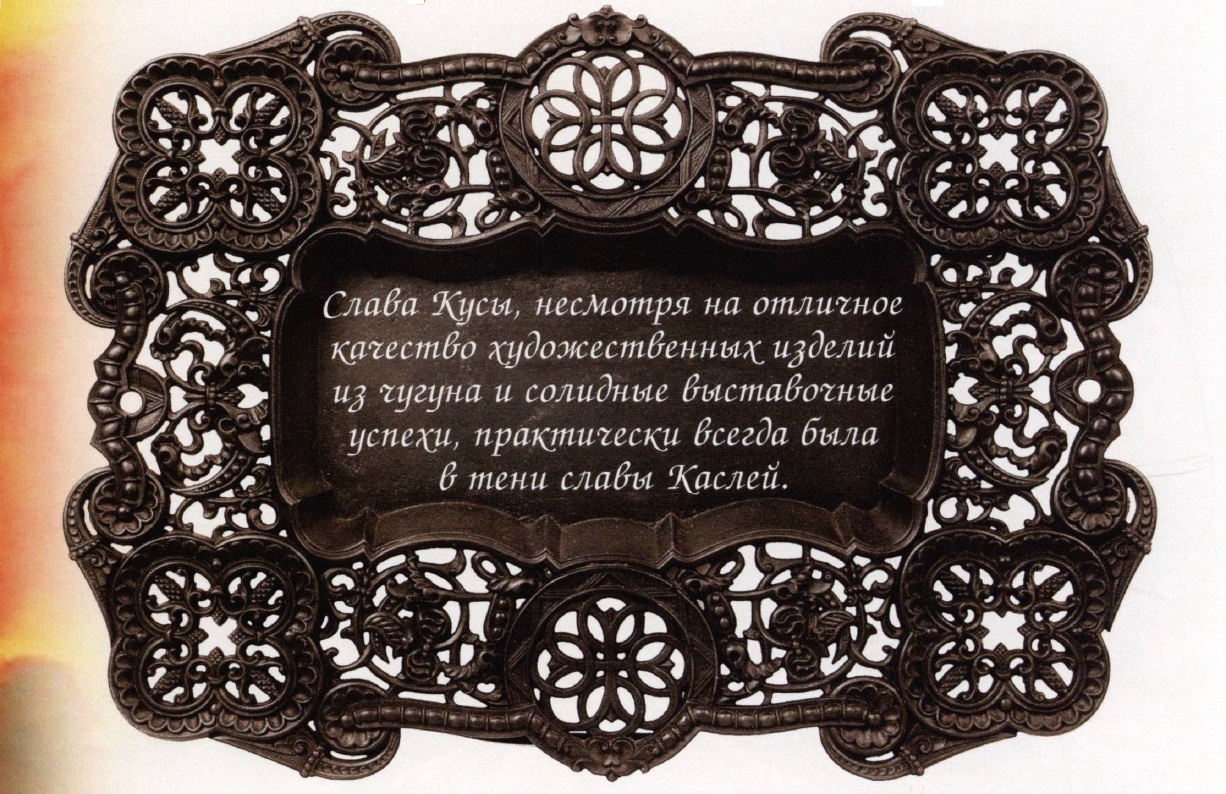 Подлинный расцвет «кабинетного» кусинского литья пришелся на первое десятилетие XX века, а за весь последующий период его истории в ассортименте Кусинского завода появилось лишь несколько интересных произведений. Это и есть главная загадка кусинского сфинкса — почему при столь большом художественном потенциале кусинского художественного литья в начале XX века его слава так и не вышла из тени славы Каслей.