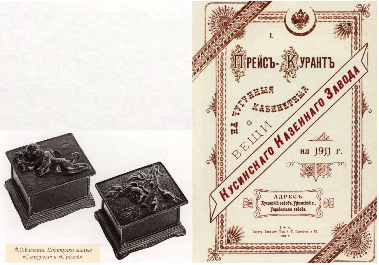 В XX веке было принято сравнивать экономическое положение СССР с наиболее успешным для экономики России дореволюционным 1913 годом. В истории развития кусинского художественного литья этот год стал недосягаемой «вершиной» успешного производства разнообразных изделий из чугуна. «Прейскурант на чугунные кабинетные вещи Кусинского казенного завода на 1913 год» предлагал покупателям 423 наименования отливок.