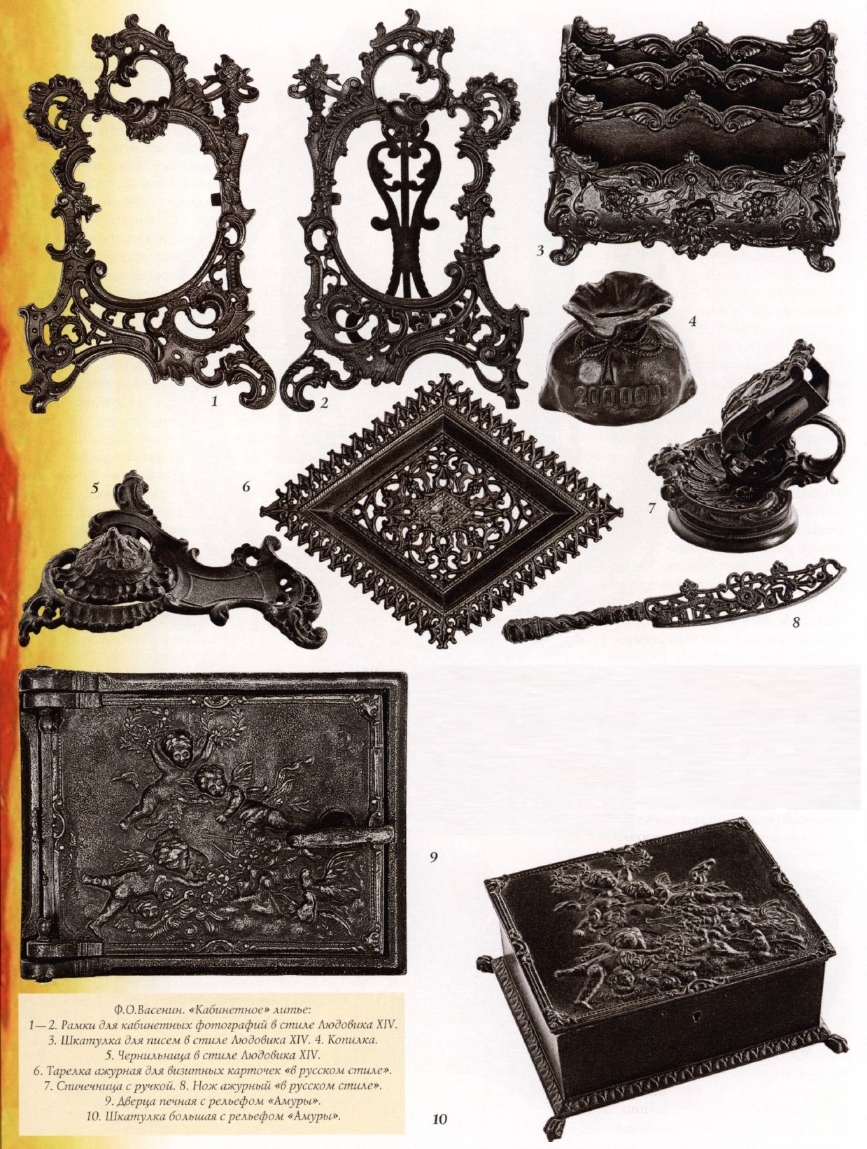 Для 22 каталожных отливок оригинальные авторские модели выполнил заводской скульптор и рисовальщик Федор Осипович Васенин (1876—1923). Сын рабочего Златоустовского завода, талантливый рисовальщик, он после окончания реального училища был направлен стипендиатом Златоустовского горного округа на учебу в Москву, в Центральное Строгановское училище технического рисования (1893— 1898). Окончив учебу, Ф.О.Васенин вернулся в Златоуст, с 1899 года и до конца жизни работал на Кусинском чугунолитейном заводе старшим мастером цеха художественного литья. В круг его прямых обязанностей входило изготовление авторских моделей для «кабинетного» литья. Его декоративные вазы, тарелки, статуэтки, шкатулки, пепельницы, пресс-папье, чернильницы и другие изделия были особенно популярными, пользовались широким спросом по всей России. Некоторые его авторские отливки тиражировались на заводе вплоть до начала XXI века. Помимо основной работы Ф.О.Васенин с 1900 года периодически участвовал в «составлении рисунков для украшения холодного оружия», исполнял важные и срочные заказы Златоустовской оружейной фабрики.