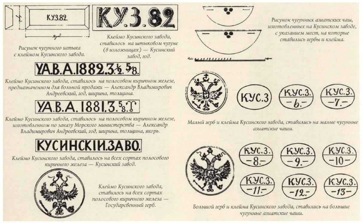 В октябре 1882 года Главный начальник Уральских горных заводов И.П.Иванов получил указание директора Горного департамента Н.А.Кулибина: «...сделать распоряжение, чтобы все частные и казенные горные заводы Уральской горной области доставили в возможно непродолжительном времени рисунки (с показанием их масштаба) клейм, которые они ставят на своих произведениях, как то: на чугуне в штыках, на отливках из него, на железе разных сортов, стали, штыковой и листовой меди и пр.». И.П.Иванов разослал соответствующее распоряжение во все горные округа, находившиеся в его подчинении. Заводы присылали рисунки своих клейм в двух экземплярах, один из которых департамент отсылал в Санкт-Петербург, другой оставался на Урале. В 2004 году в Екатеринбурге историки Н.С.Корепанов и Е.Ю.Рукосоев издали монографию «Клейма уральских заводов XVII — XIX вв.» и ввели в научный оборот обширные архивные материалы по сфрагистике — вспомогательной исторической дисциплине, изучающей печати, штампы и другие виды оттисков. Там среди опубликованных на страницах 45—47 кусинских заводских клейм под номерами 2.16. и 2.17. дается рисунок чугунного штыка с клеймом Кусинского завода, которое ставилось на штыковом чугуне (в изложницах) — «Ку.3.82.» (Кусинский завод, год).